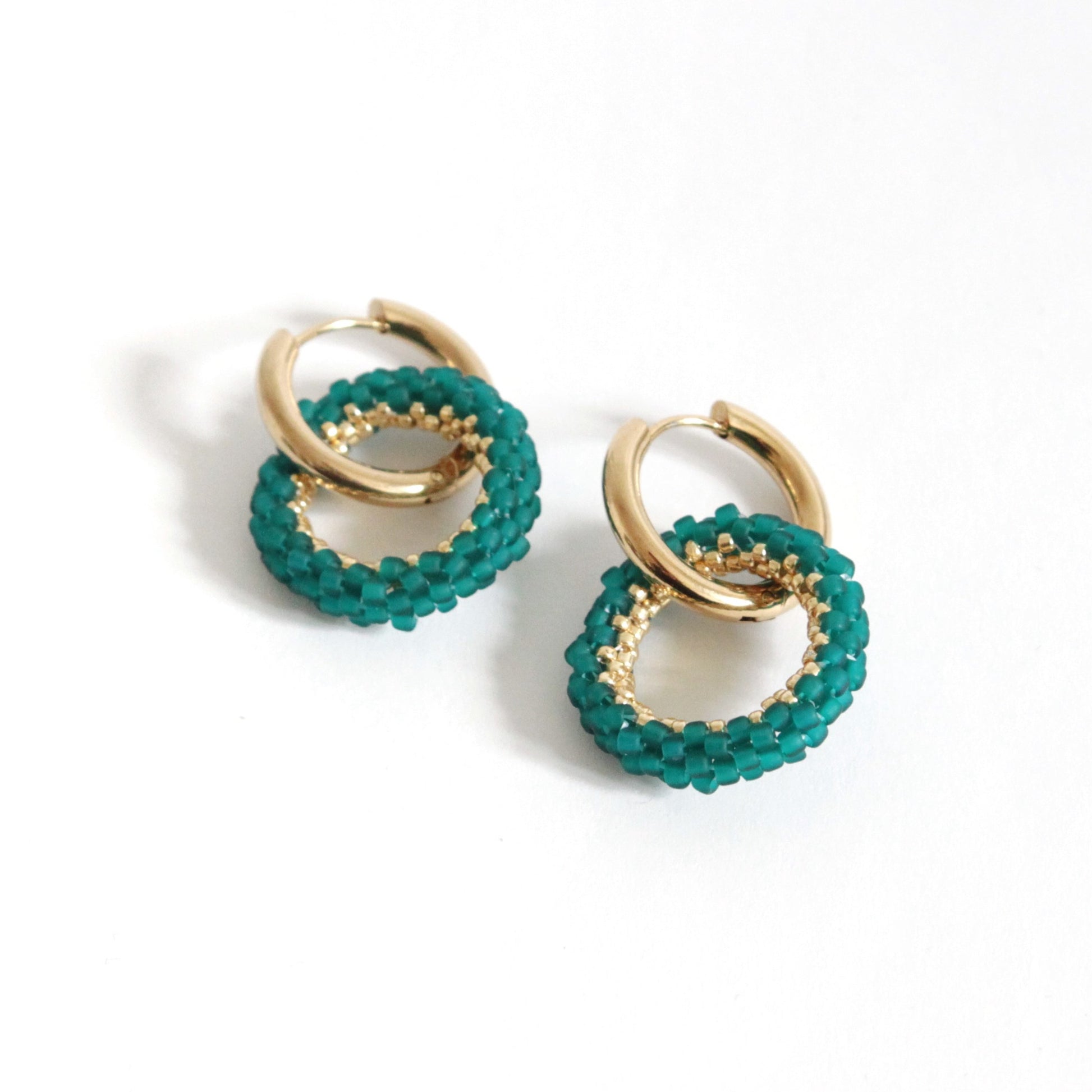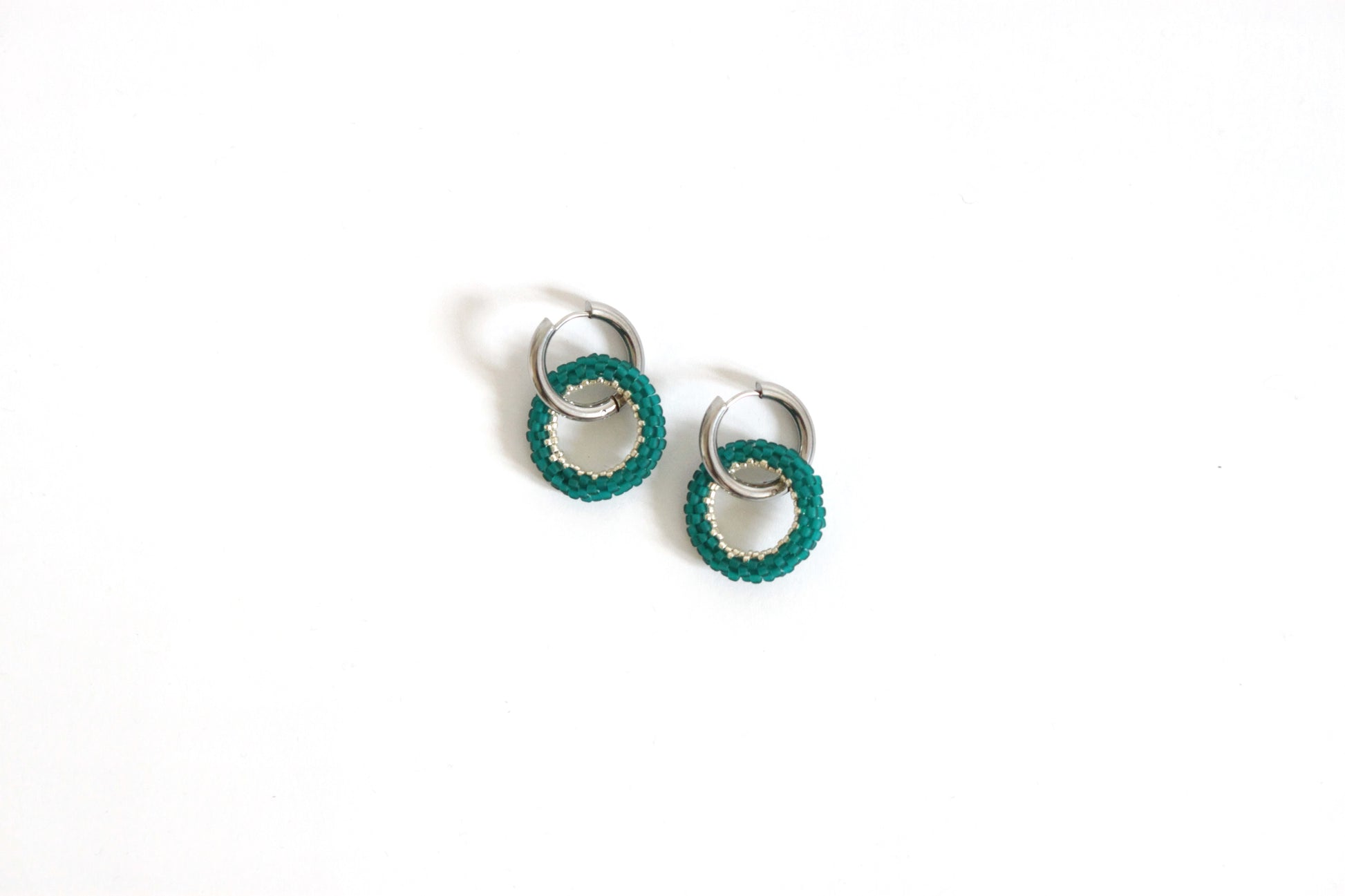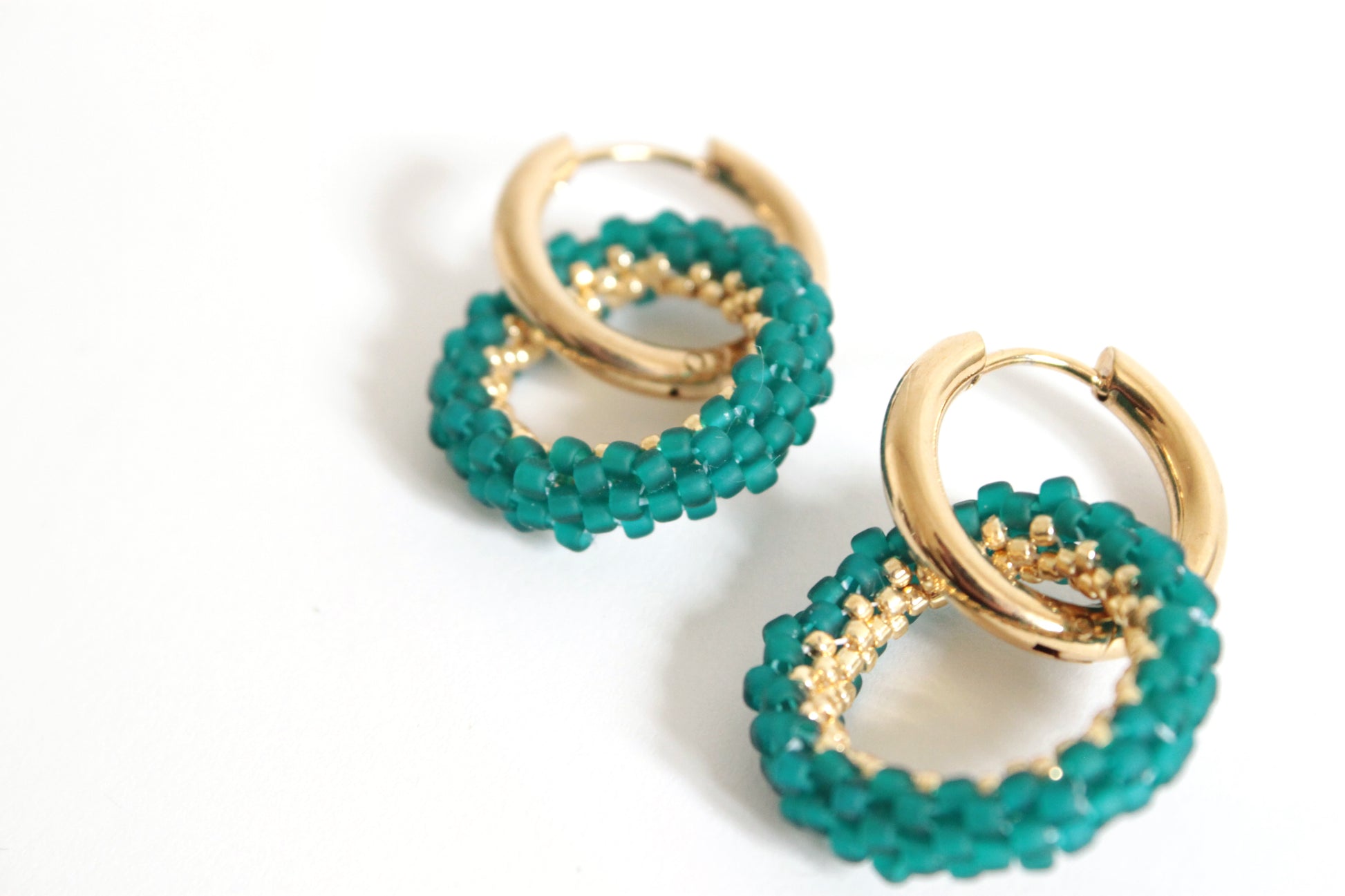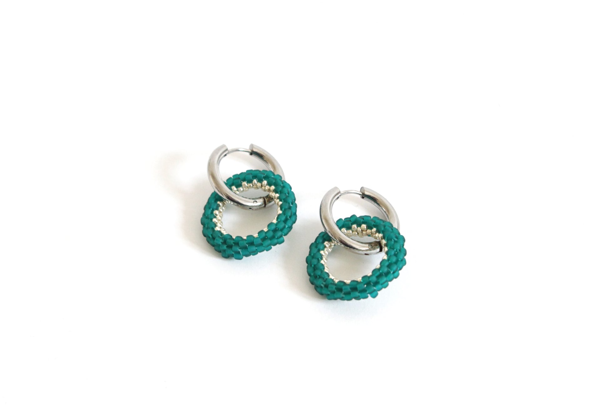 Orecchini realizzati con cerchietti in metallo argentato o dorato nikel free da 20mm intrecciati a cerchi tridimensionali da 25mm in tessitura di perline giapponesi opache nei toni petrolio.
