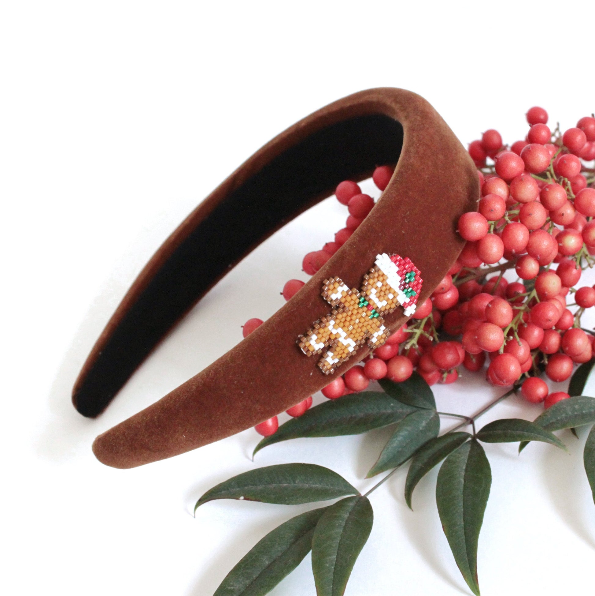 Cerchietto di velluto marrone leggermente bombato con decorazione Omino di Pan di Zenzero in tessitura di perline. Morbidi ma sostenuti, i cerchietti Lenor sono perfetti per impreziosire il tuo look delle feste, taglia adatta per adulti e bambine.