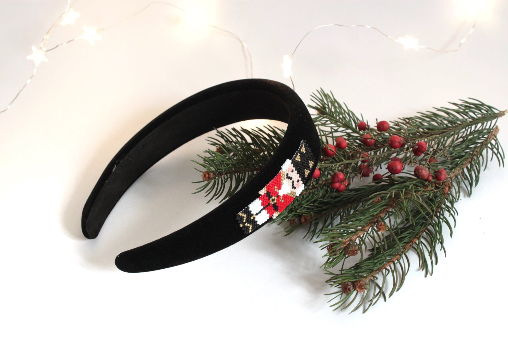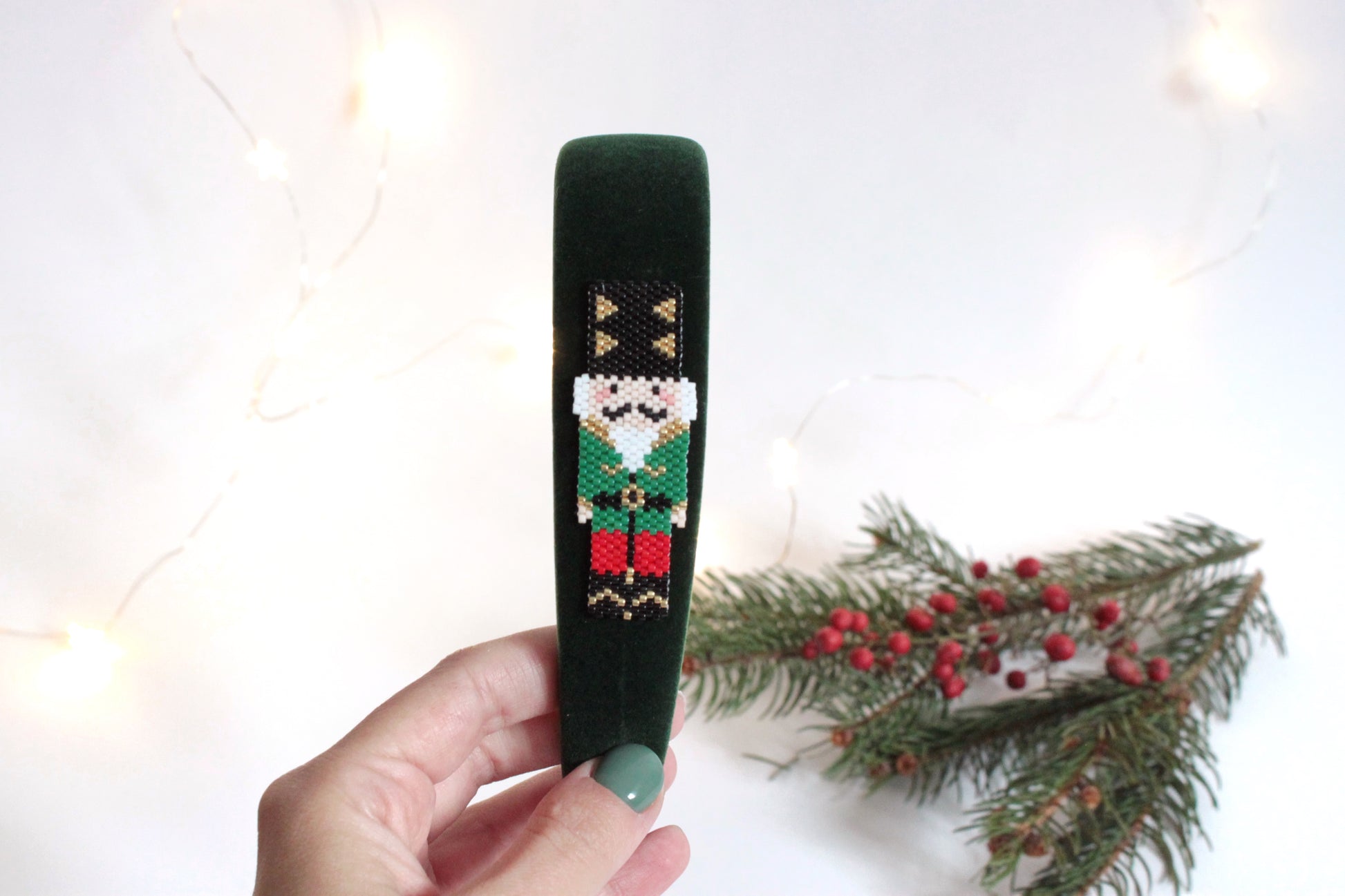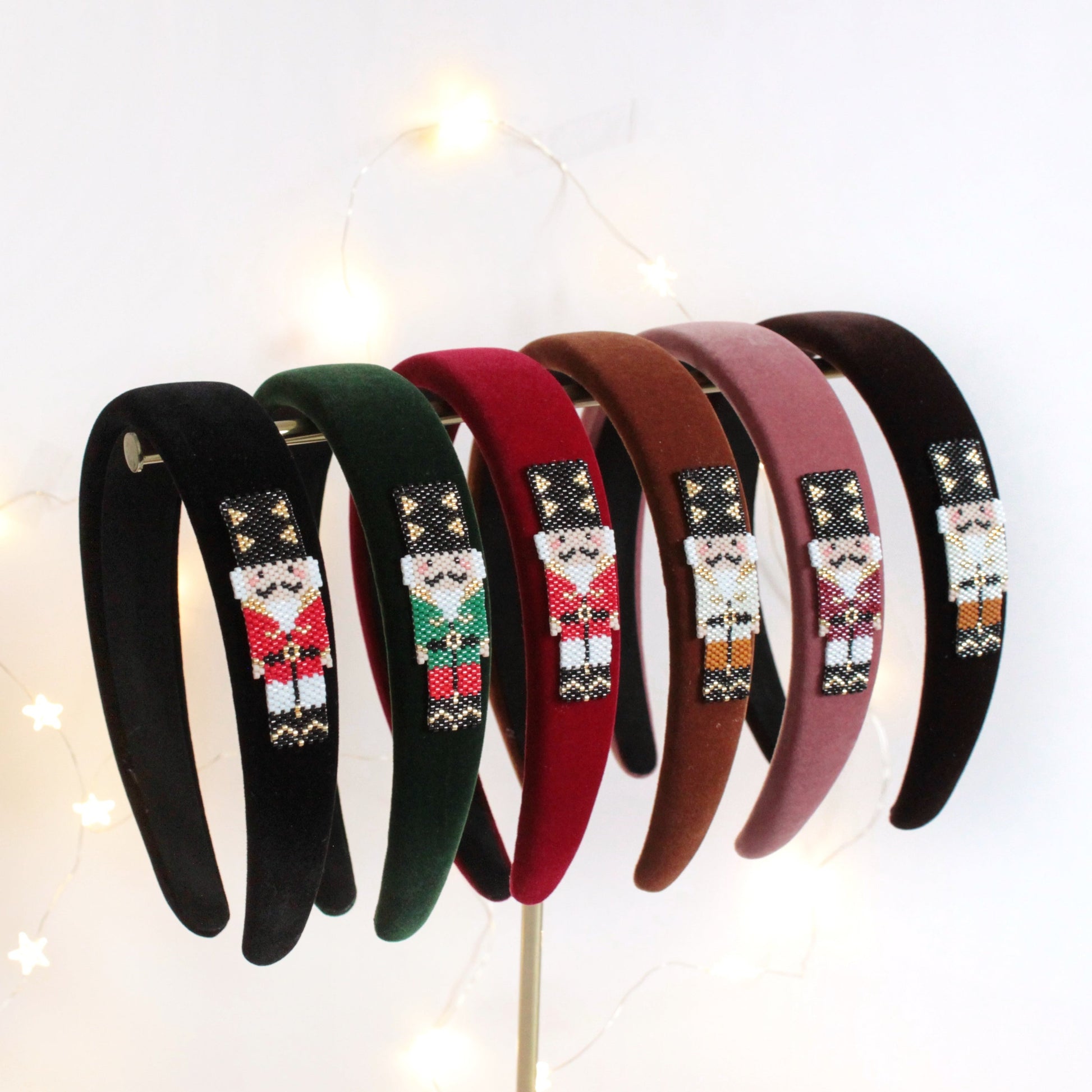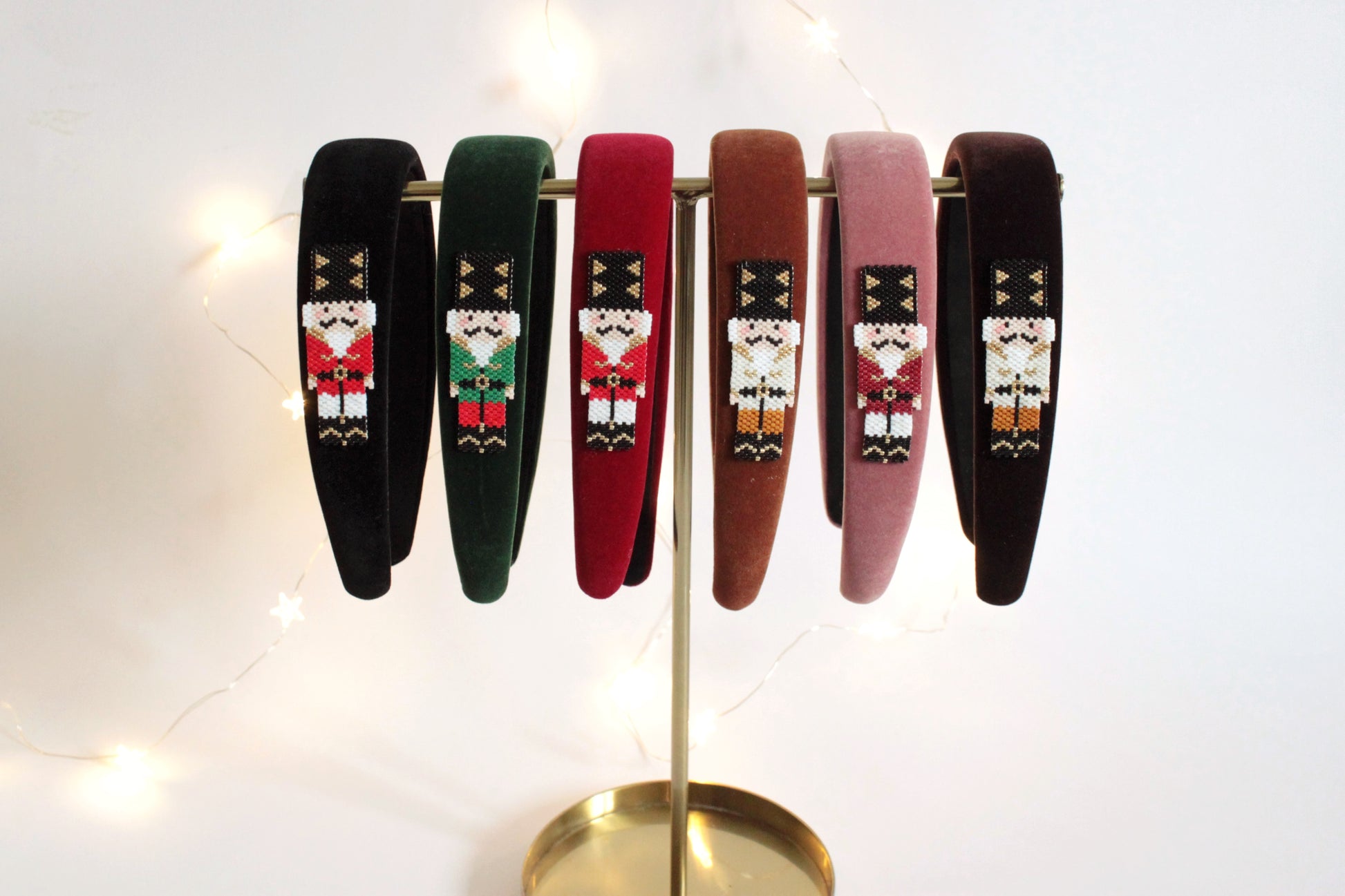 Cerchietti di velluto leggermente bombati con decorazione Schiaccianoci in tessitura di perline con dettagli oro. Morbidi ma sostenuti, sono perfetti per impreziosire il tuo look delle feste, taglia adatta per adulti e bambine.
