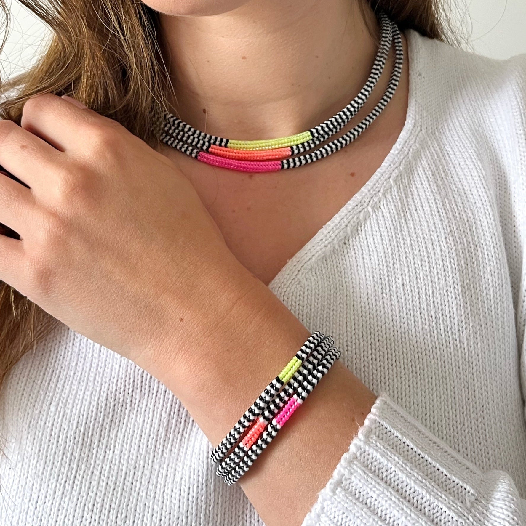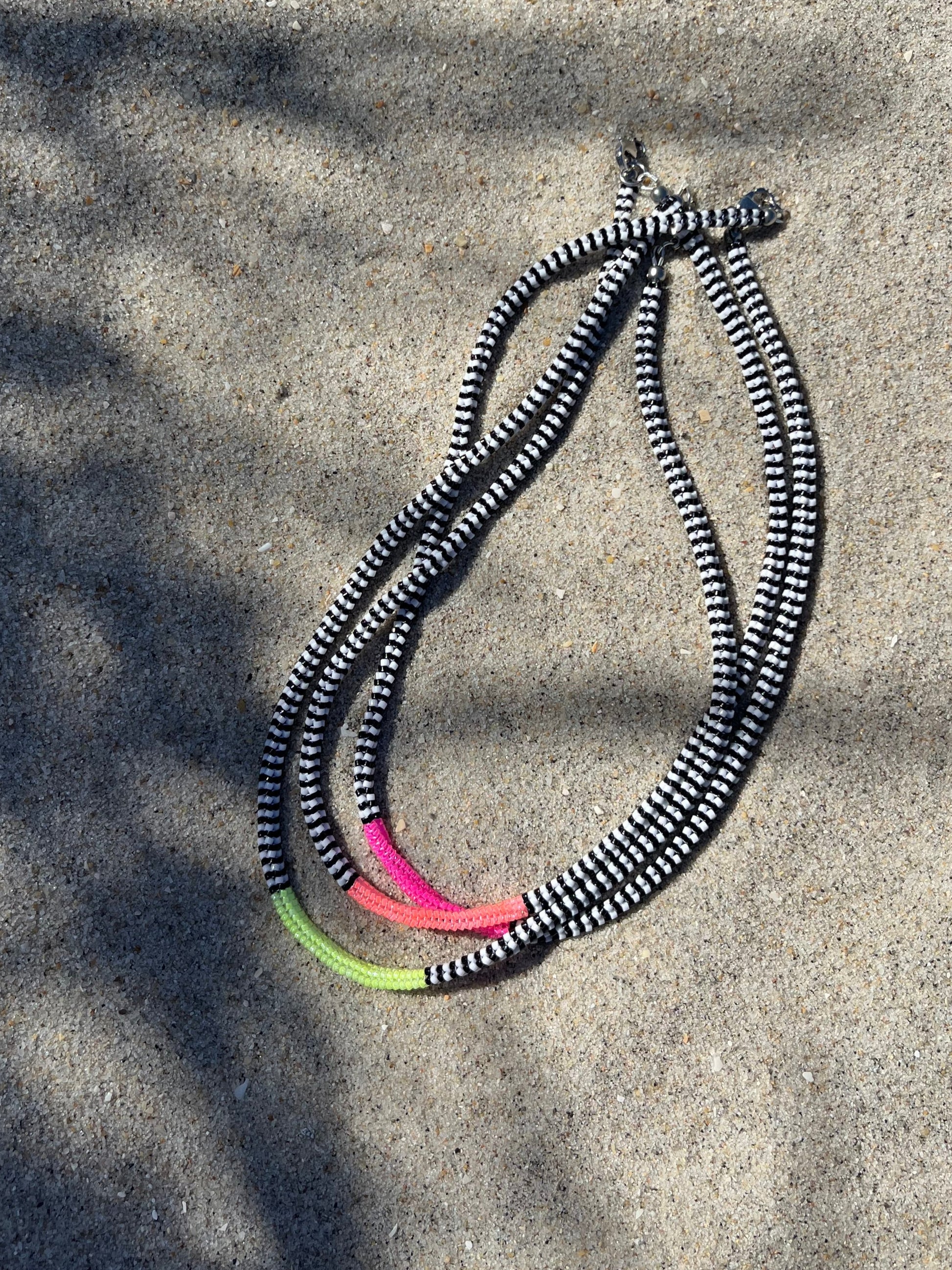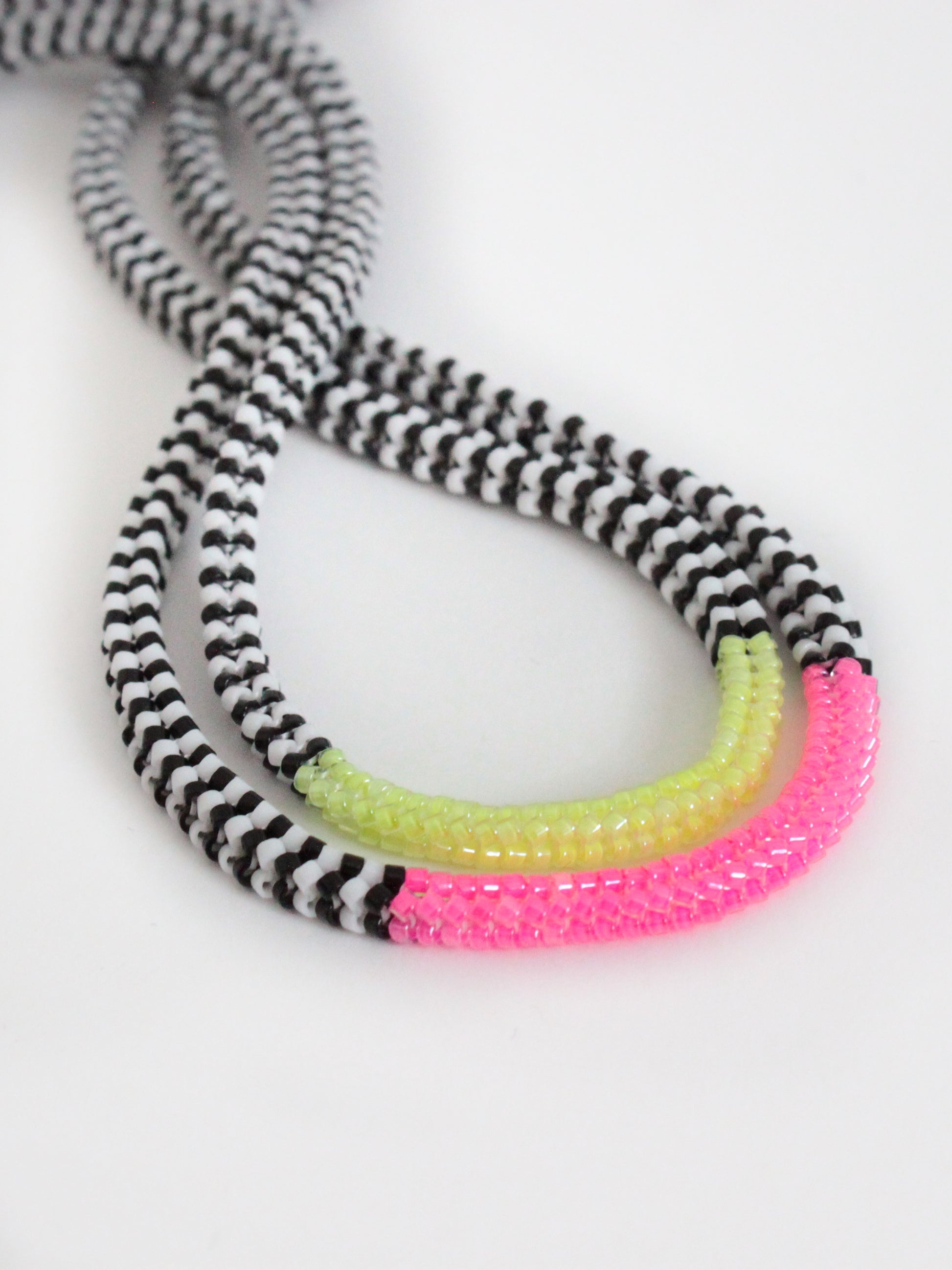 Collane e bracciali realizzati con tubolare in perline giapponesi cucite a mano in tonalità bianco e nero, con inserito di perline colorate fluo.