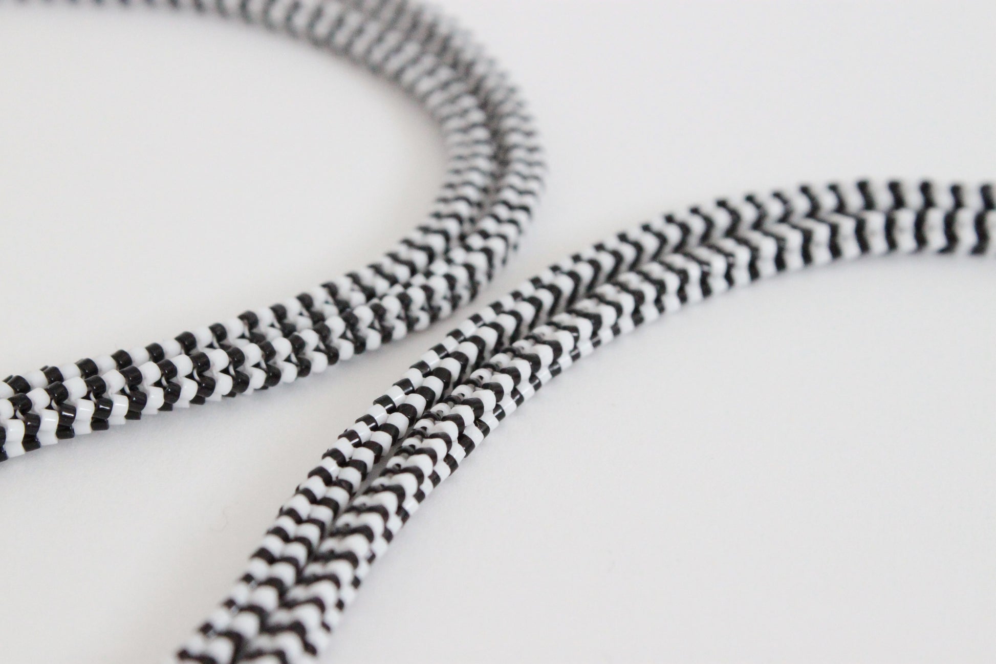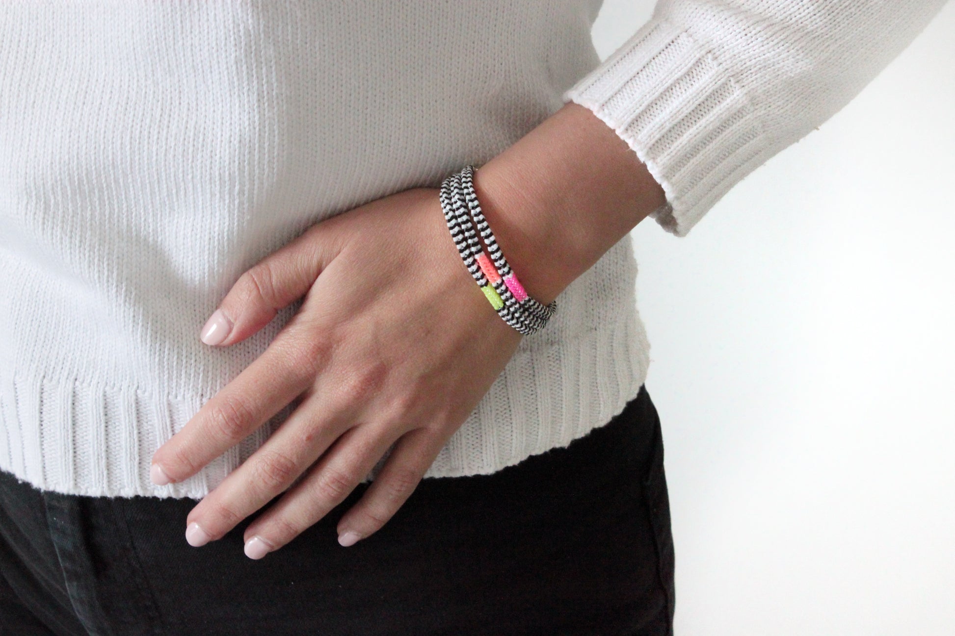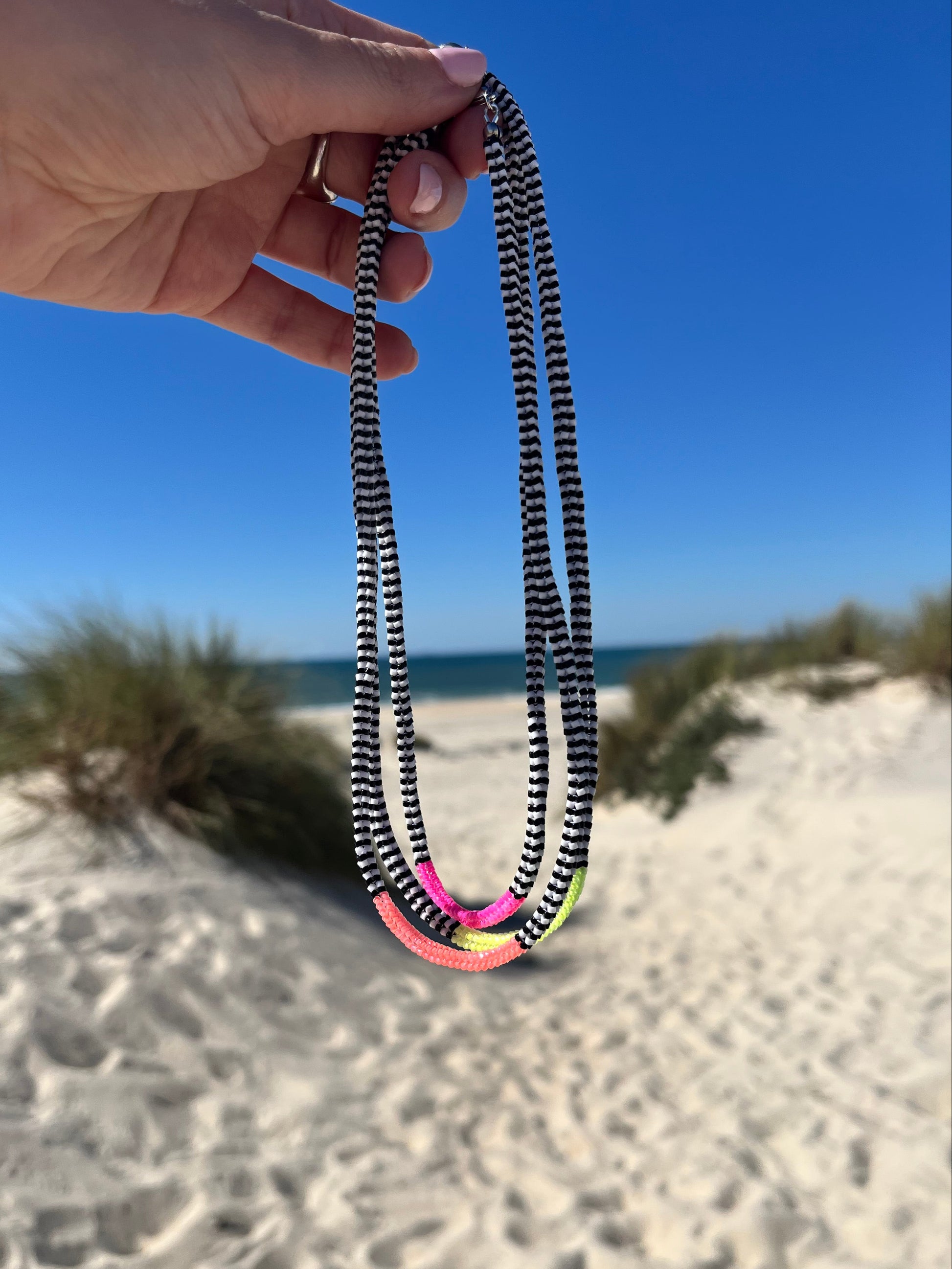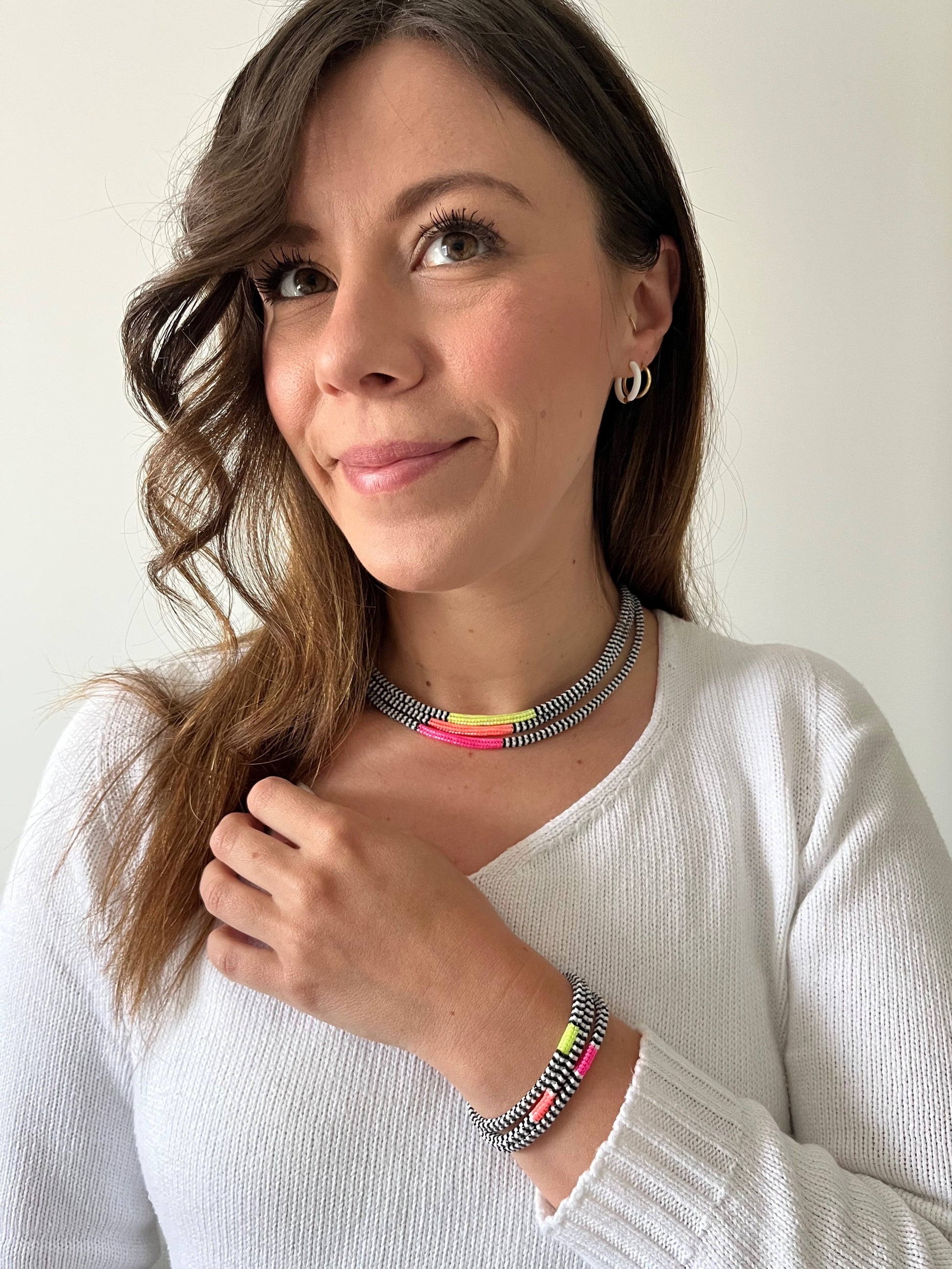 Collane e bracciali realizzati con tubolare in perline giapponesi cucite a mano in tonalità bianco e nero, con inserito di perline colorate fluo.