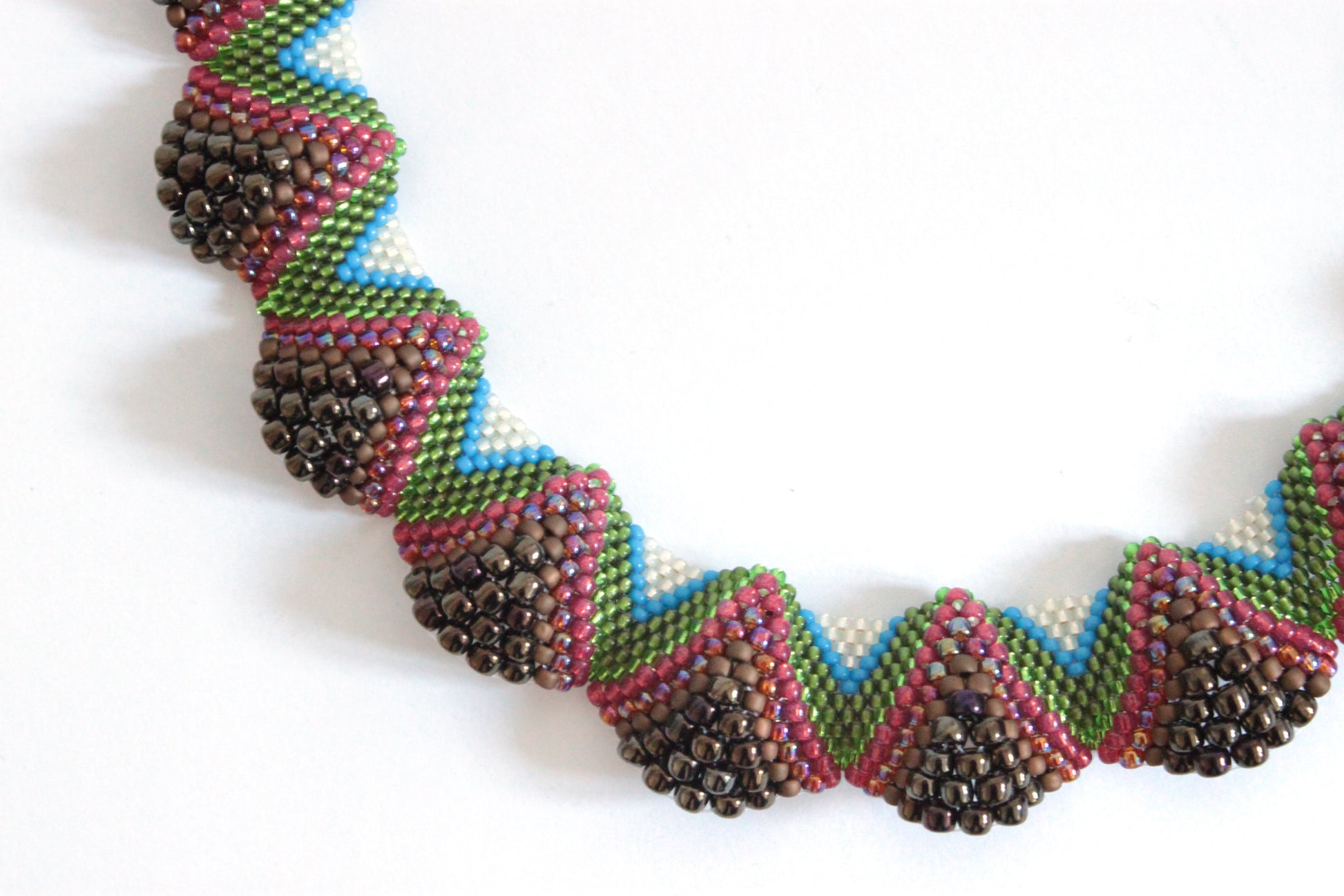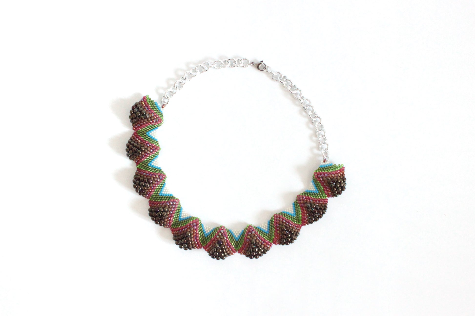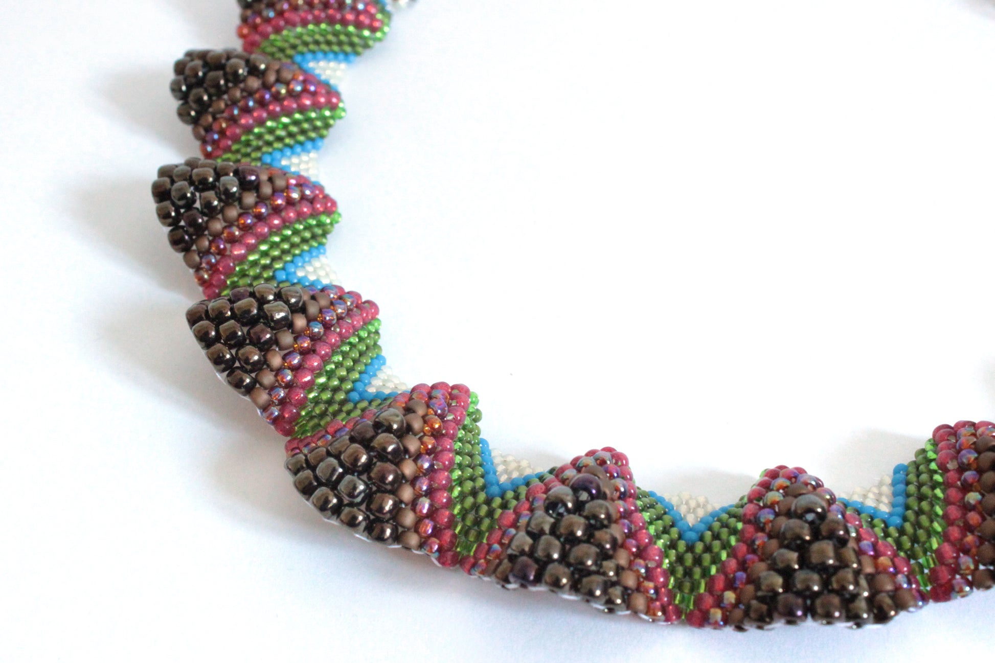 Realizzata in tessitura di perline giapponesi Toho di varie misure che, cucendole una ad una in posizioni predefinite, vanno a creare onde morbide. La collana è girocollo con catena zigrinata e chiusura a moschettone nikel free.