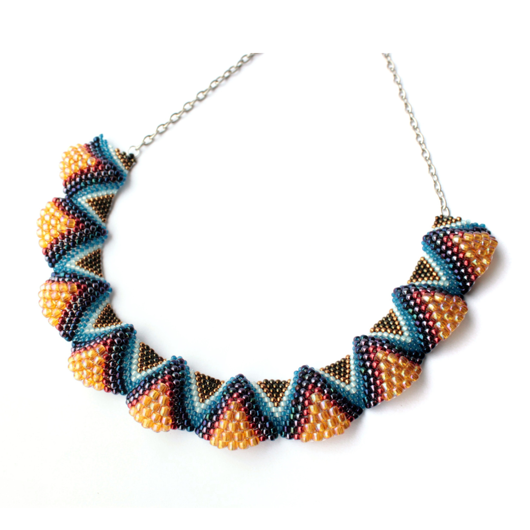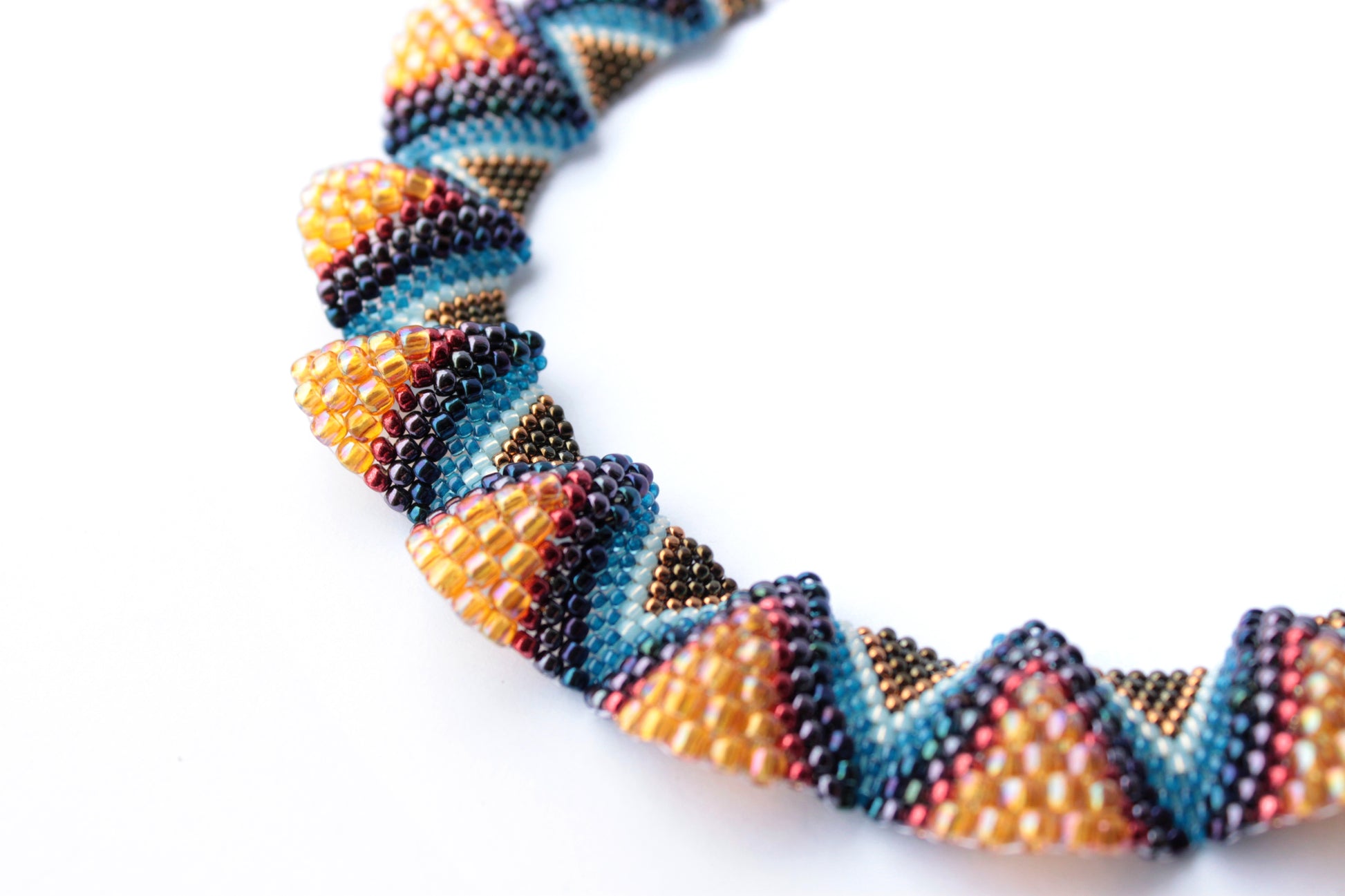 Realizzata in tessitura di perline giapponesi Toho di varie misure che, cucendole una ad una in posizioni predefinite, vanno a creare onde morbide. La collana è girocollo con catena zigrinata (differente da questa in foto) e chiusura a moschettone nikel free.