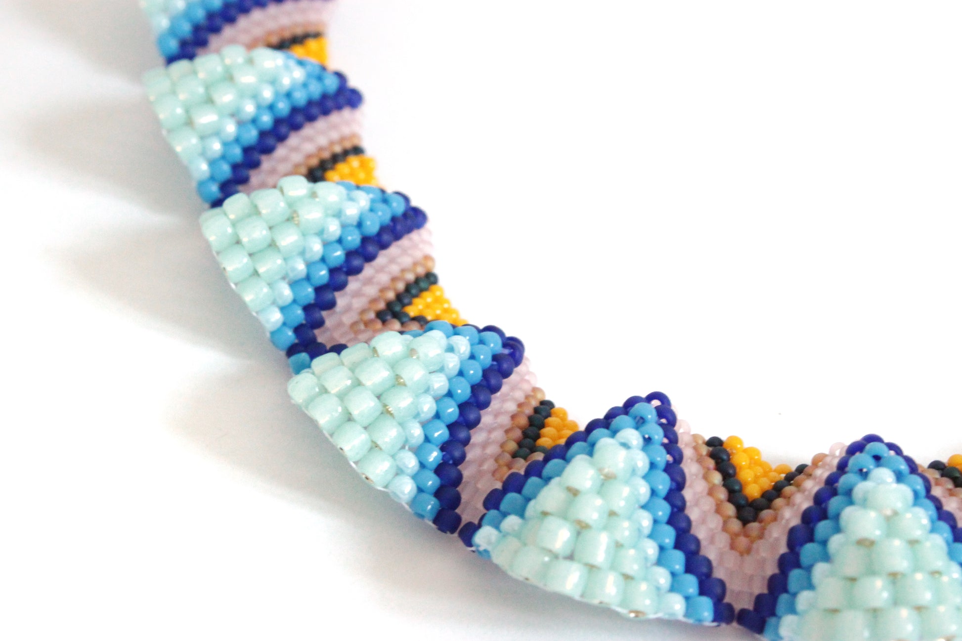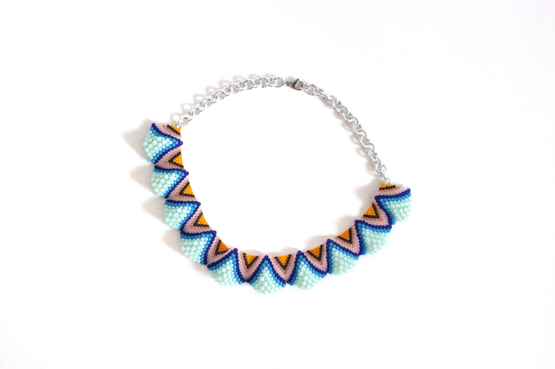 Realizzata in tessitura di perline giapponesi Toho di varie misure che, cucendole una ad una in posizioni predefinite, vanno a creare onde morbide. La collana è girocollo con catena zigrinata e chiusura a moschettone nikel free.