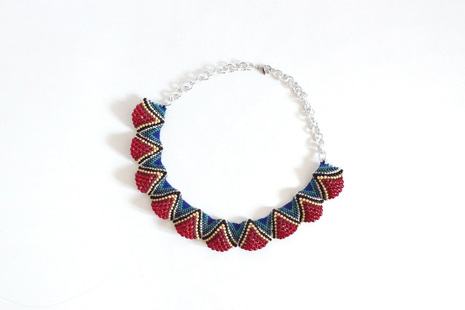 Realizzata in tessitura di perline giapponesi Toho di varie misure che, cucendole una ad una in posizioni predefinite, vanno a creare onde morbide. La collana è girocollo con catena zigrinata e chiusura a moschettone nikel free.