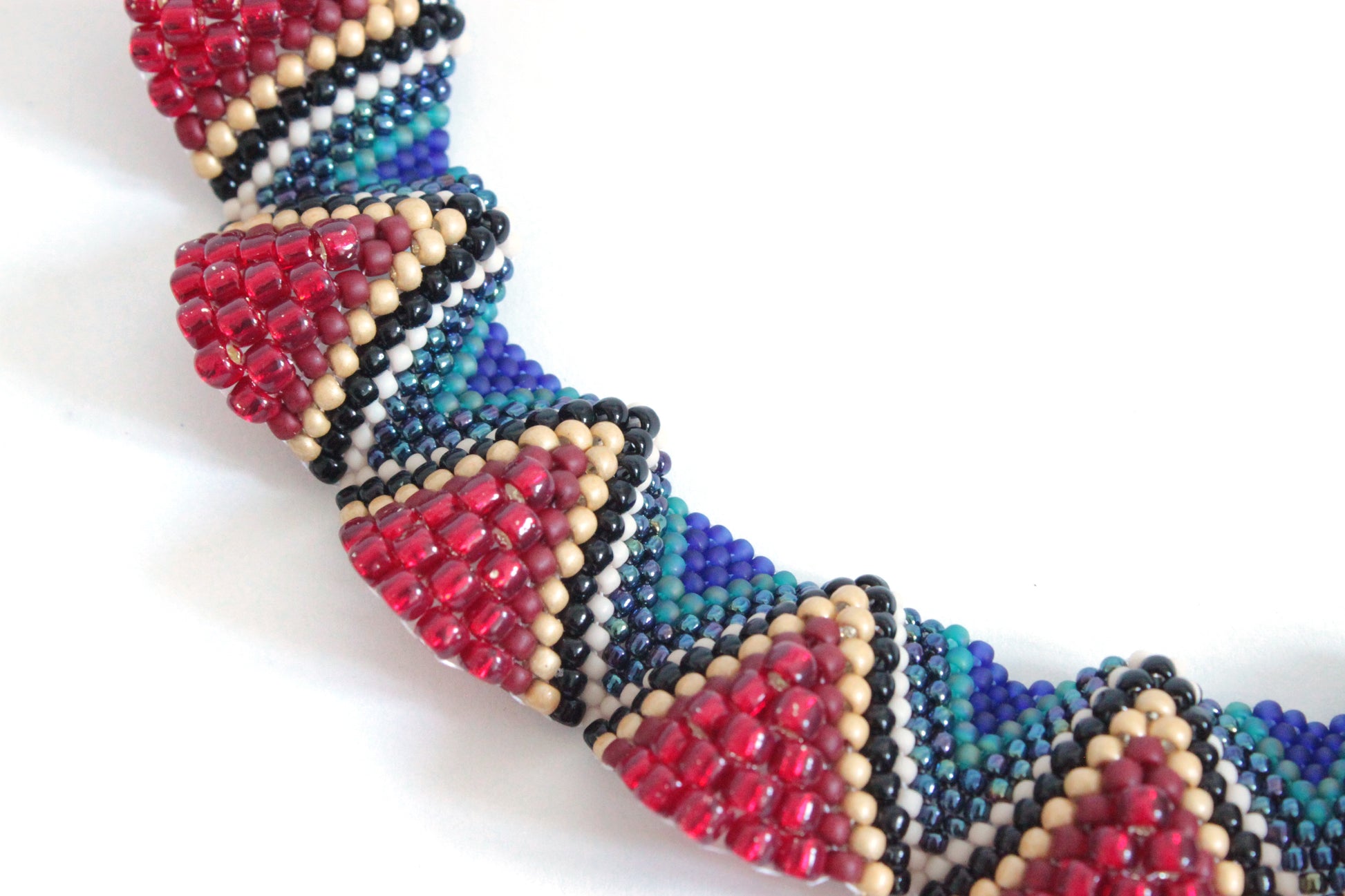 Prodotto realizzato in tessitura di perline di vetro, pertanto necessita di attenzione e cura. Evitare contatto con acqua e profumi, è consigliabile non indossarlo per dormire e riporlo in un luogo asciutto lontano da luce e polvere.
