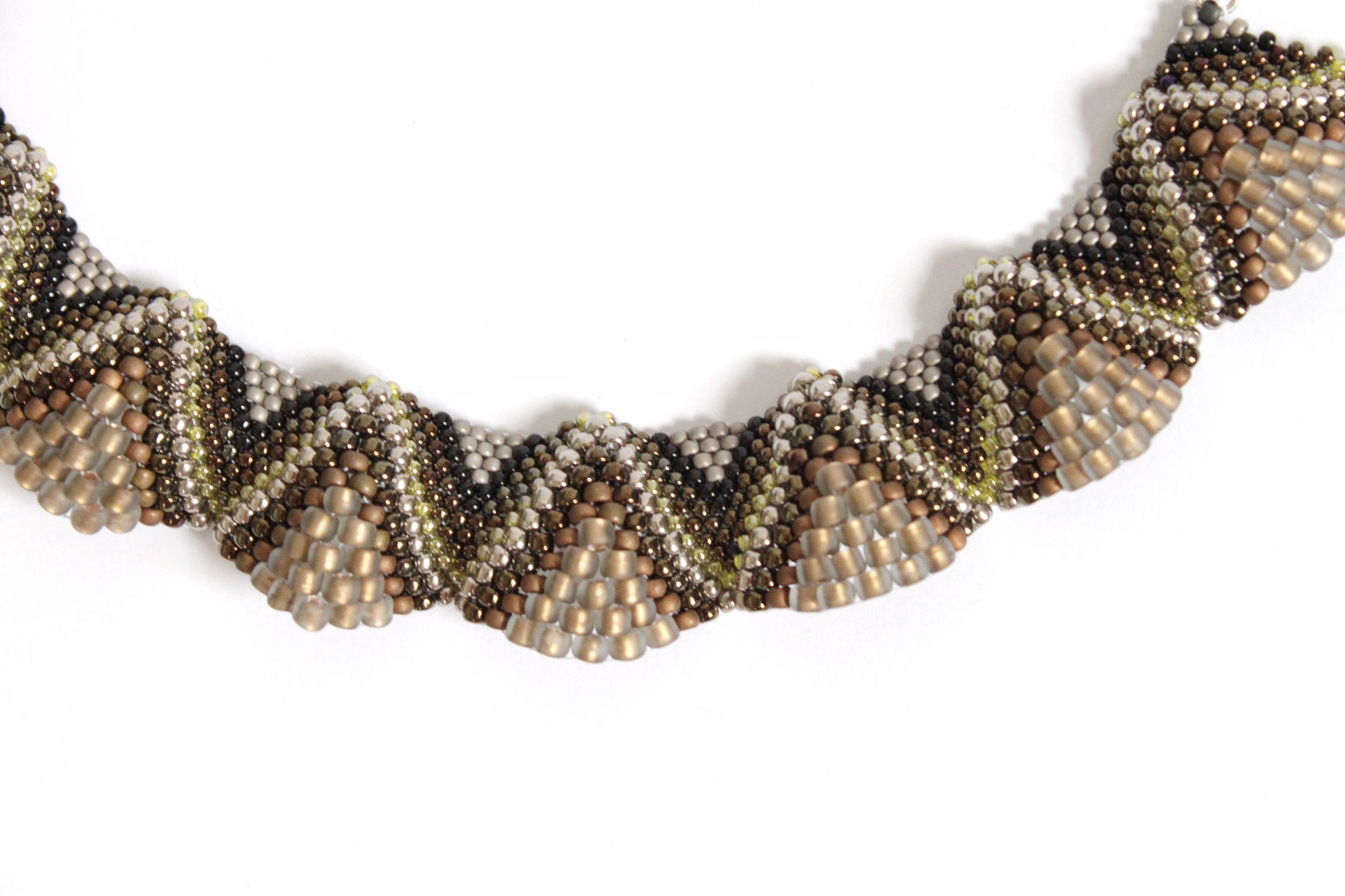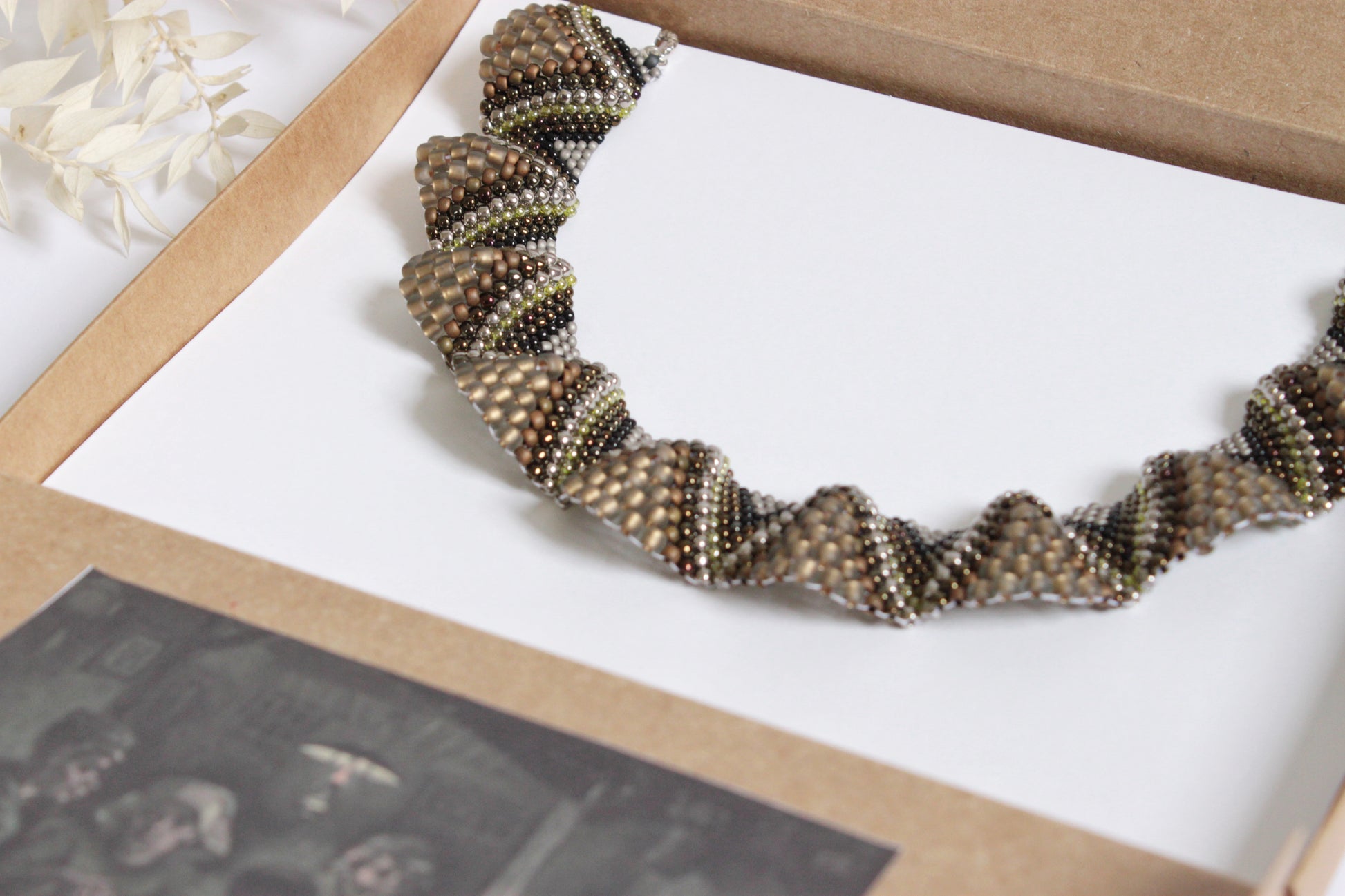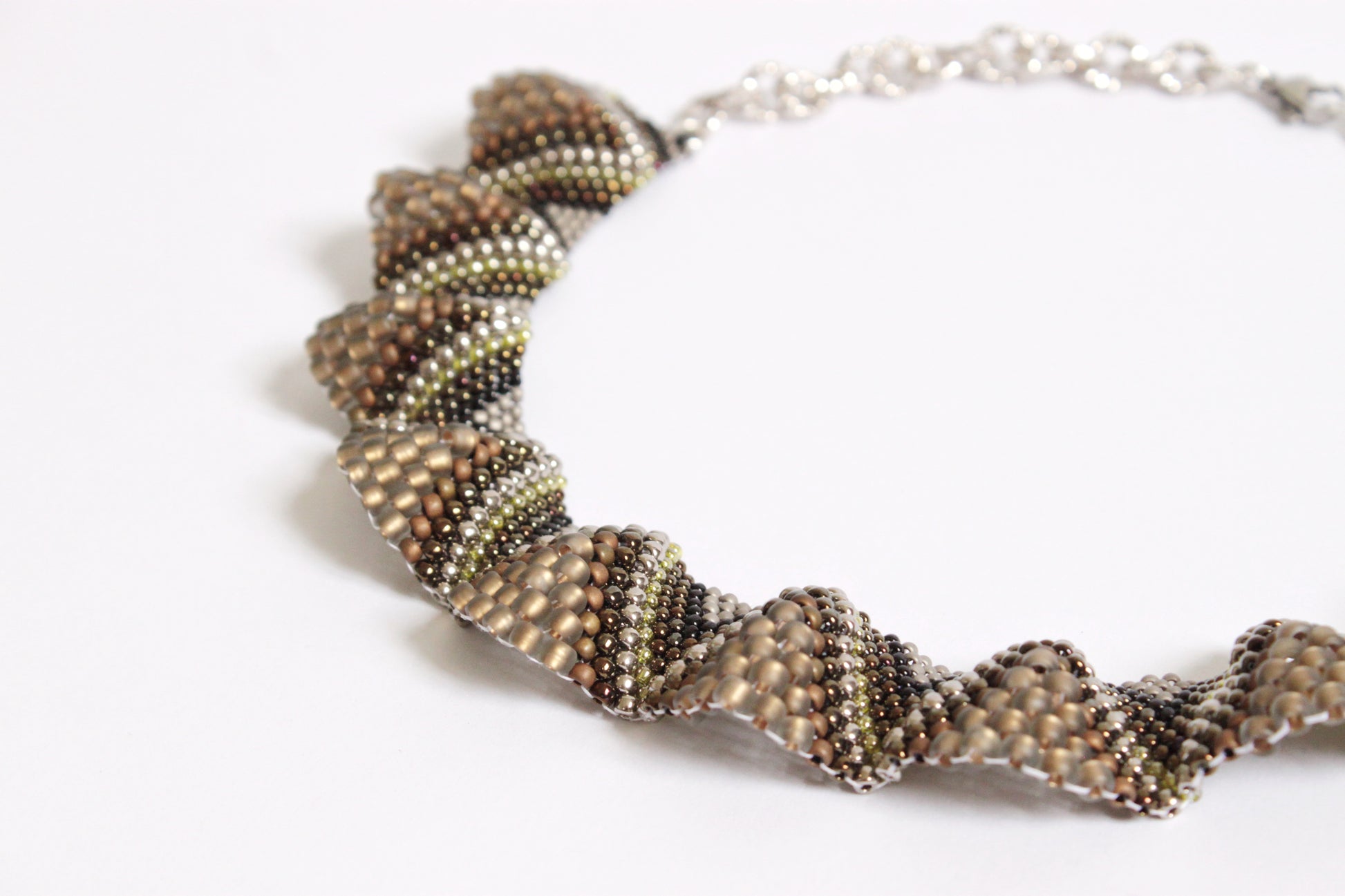 Realizzata in tessitura di perline giapponesi Toho di varie misure che, cucendole una ad una in posizioni predefinite, vanno a creare onde morbide. La collana è girocollo con catena zigrinata e chiusura a moschettone nikel free.