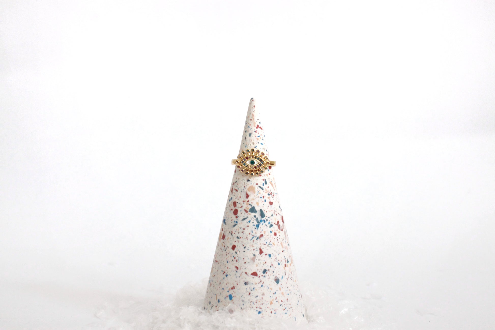 Anello regolabile in ottone dorato, con occhio centrale decorato bianco e zirconi multicolore