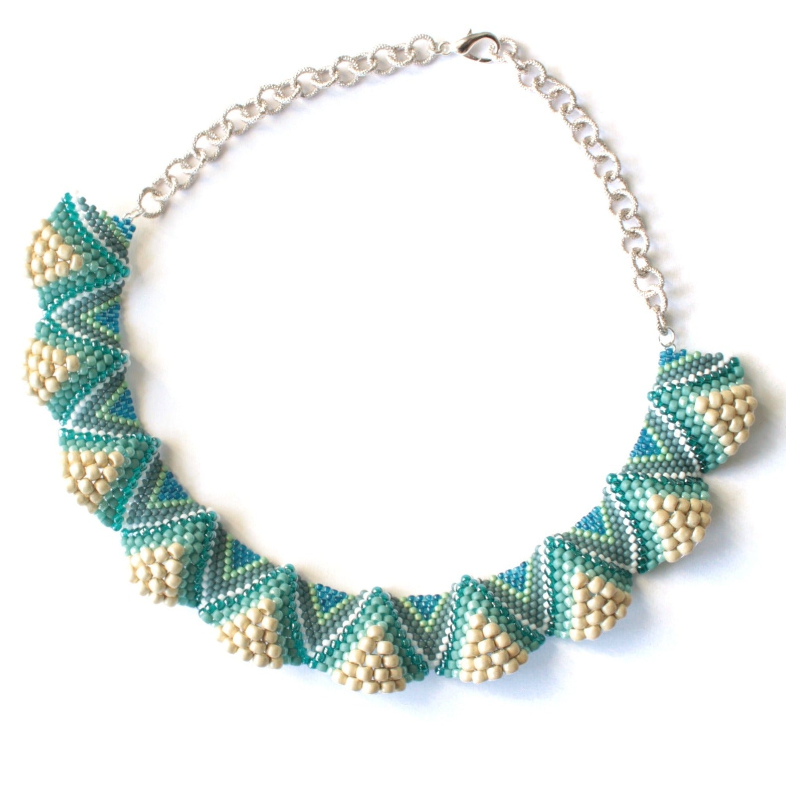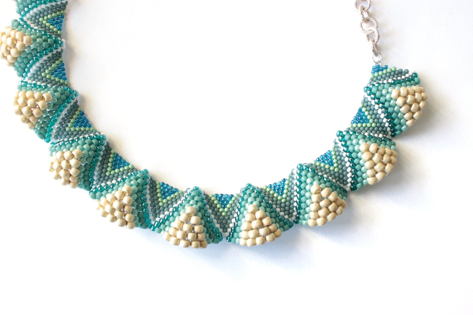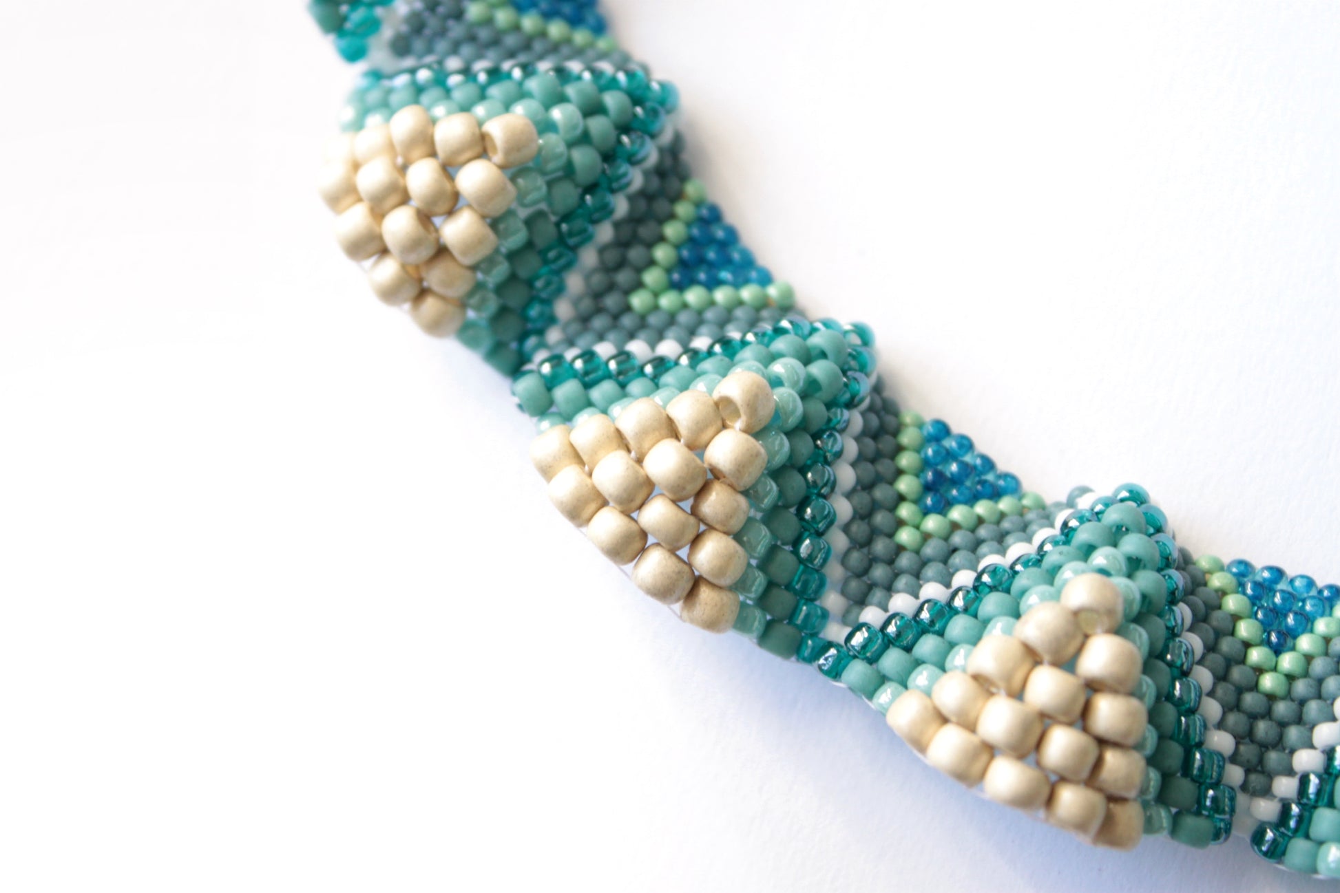Realizzata in tessitura di perline giapponesi Toho di varie misure che, cucendole una ad una in posizioni predefinite, vanno a creare onde morbide. La collana è girocollo con catena zigrinata e chiusura a moschettone nikel free.