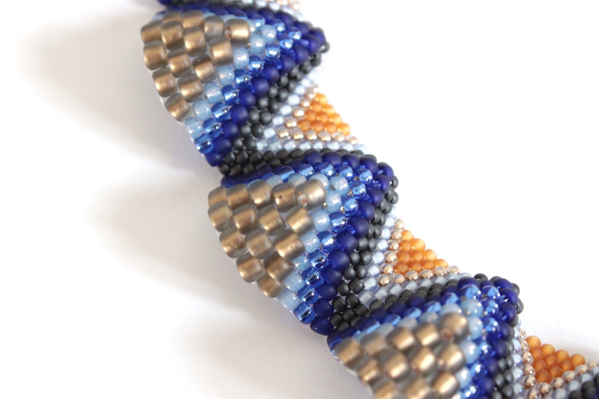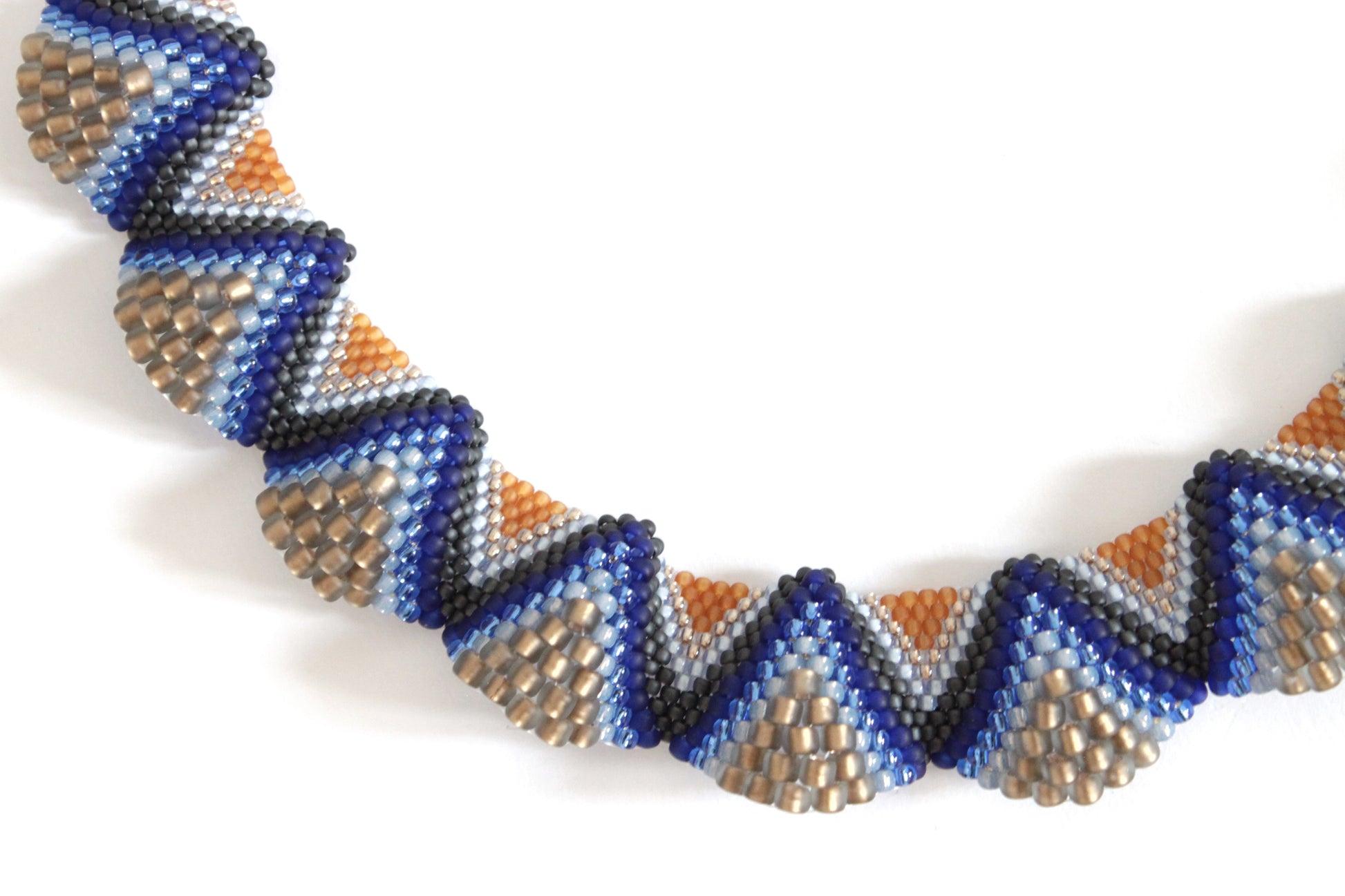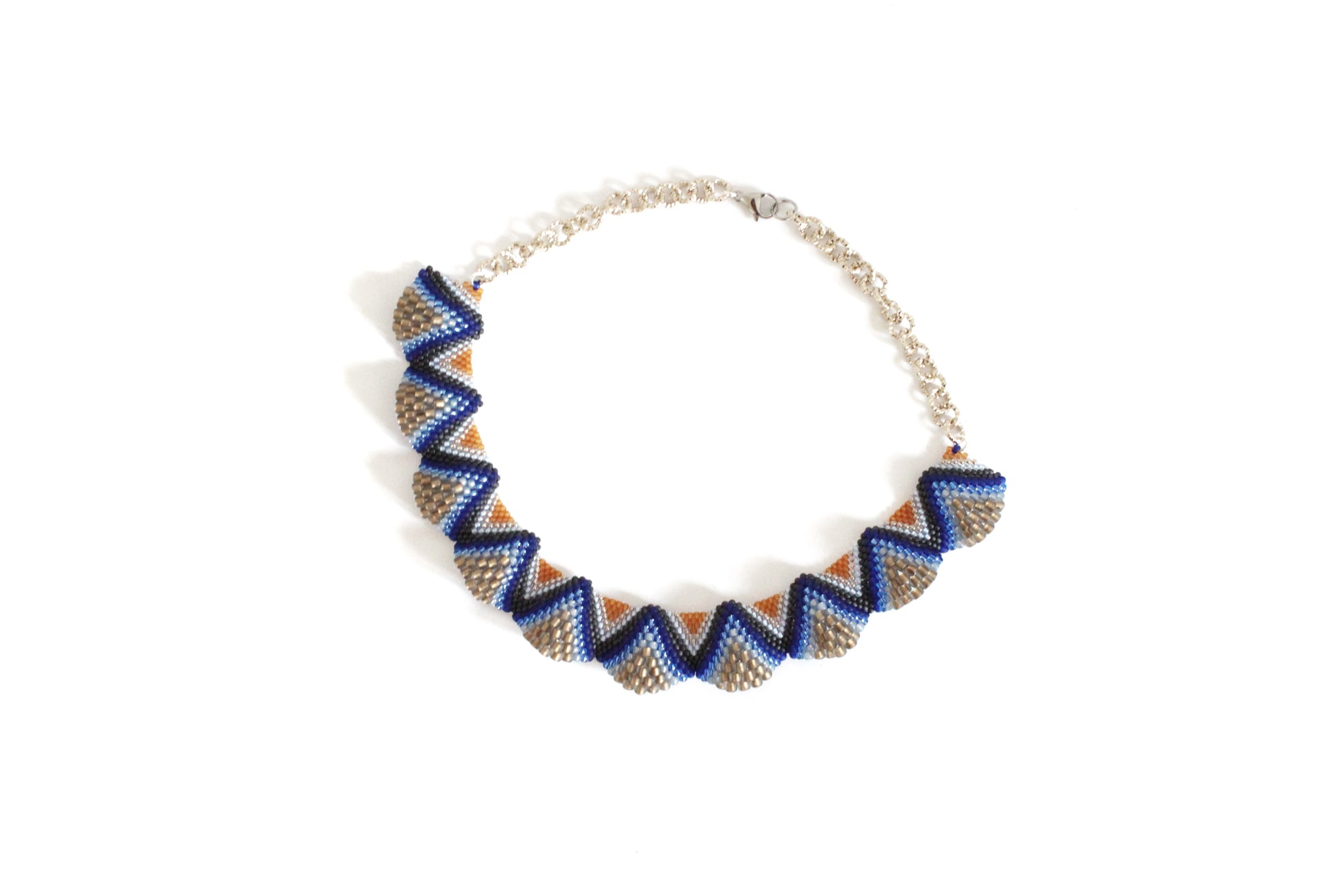 Realizzata in tessitura di perline giapponesi Toho di varie misure che, cucendole una ad una in posizioni predefinite, vanno a creare onde morbide. La collana è girocollo con catena zigrinata e chiusura a moschettone nikel free.