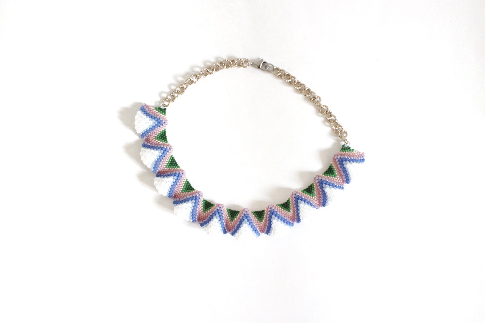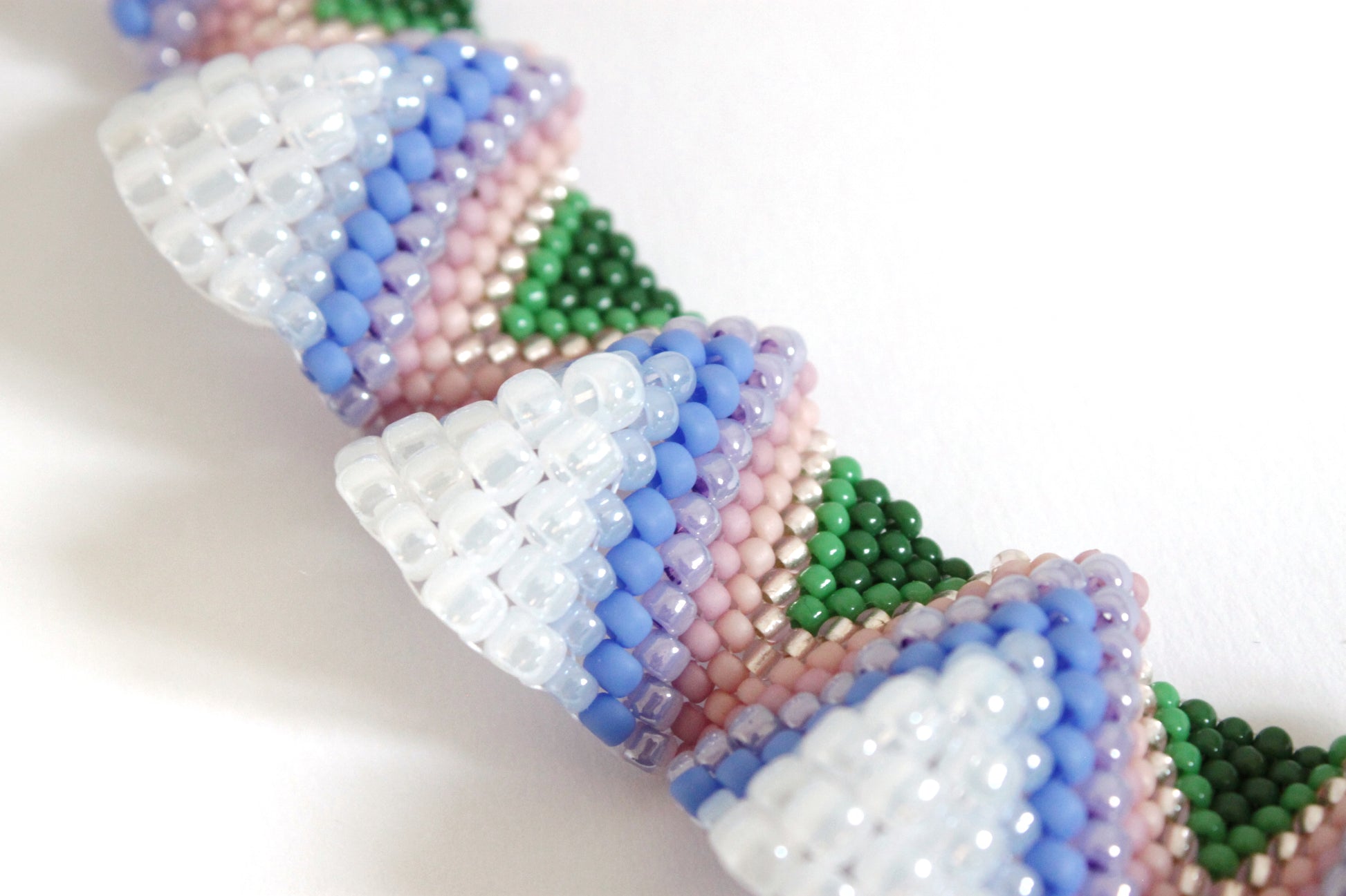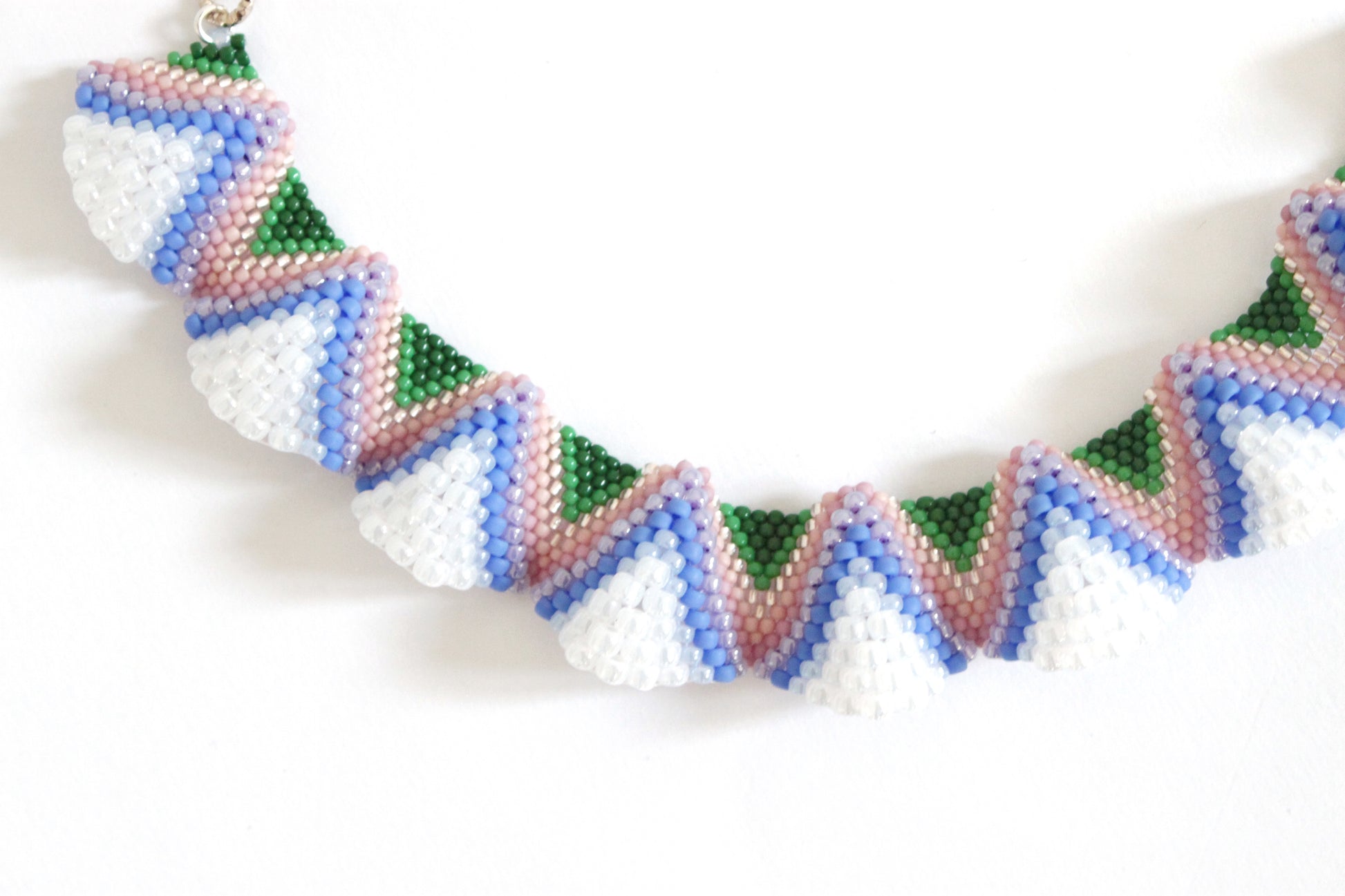 Realizzata in tessitura di perline giapponesi Toho di varie misure che, cucendole una ad una in posizioni predefinite, vanno a creare onde morbide. La collana è girocollo con catena zigrinata e chiusura a moschettone nikel free.