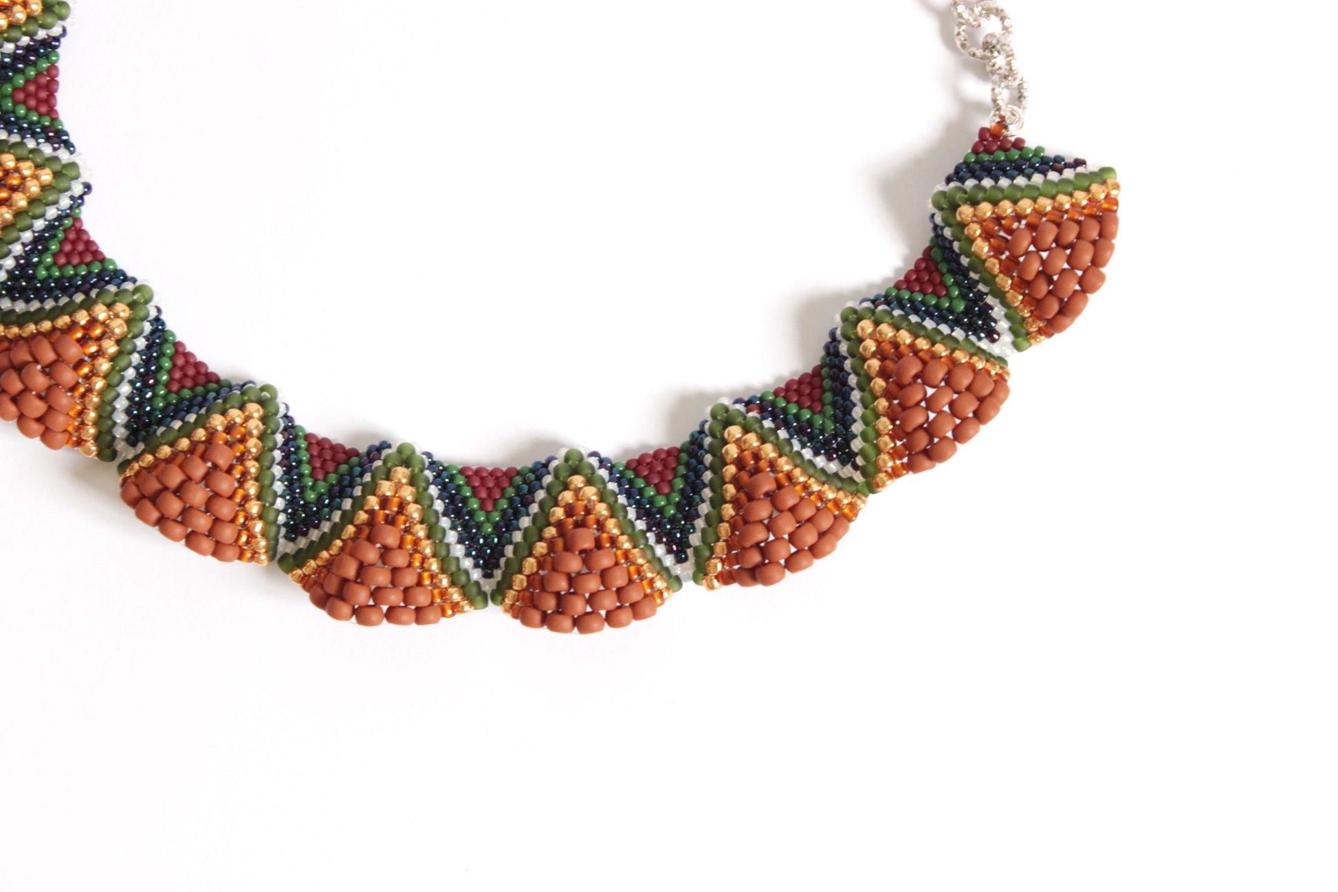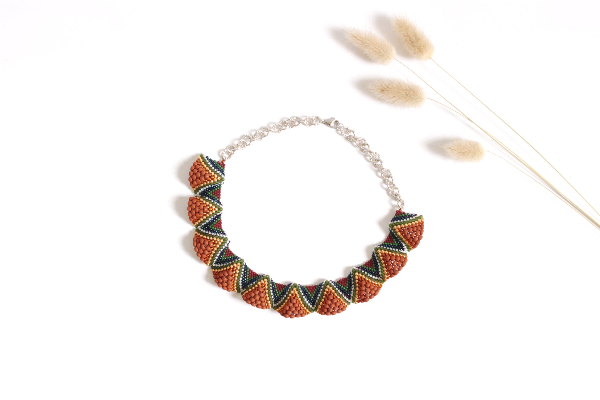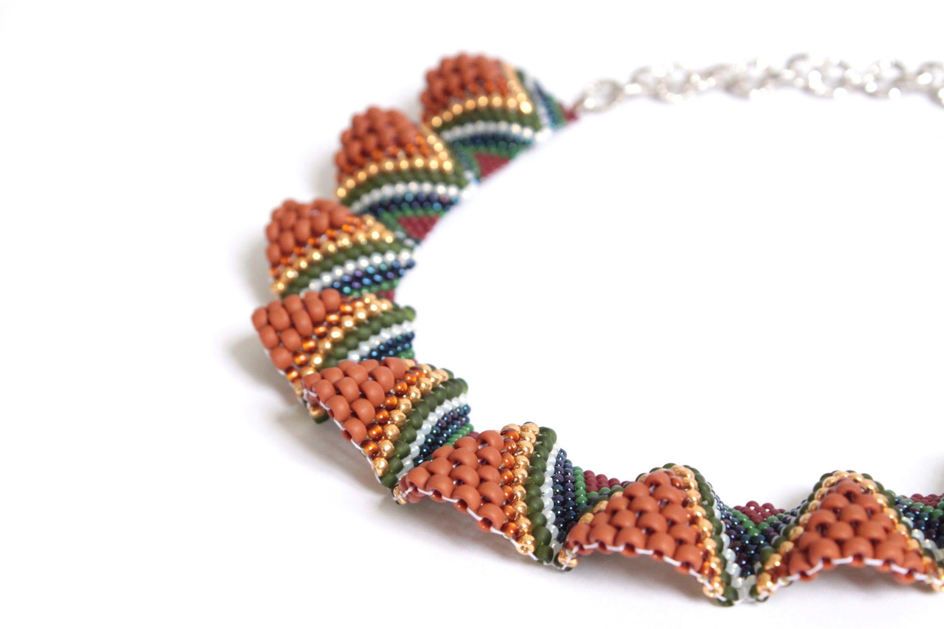 Realizzata in tessitura di perline giapponesi Toho di varie misure che, cucendole una ad una in posizioni predefinite, vanno a creare onde morbide. La collana è girocollo con catena zigrinata e chiusura a moschettone nikel free.
