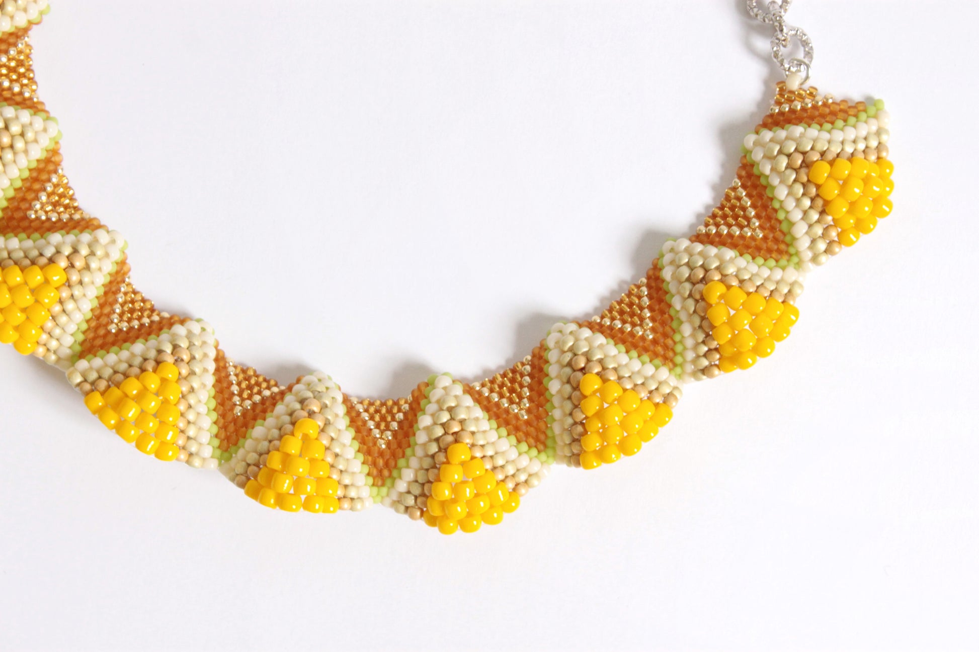 Realizzata in tessitura di perline giapponesi Toho di varie misure che, cucendole una ad una in posizioni predefinite, vanno a creare onde morbide. La collana è girocollo con catena zigrinata e chiusura a moschettone nikel free.