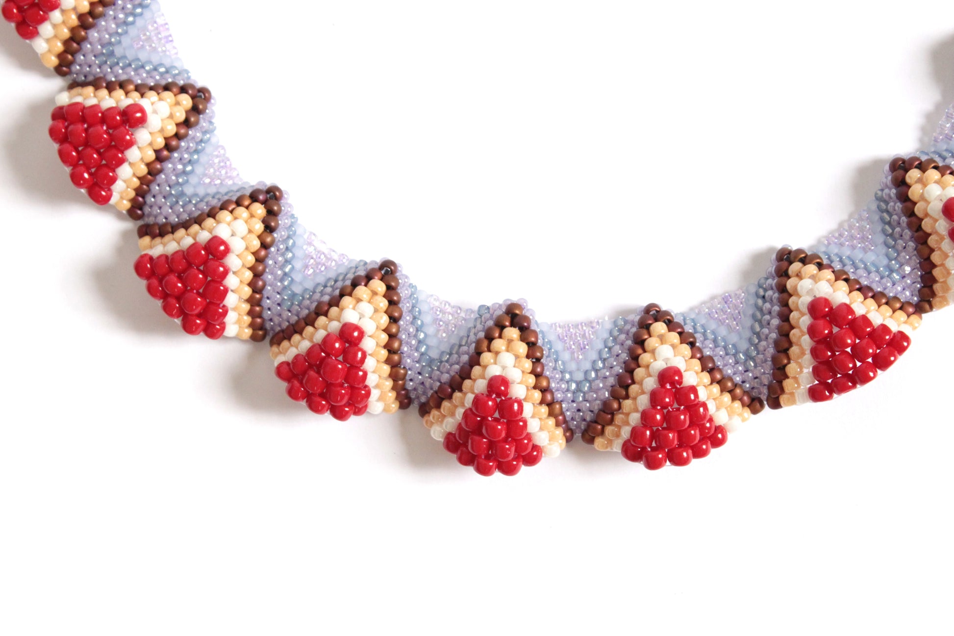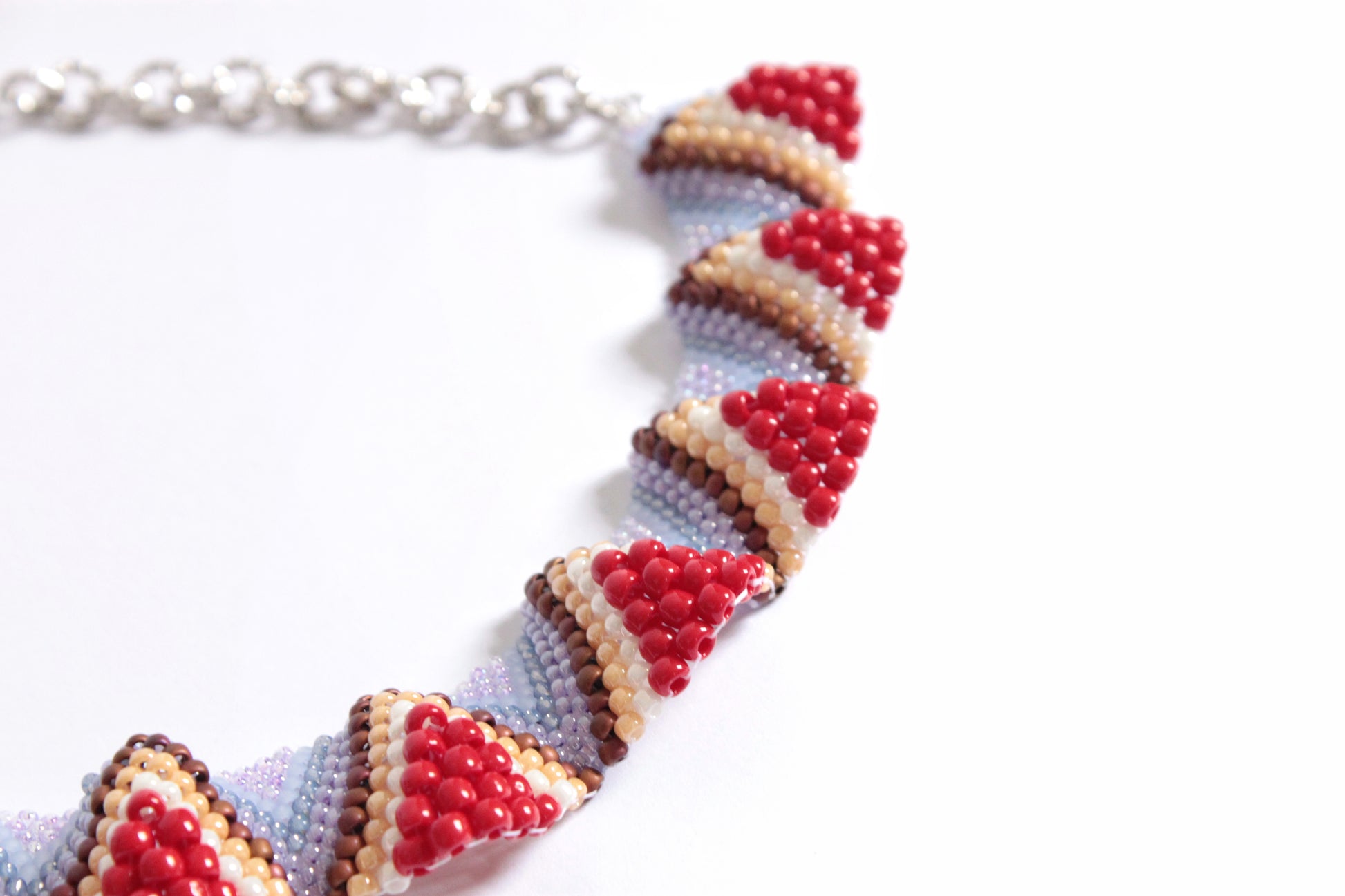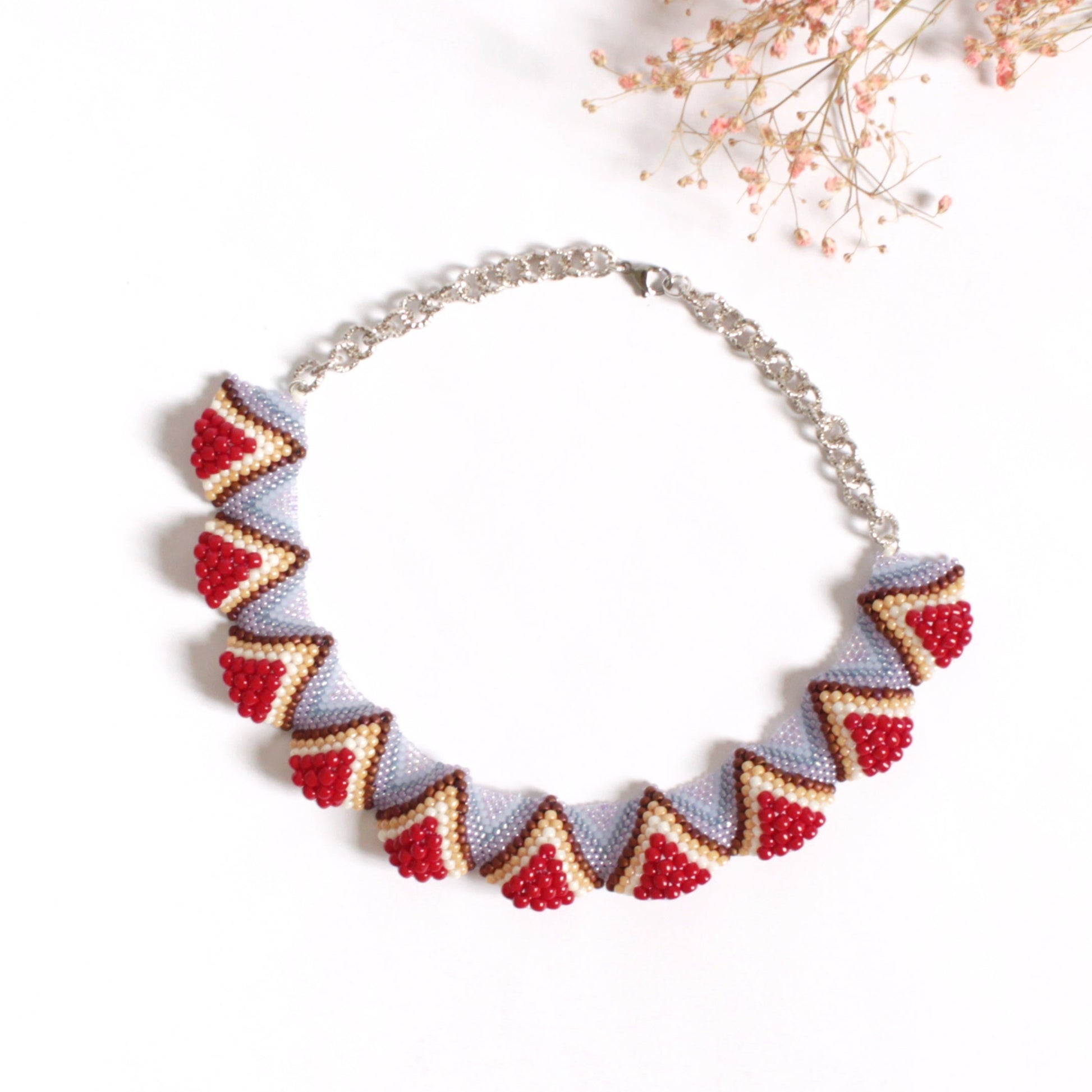 Realizzata in tessitura di perline giapponesi Toho di varie misure che, cucendole una ad una in posizioni predefinite, vanno a creare onde morbide. La collana è girocollo con catena zigrinata e chiusura a moschettone nikel free.