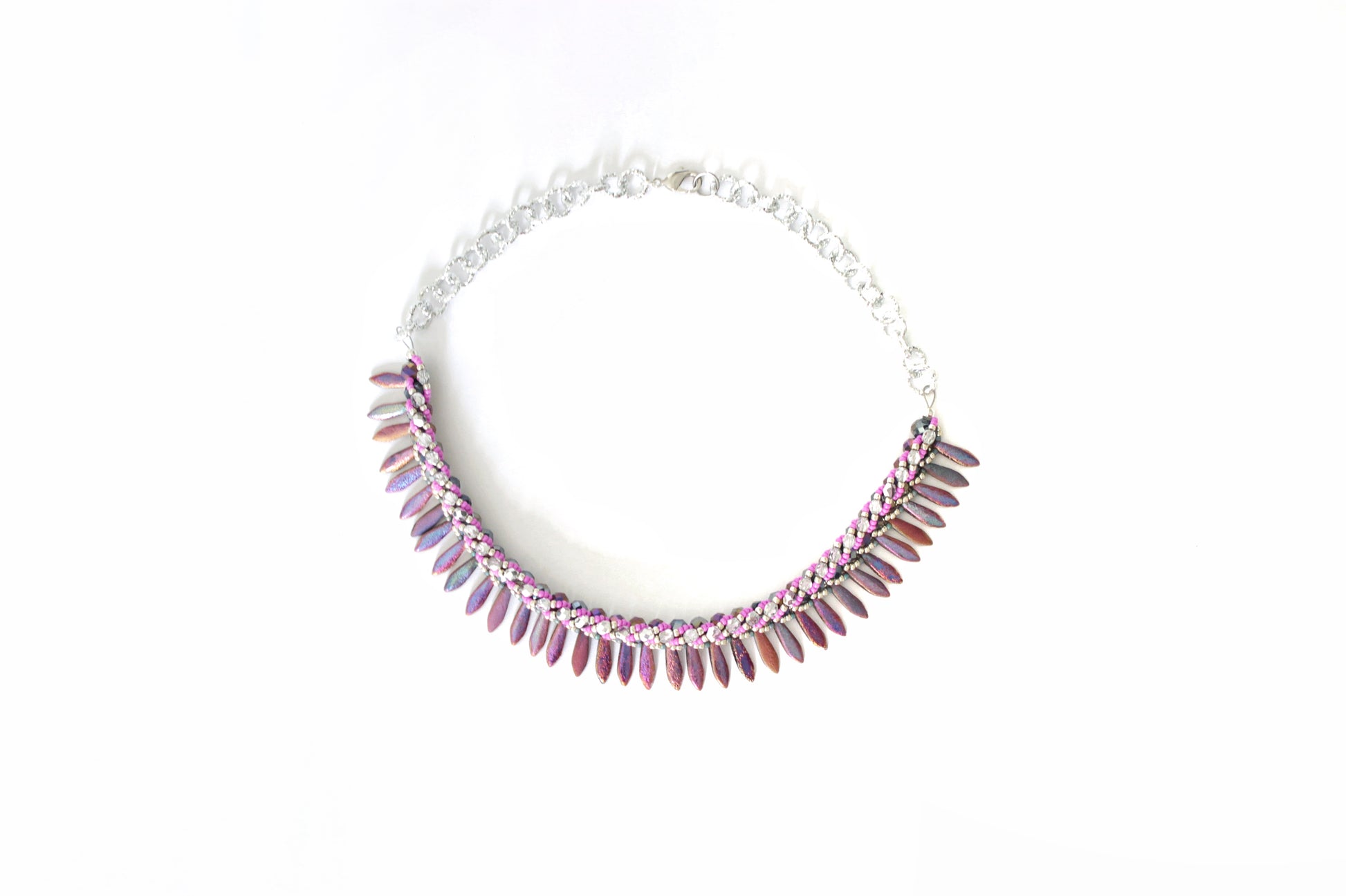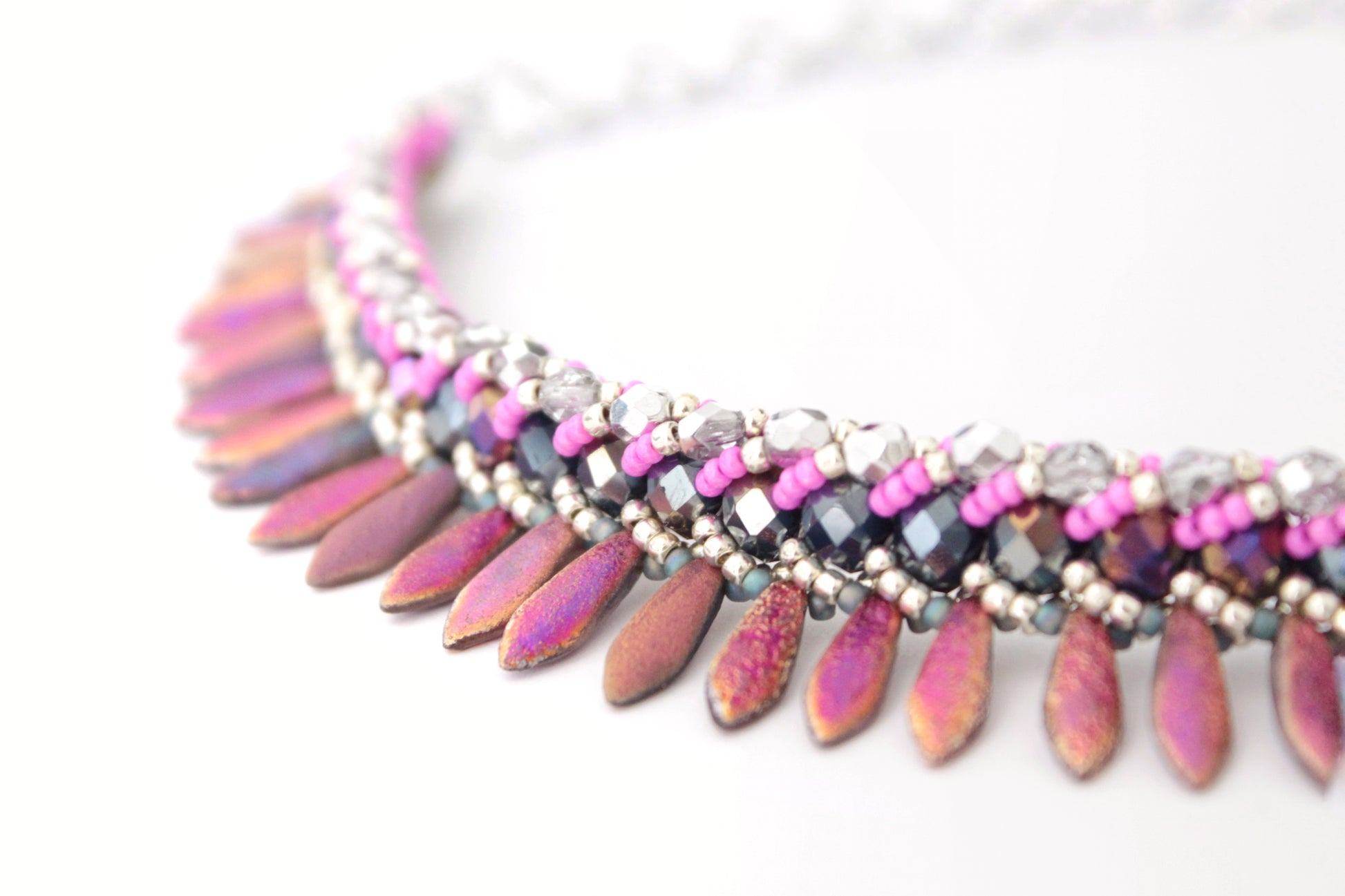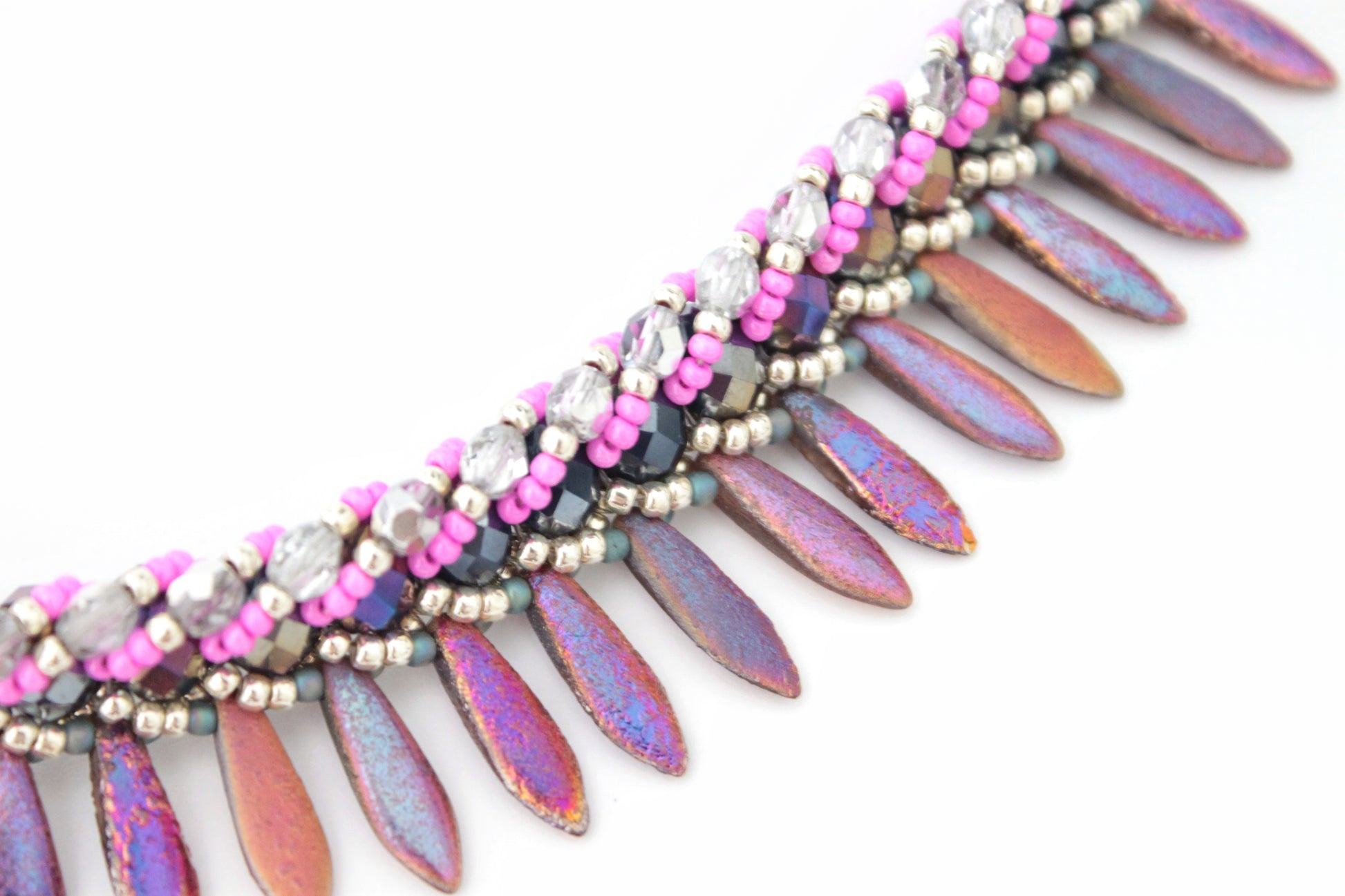 Collana Seaside girocollo realizzata nei toni del fucsia e denim in tessitura di cristalli, daghe in vetro effetto materico, perline giapponesi.