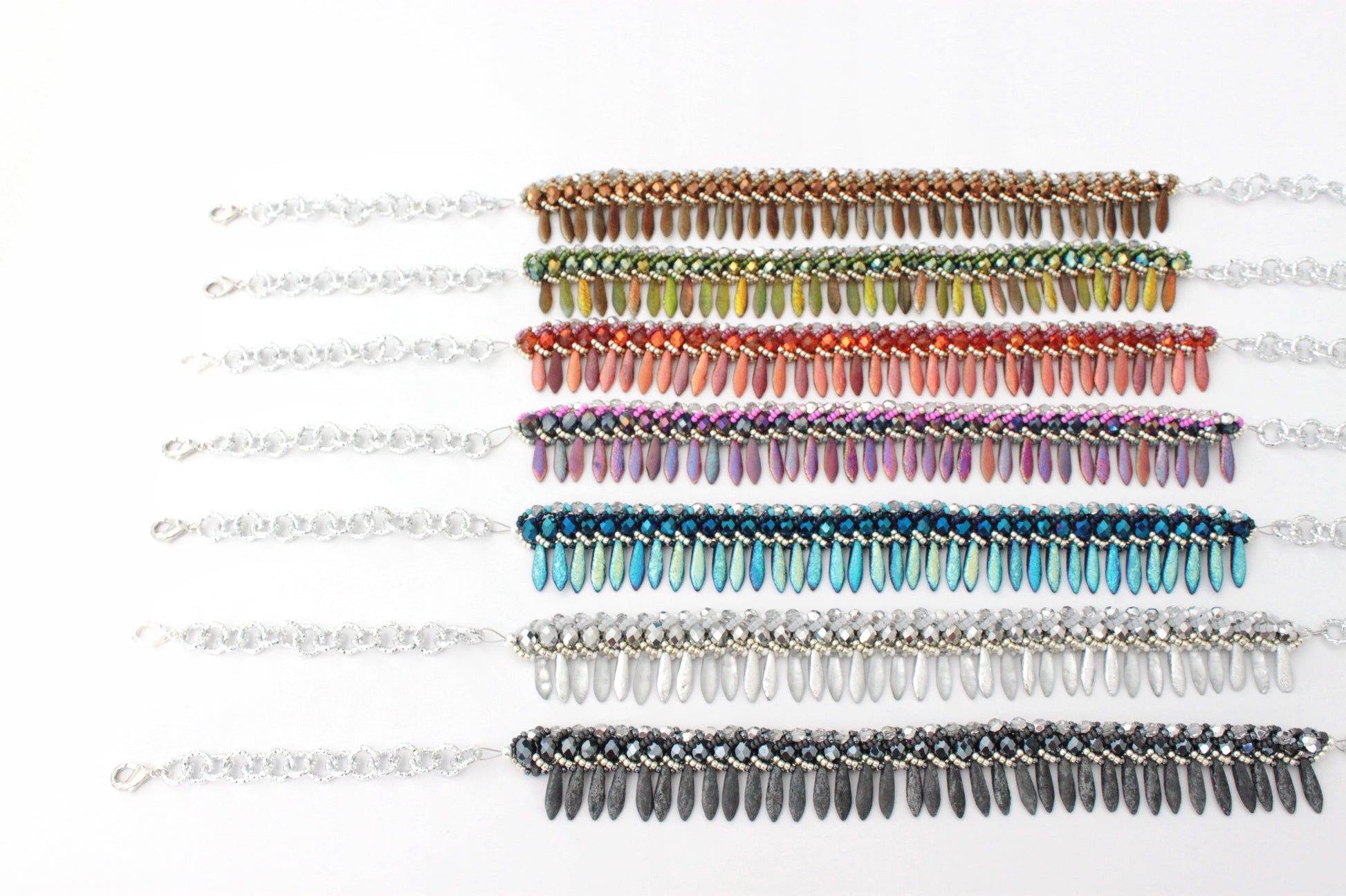 Prodotto realizzato in tessitura di perline di vetro, pertanto necessita di attenzione e cura. Evitare contatto con acqua e profumi, è consigliabile non indossarlo per dormire e riporlo in un luogo asciutto lontano da luce e polvere.