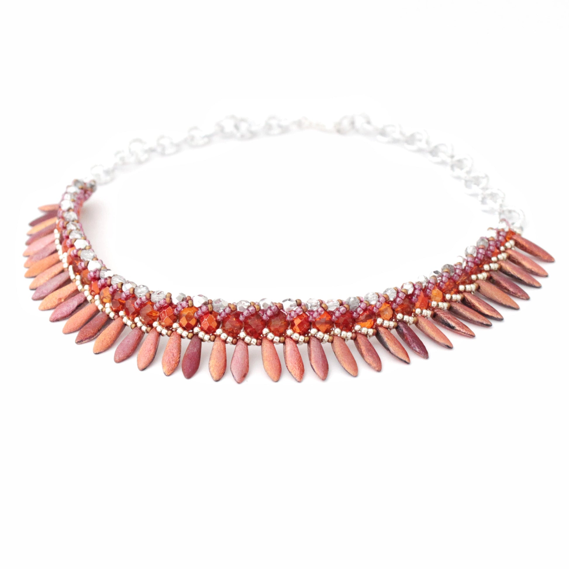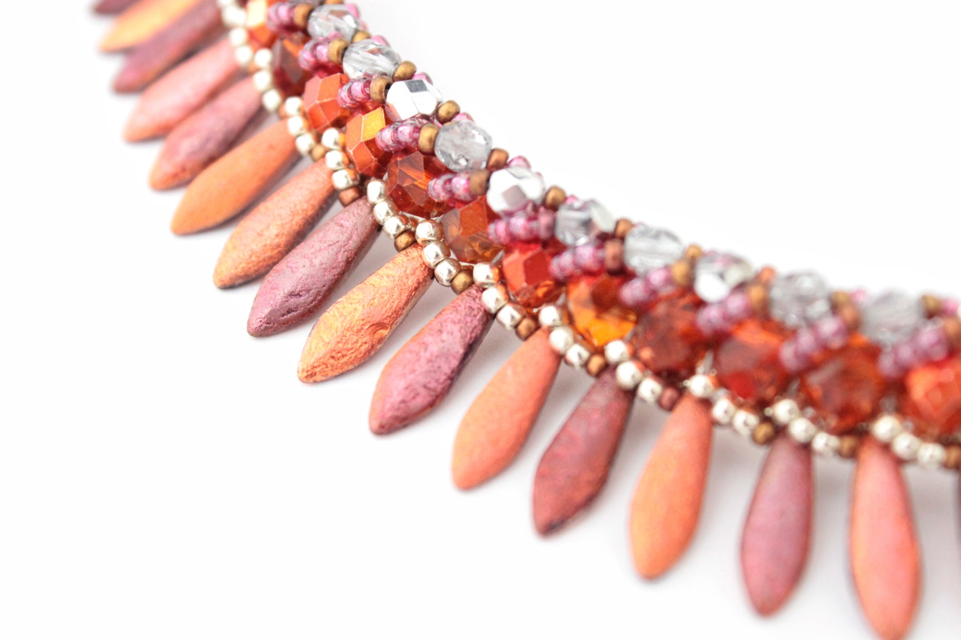 Collana Seaside girocollo realizzata nei toni dell'arancio e lampone in tessitura di cristalli, daghe in vetro effetto materico, perline giapponesi.