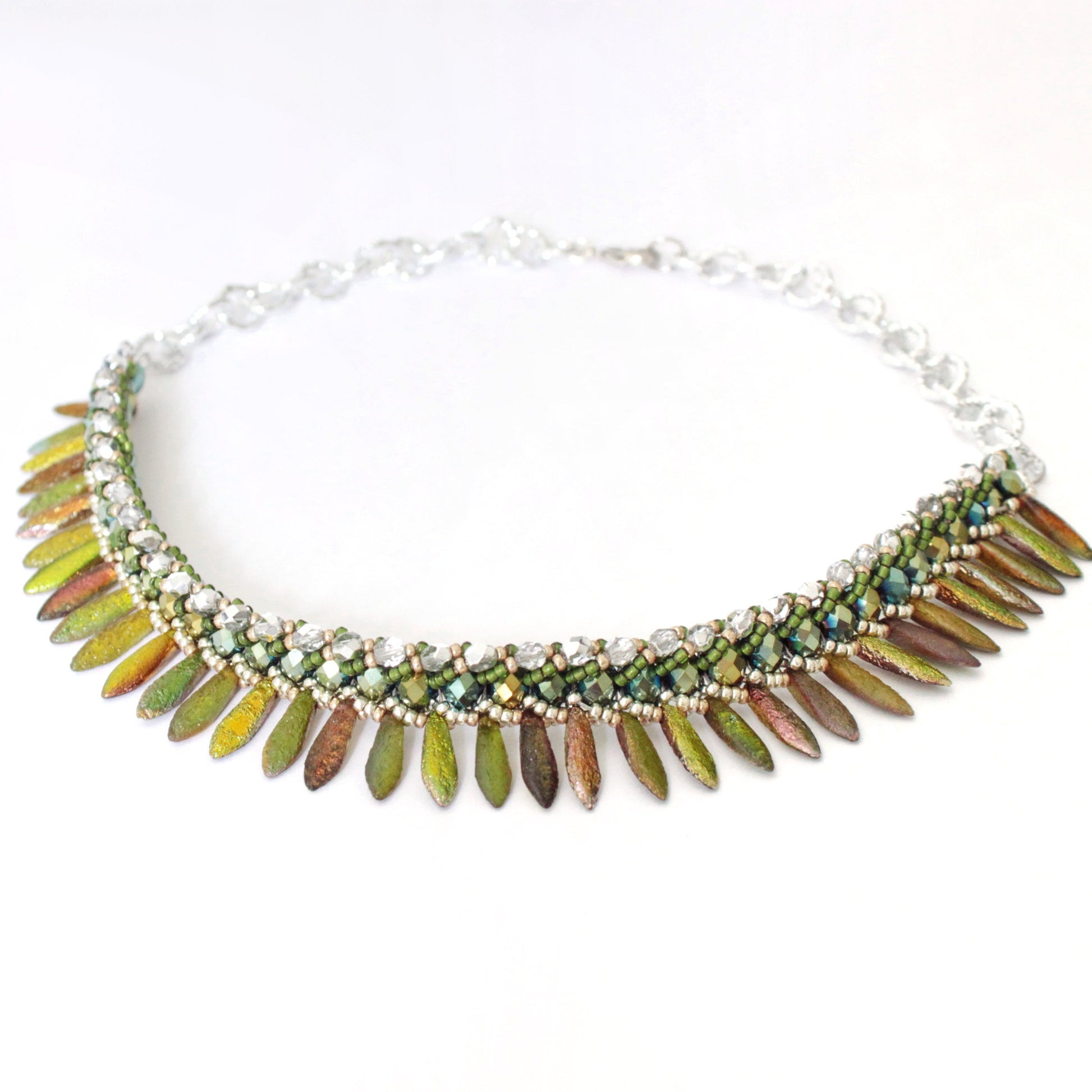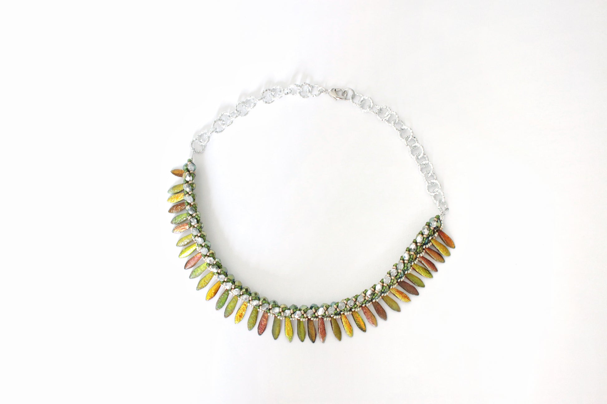 Collana Seaside girocollo realizzata nei toni del verde in tessitura di cristalli, daghe in vetro effetto materico, perline giapponesi.