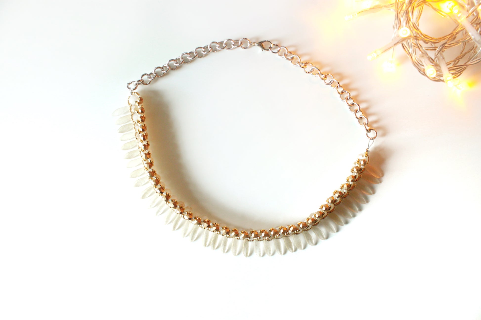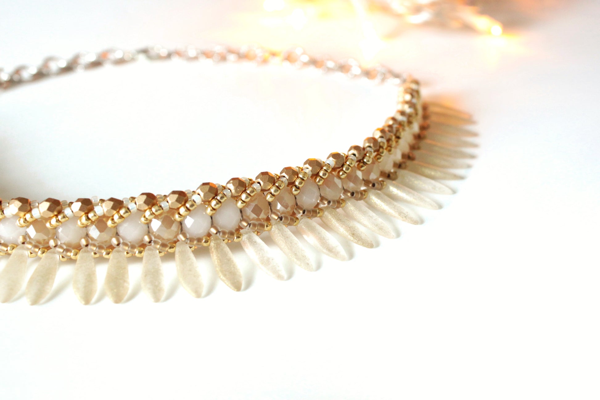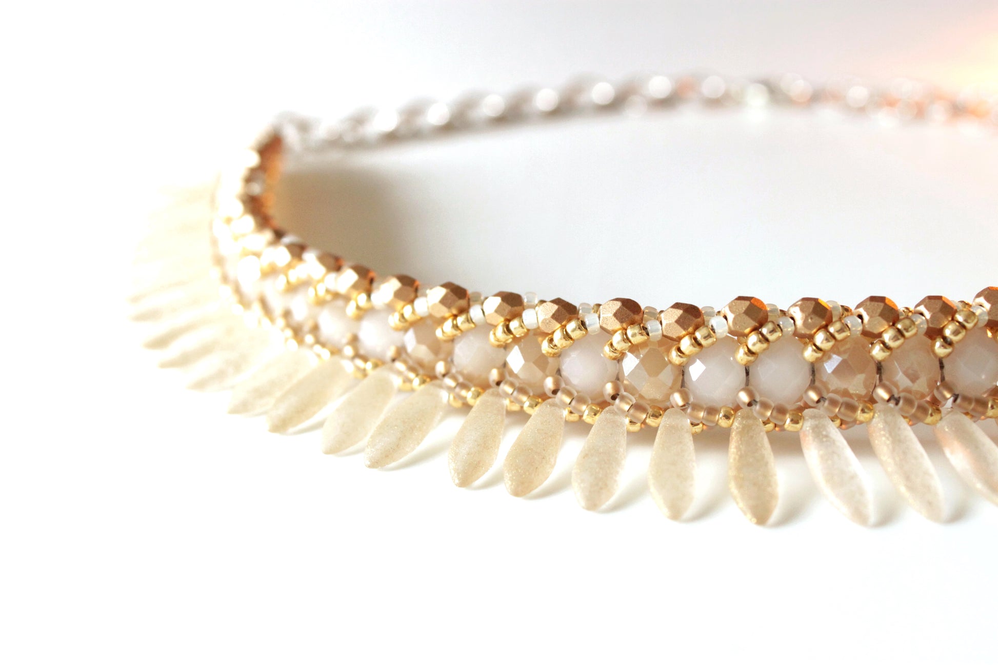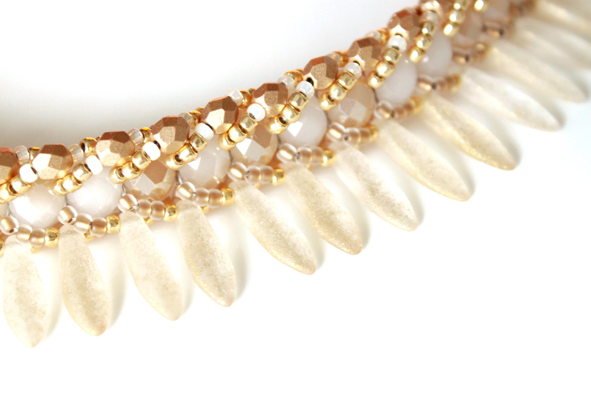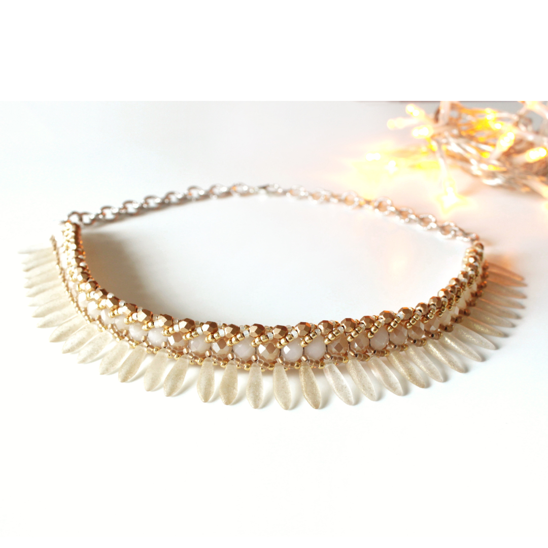Collana Seaside girocollo realizzata nei toni dell'oro chiaro in tessitura di cristalli, daghe in vetro effetto materico, perline giapponesi.