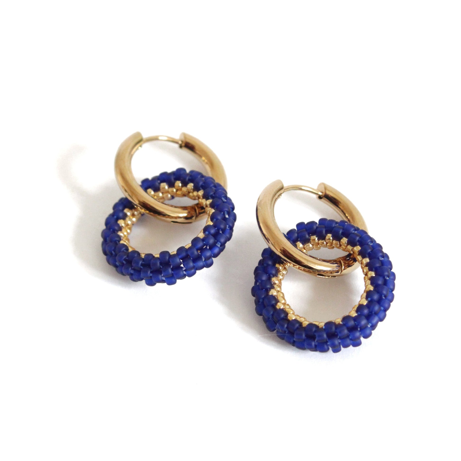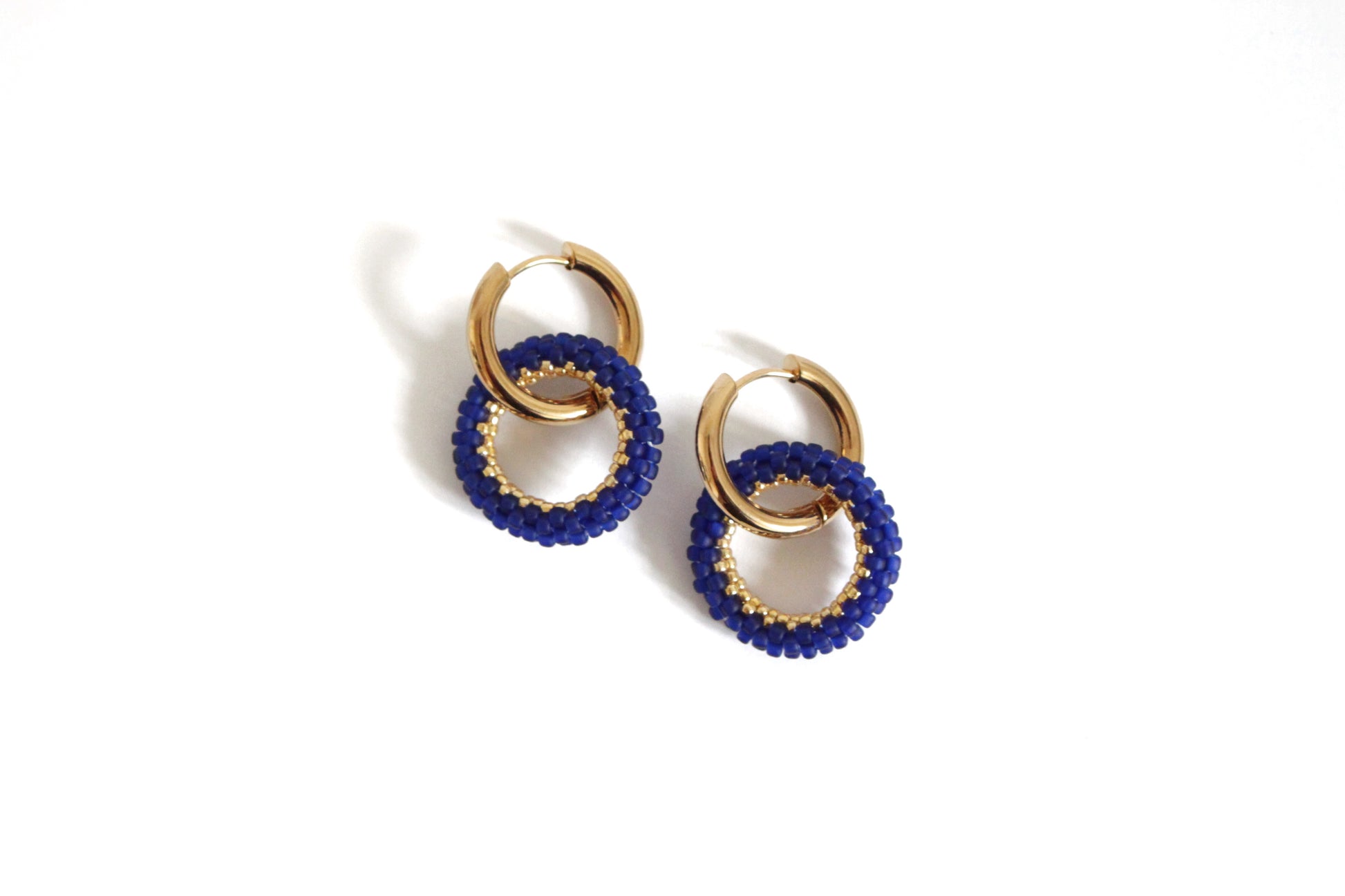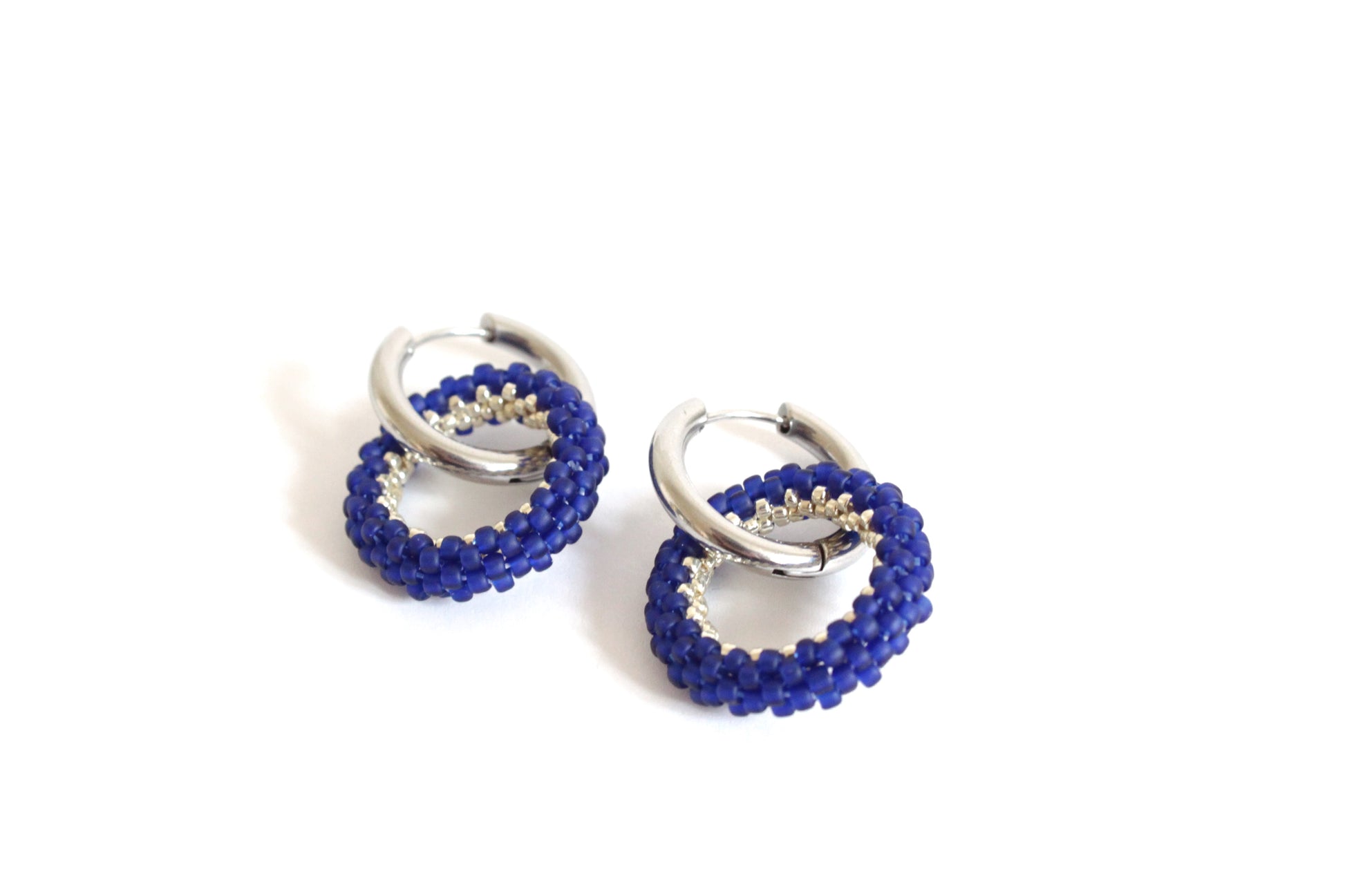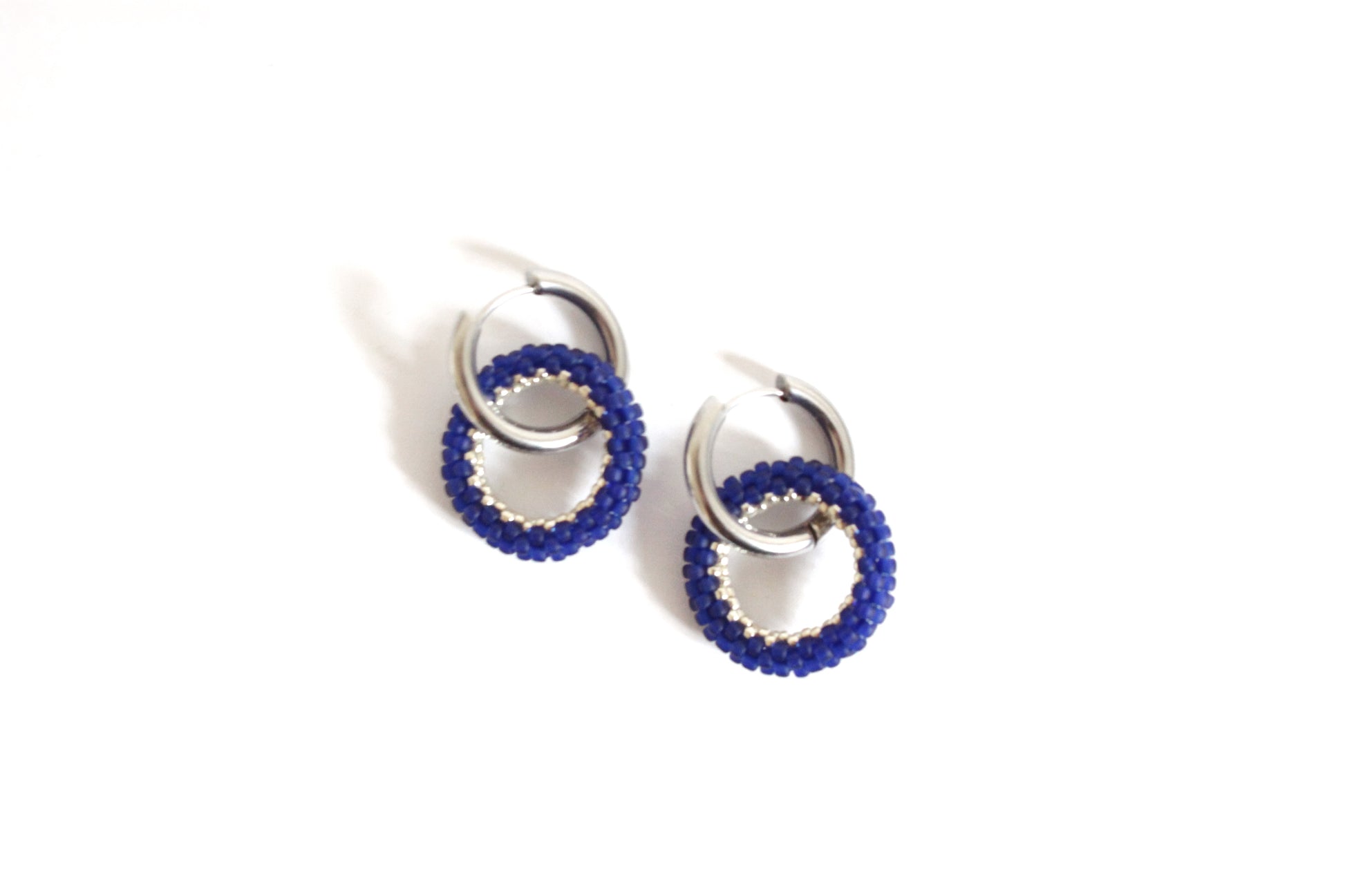 Orecchini realizzati con cerchietti in metallo argentato o dorato nikel free da 20mm intrecciati a cerchi tridimensionali da 25mm in tessitura di perline giapponesi opache nei toni del blu scuro profondo.
