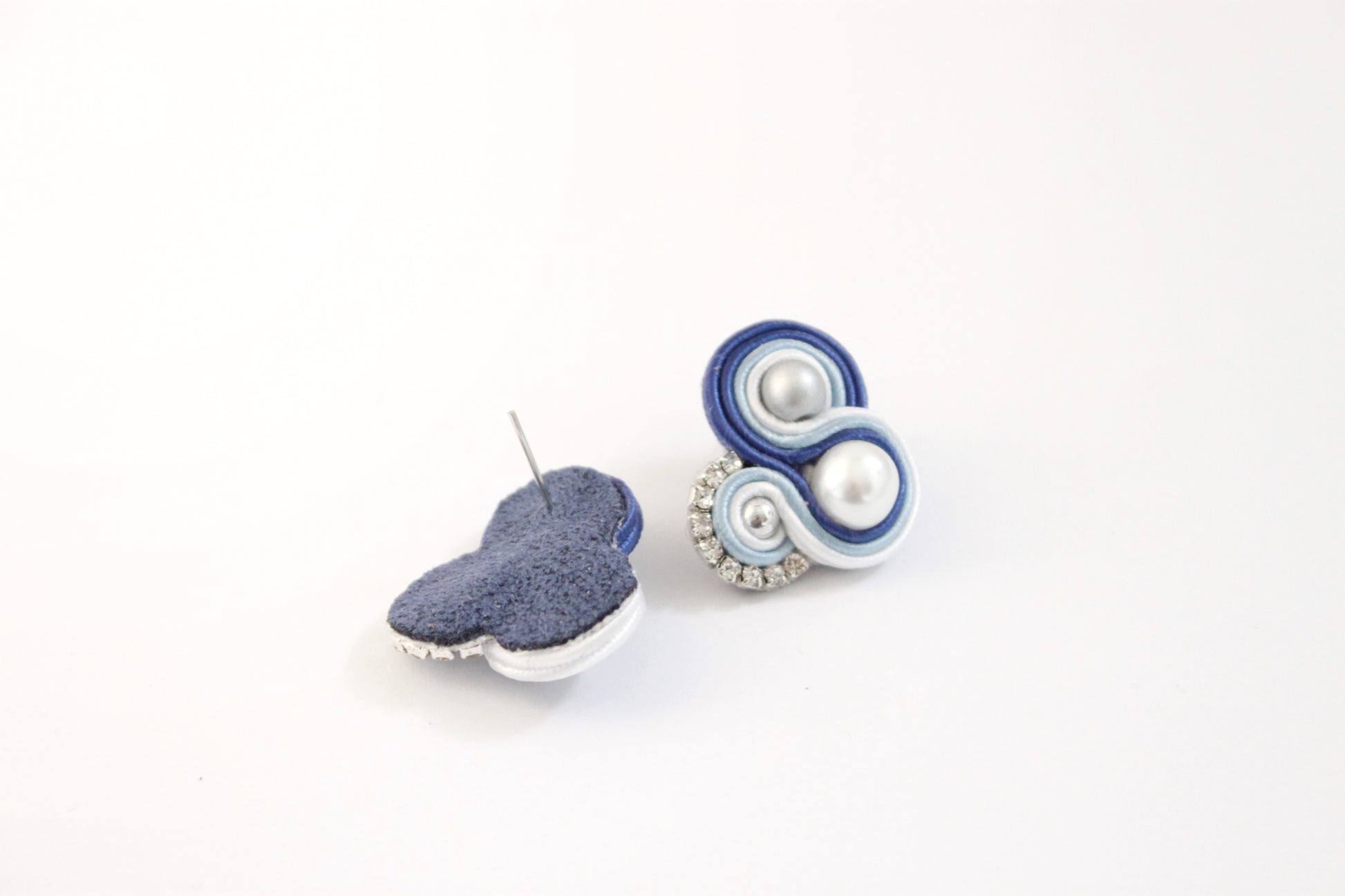 Orecchini realizzati in tecnica soutache, con piattine di seta nei colori blu elettrico, avio e bianco, perle di vetro e catena strass Swarovski.