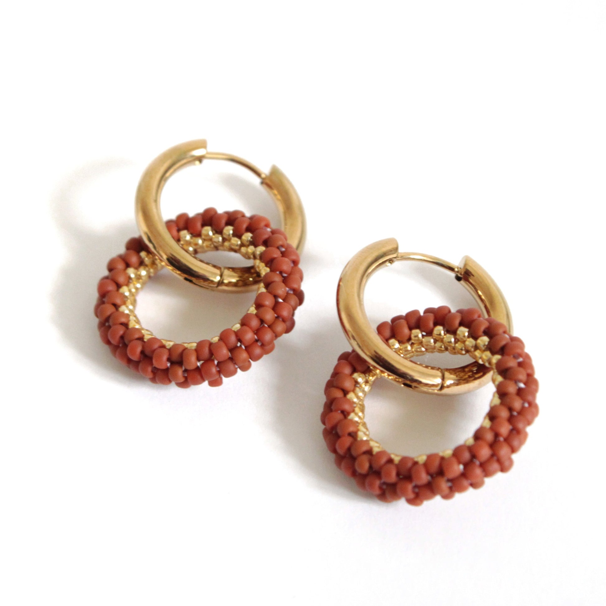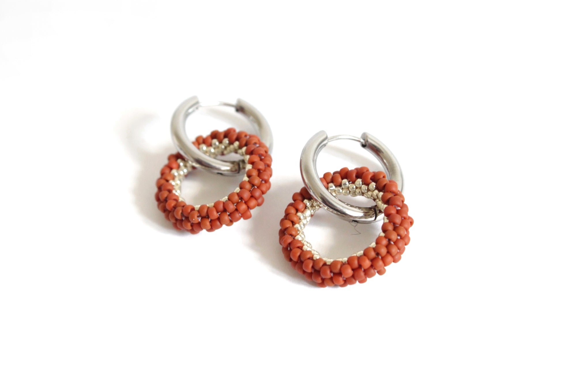 Orecchini realizzati con cerchietti in metallo argentato o dorato nikel free da 20mm intrecciati a cerchi tridimensionali da 25mm in tessitura di perline giapponesi opache nei toni del terracotta.