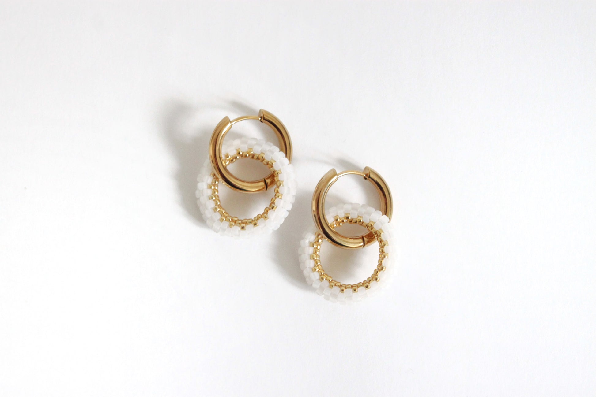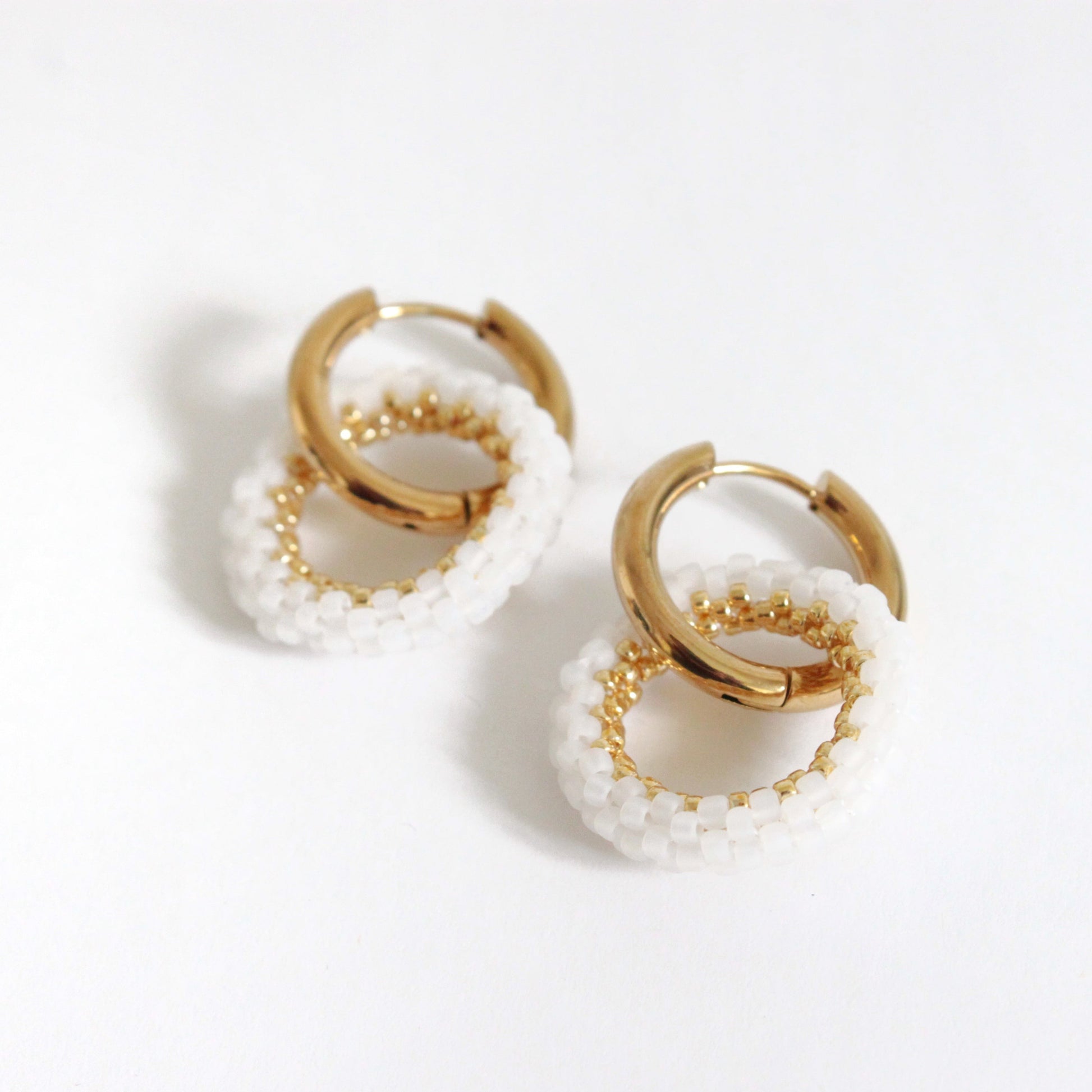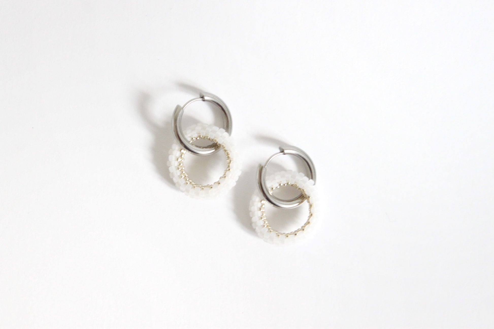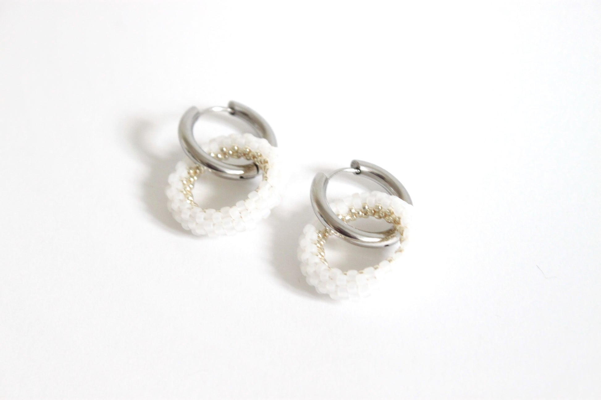 Orecchini realizzati con cerchietti in metallo argentato o dorato nikel free da 20mm intrecciati a cerchi tridimensionali da 25mm in tessitura di perline giapponesi opache nei toni trasparente effetto lattiginoso.
