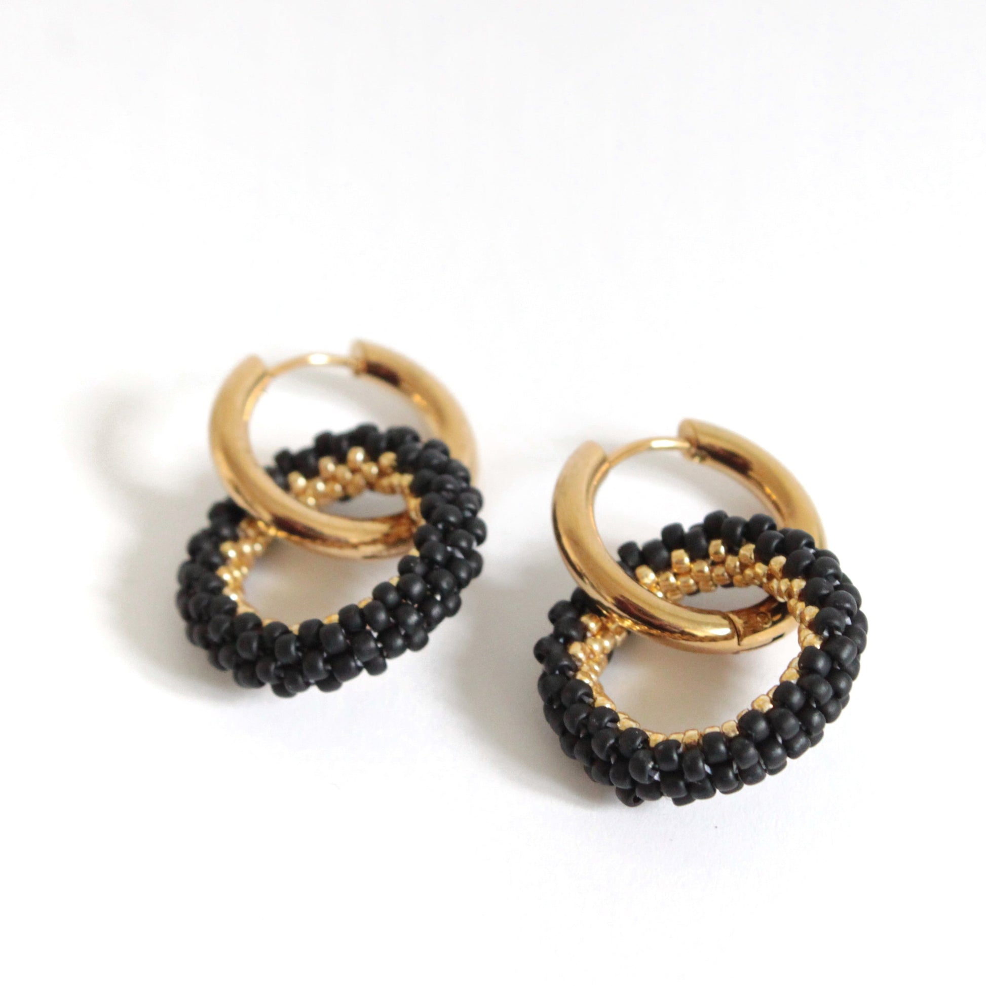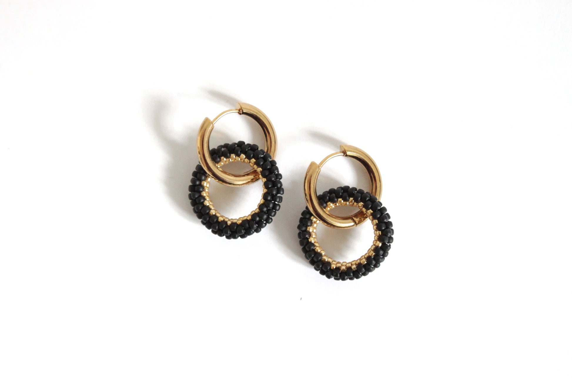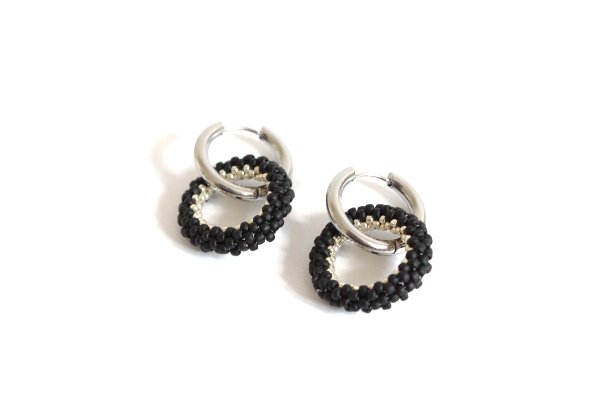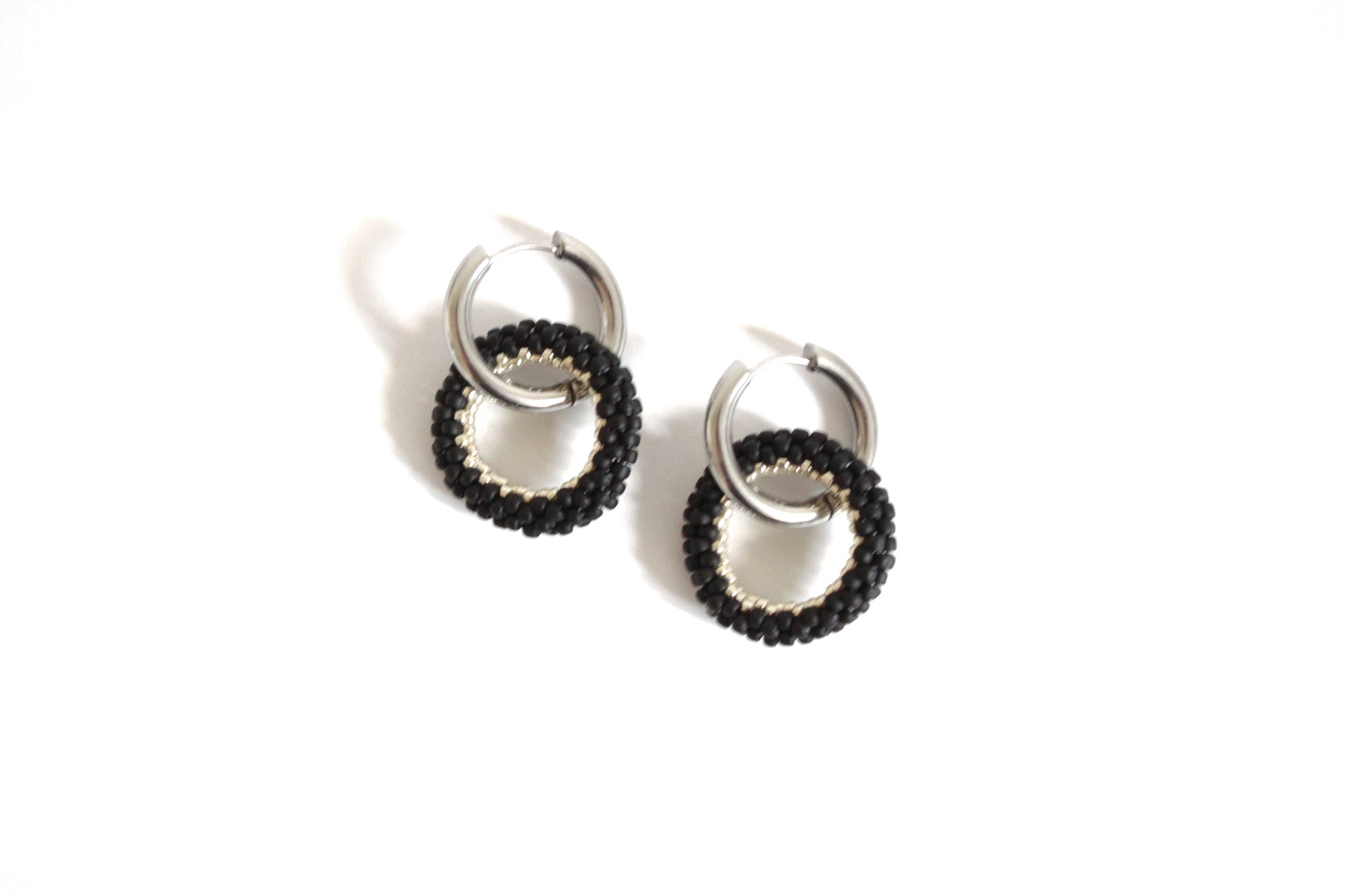 Orecchini realizzati con cerchietti in metallo argentato o dorato nikel free da 20mm intrecciati a cerchi tridimensionali da 25mm in tessitura di perline giapponesi opache nei toni del nero.