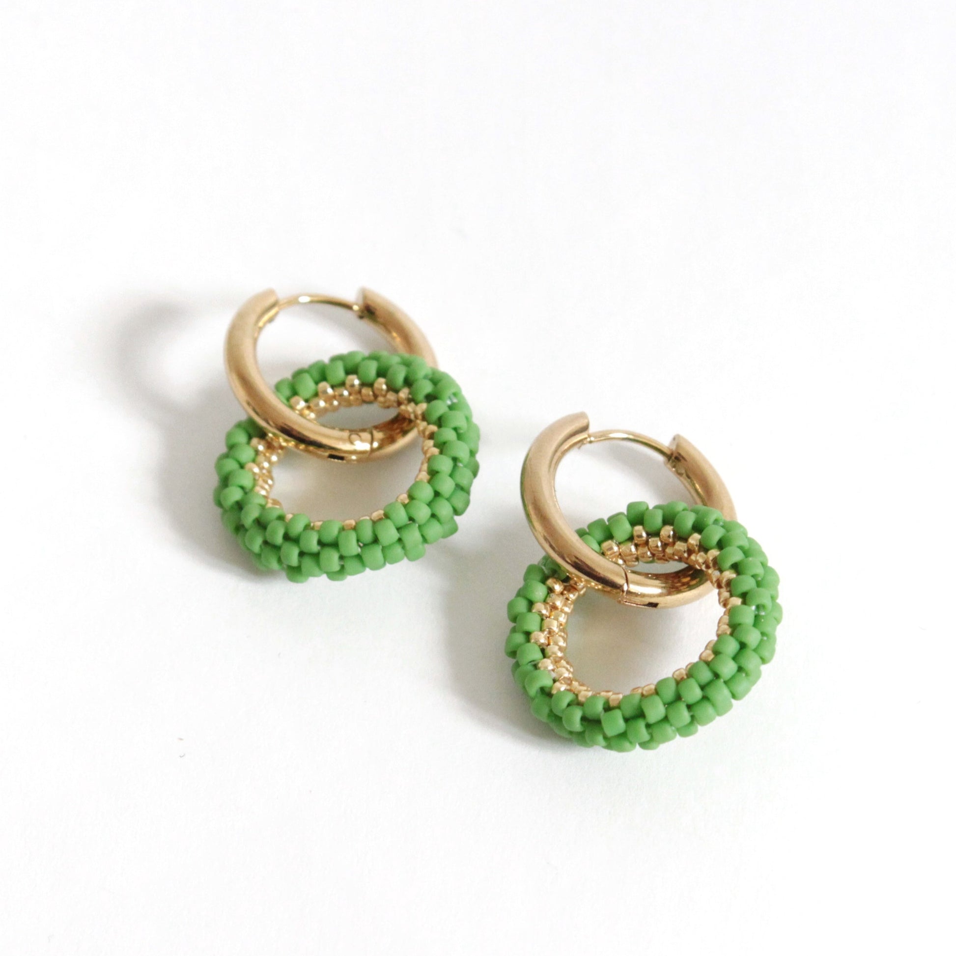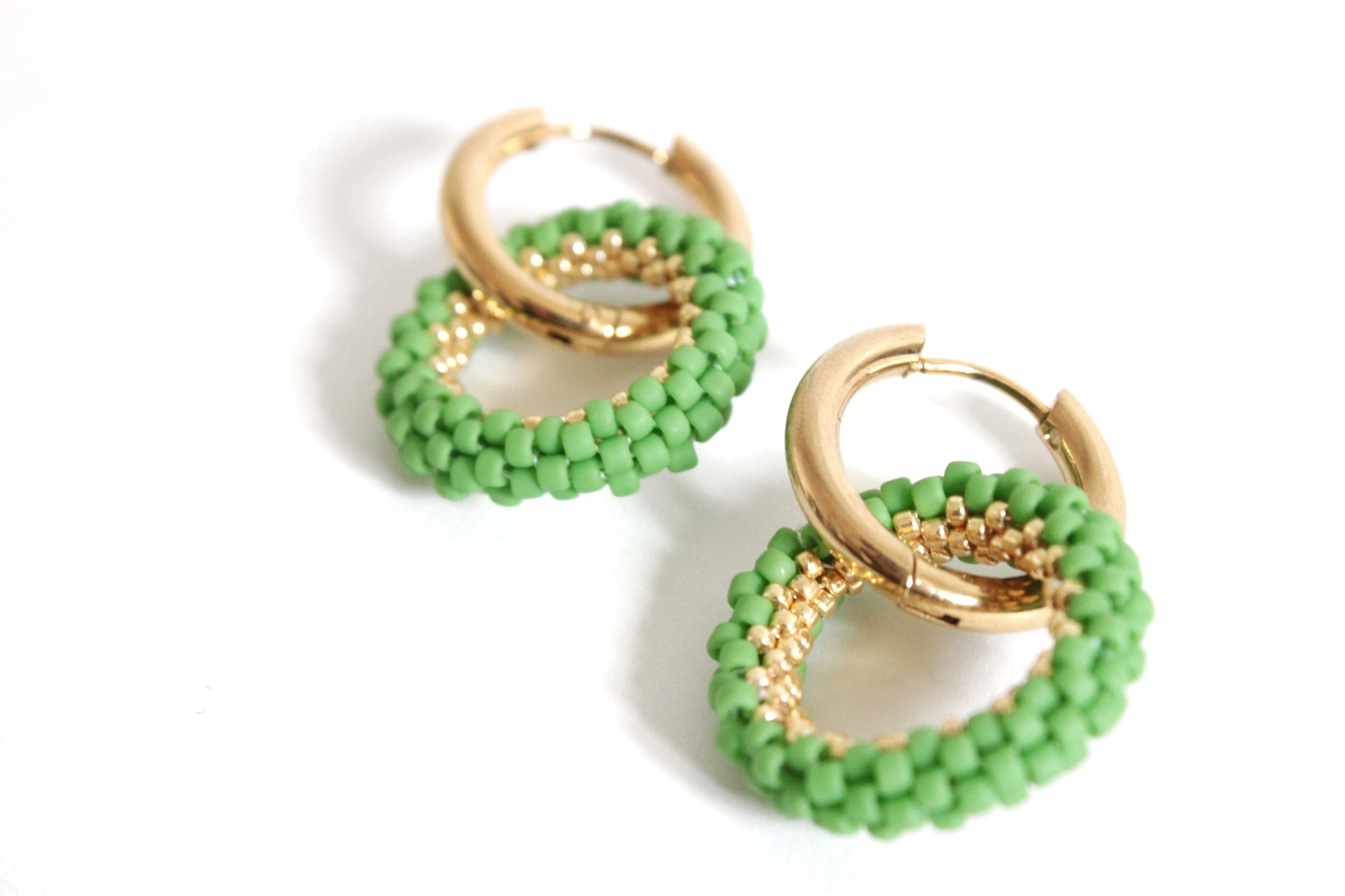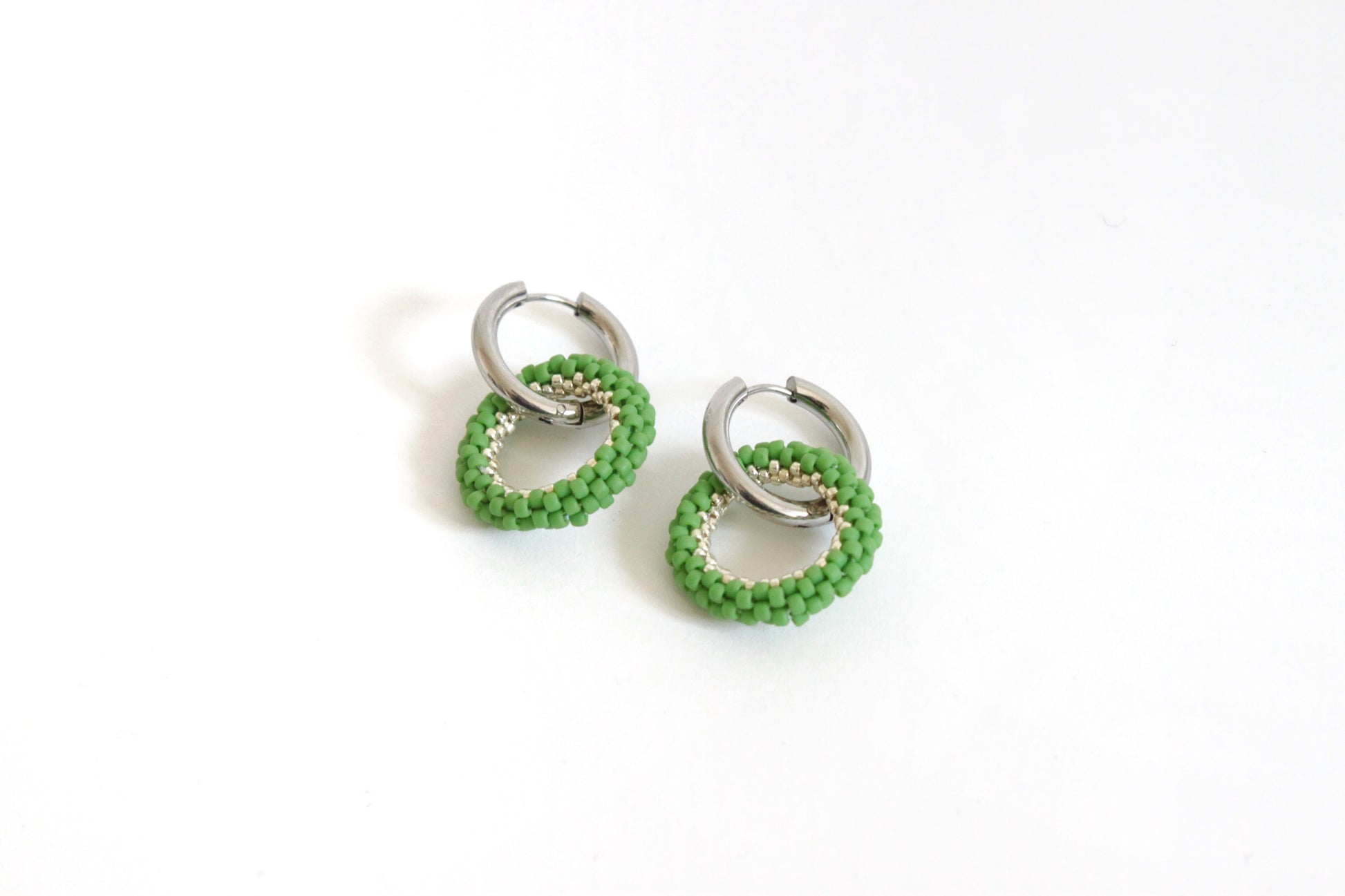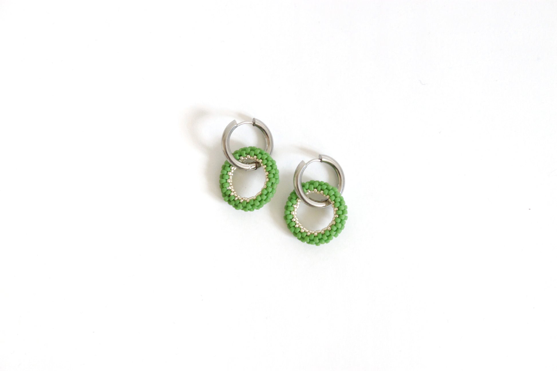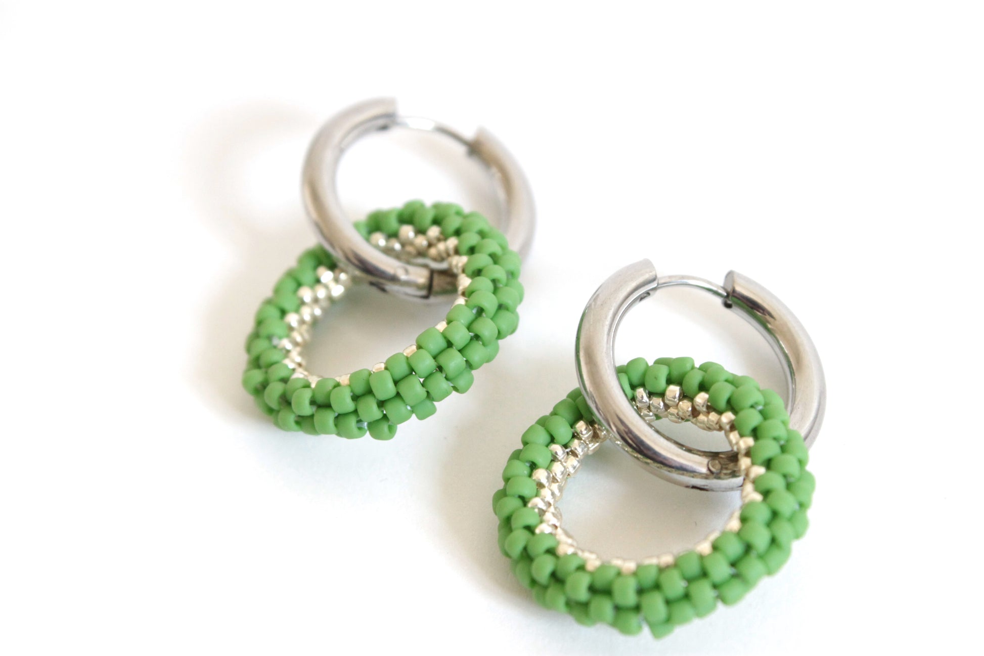 Orecchini realizzati con cerchietti in metallo argentato o dorato nikel free da 20mm intrecciati a cerchi tridimensionali da 25mm in tessitura di perline giapponesi opache nei toni del verde prato.