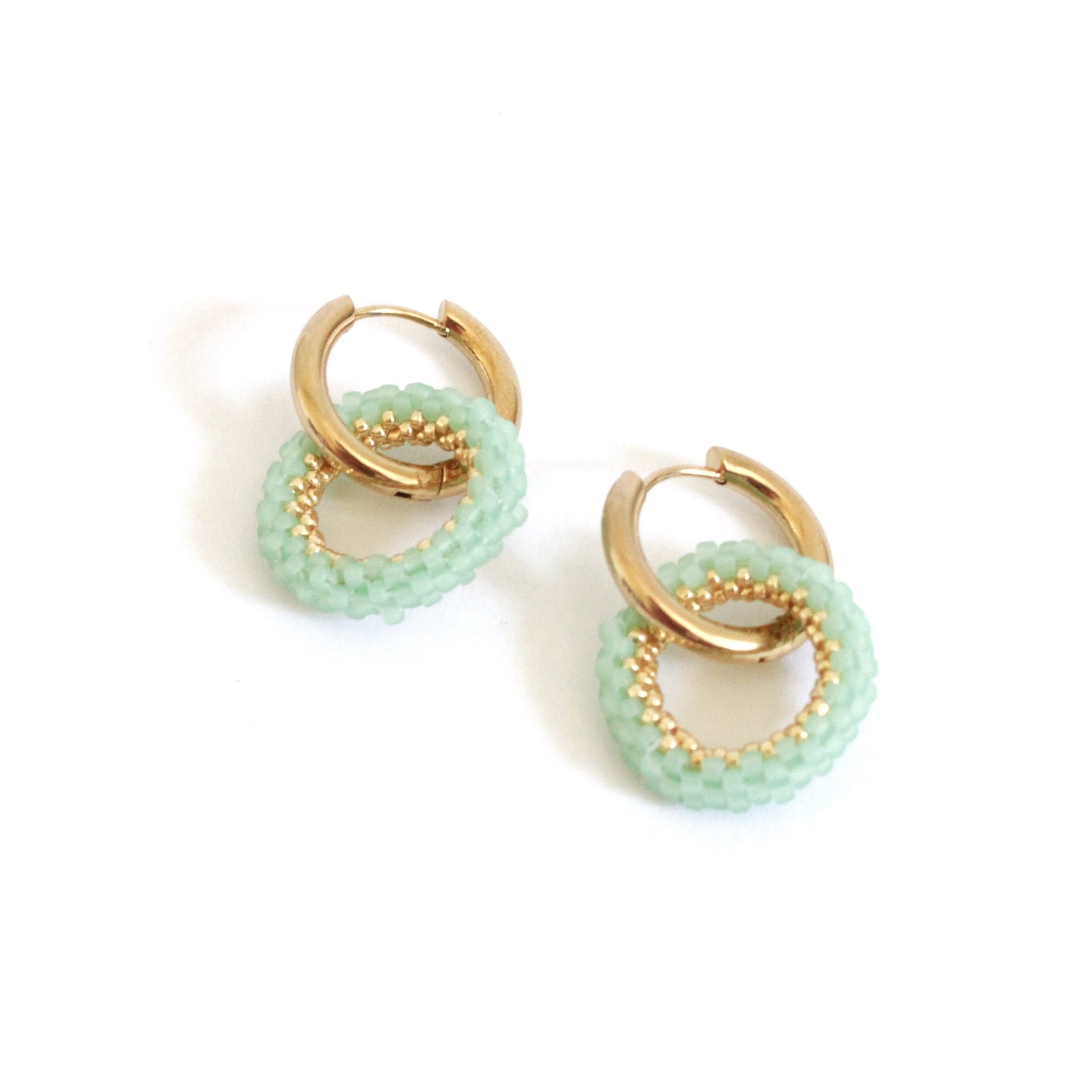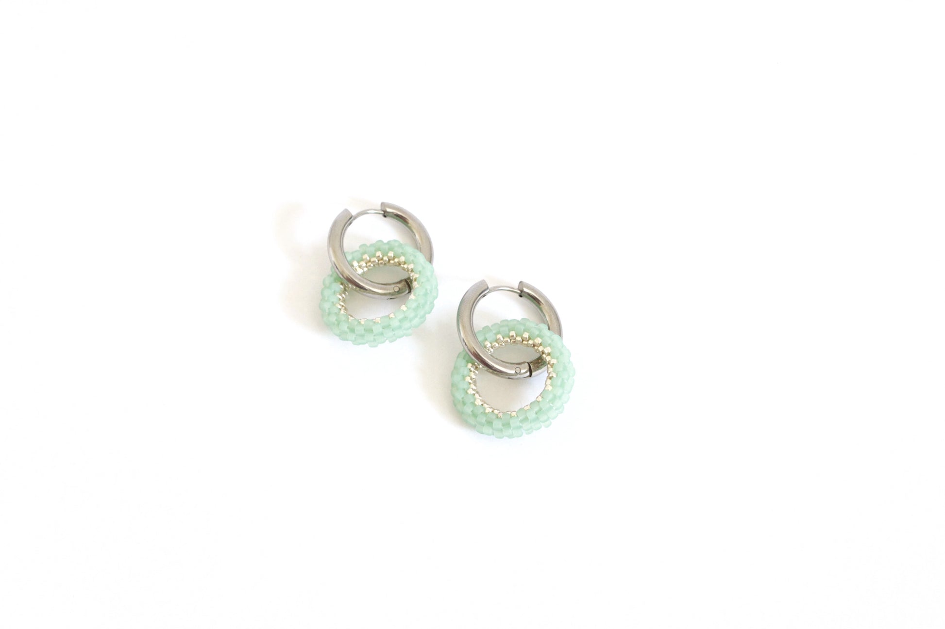 Orecchini realizzati con cerchietti in metallo argentato o dorato nikel free da 20mm intrecciati a cerchi tridimensionali da 25mm in tessitura di perline giapponesi opache nei toni del verde acqua.