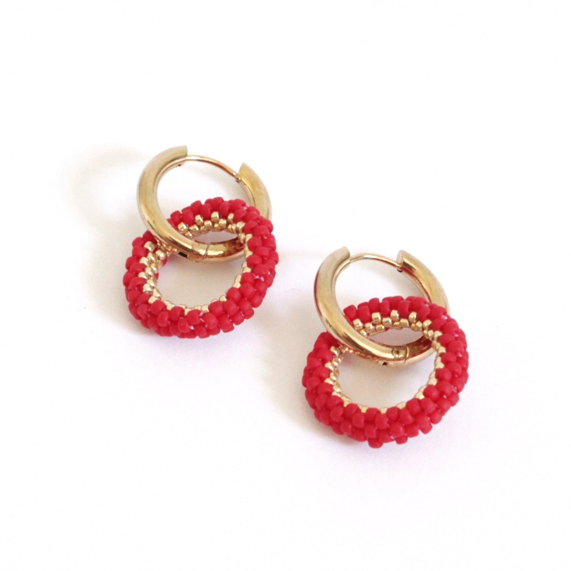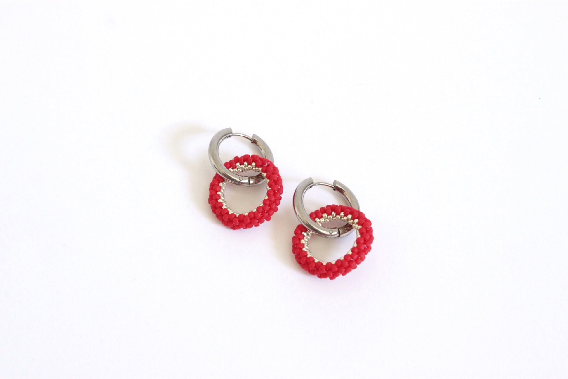 Orecchini realizzati con cerchietti in metallo argentato o dorato nikel free da 20mm intrecciati a cerchi tridimensionali da 25mm in tessitura di perline giapponesi opache nei toni del rosso corallo.