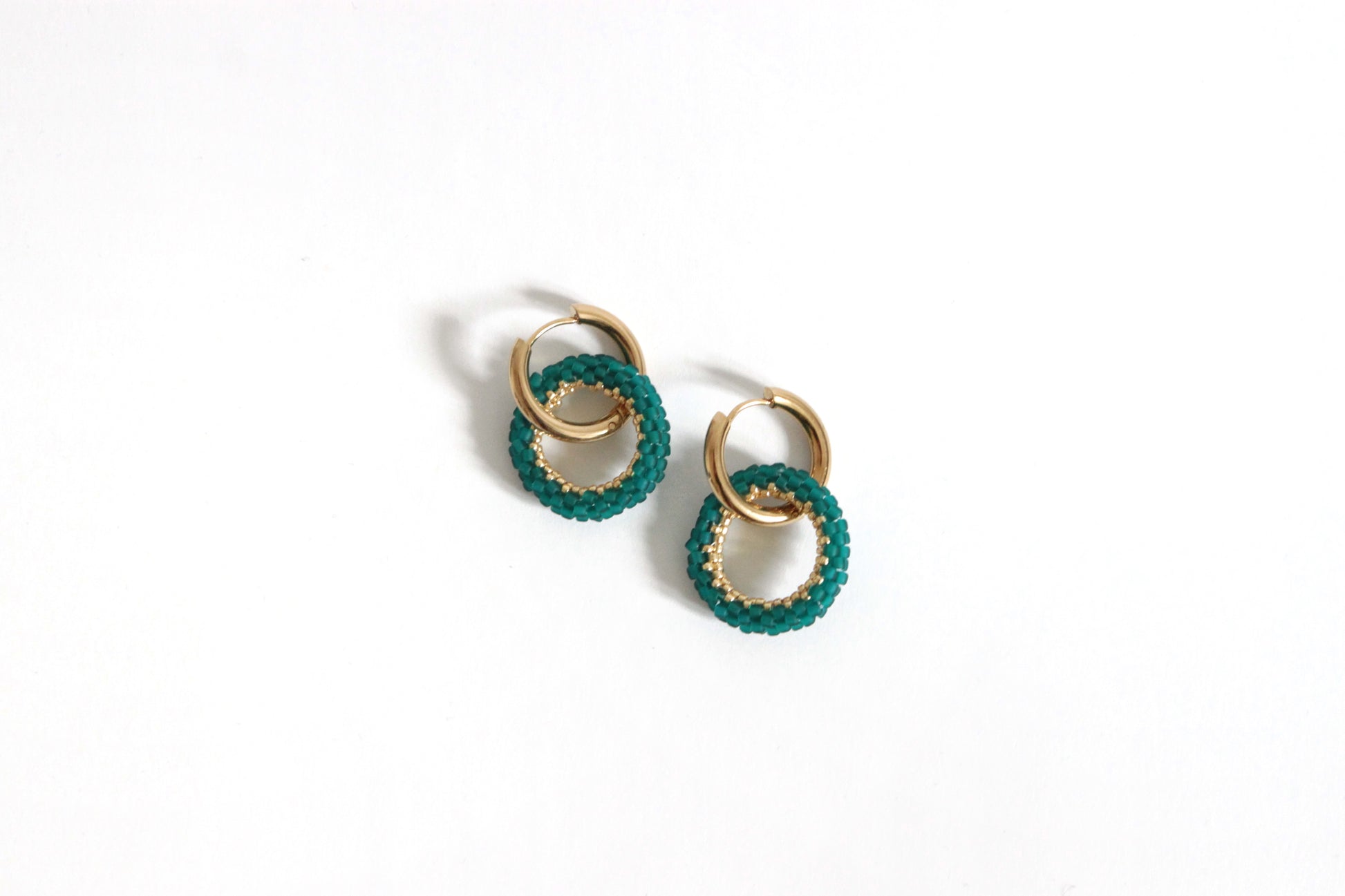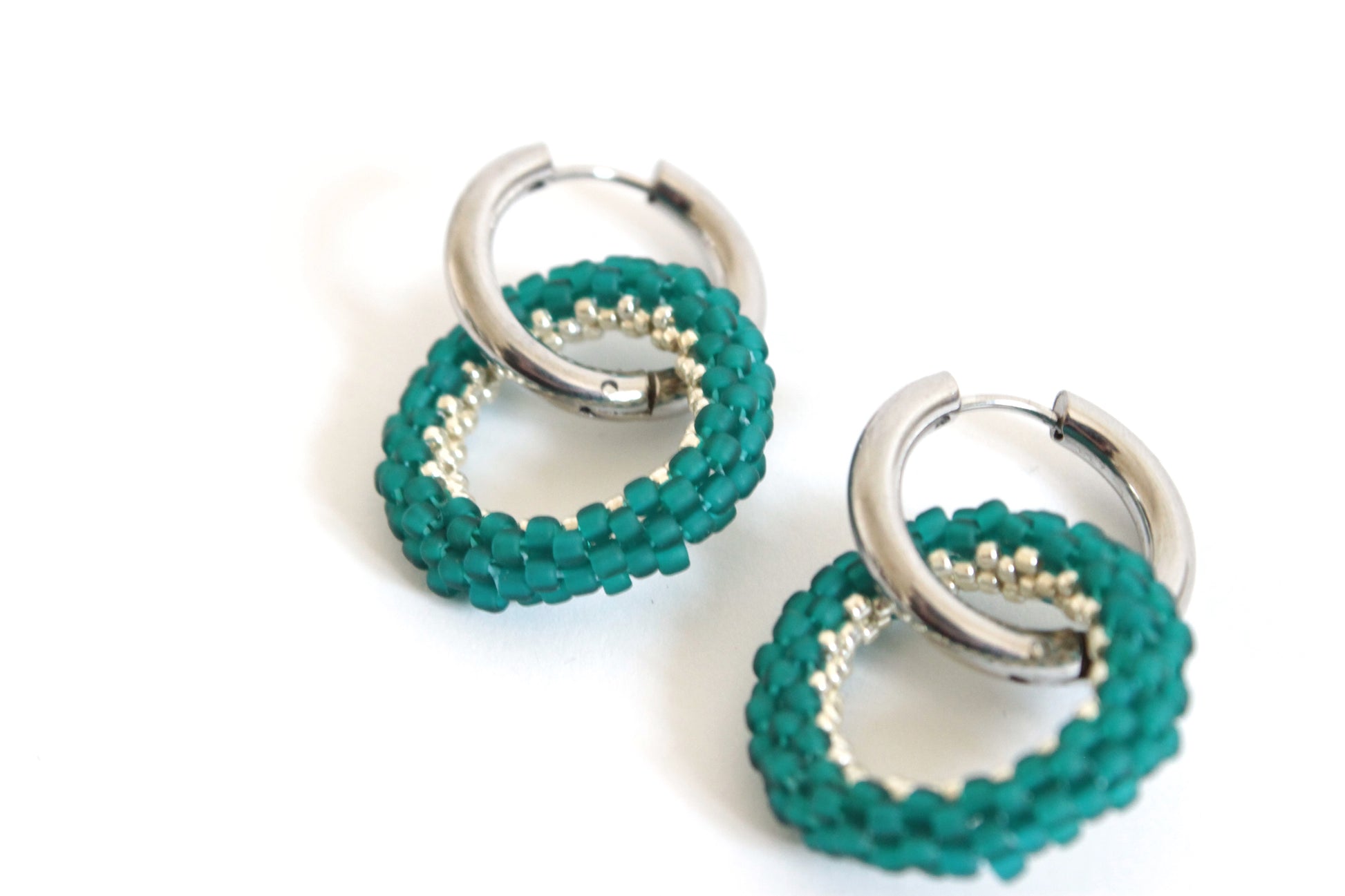 Orecchini realizzati con cerchietti in metallo argentato o dorato nikel free da 20mm intrecciati a cerchi tridimensionali da 25mm in tessitura di perline giapponesi opache nei toni petrolio.