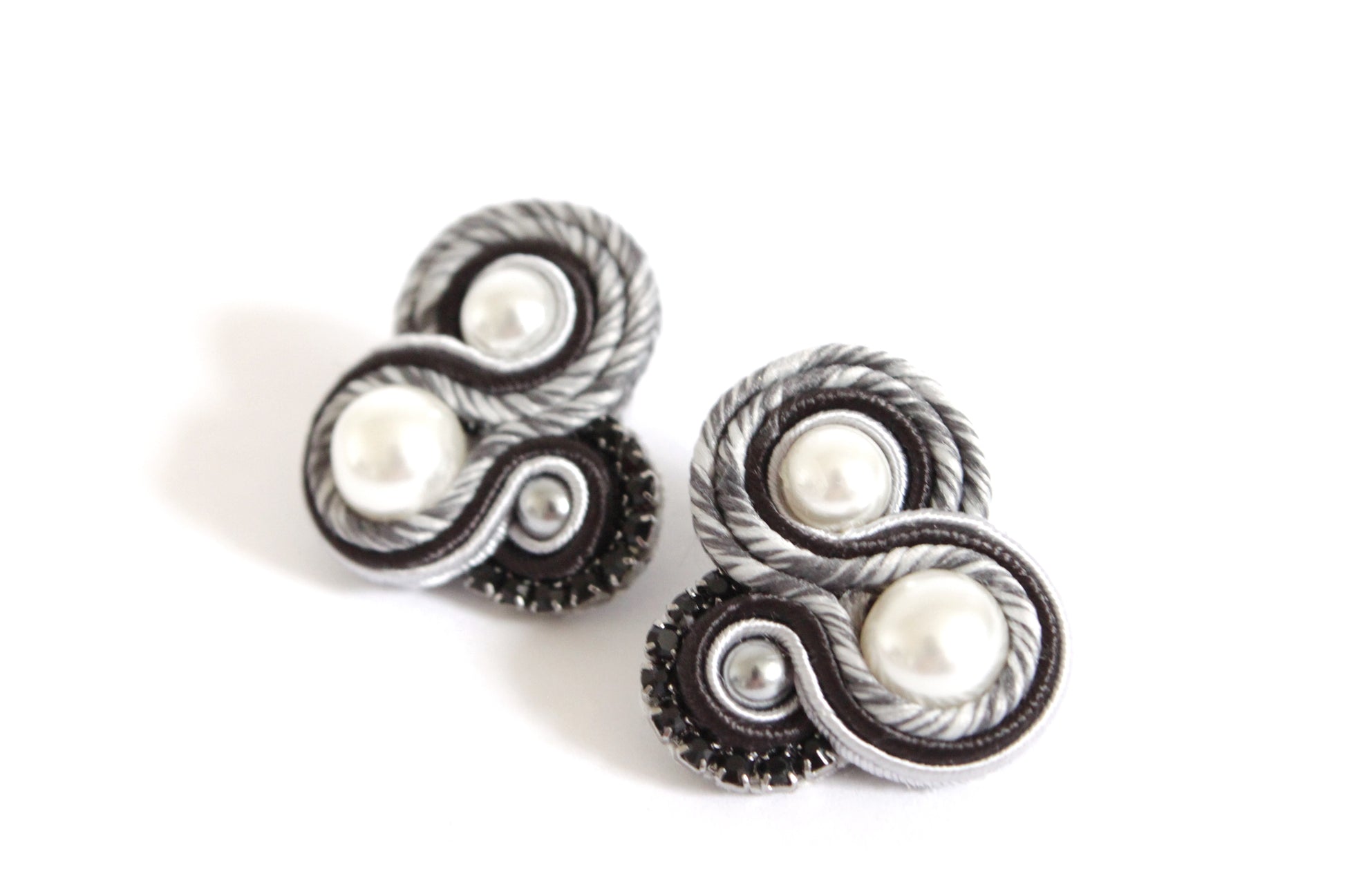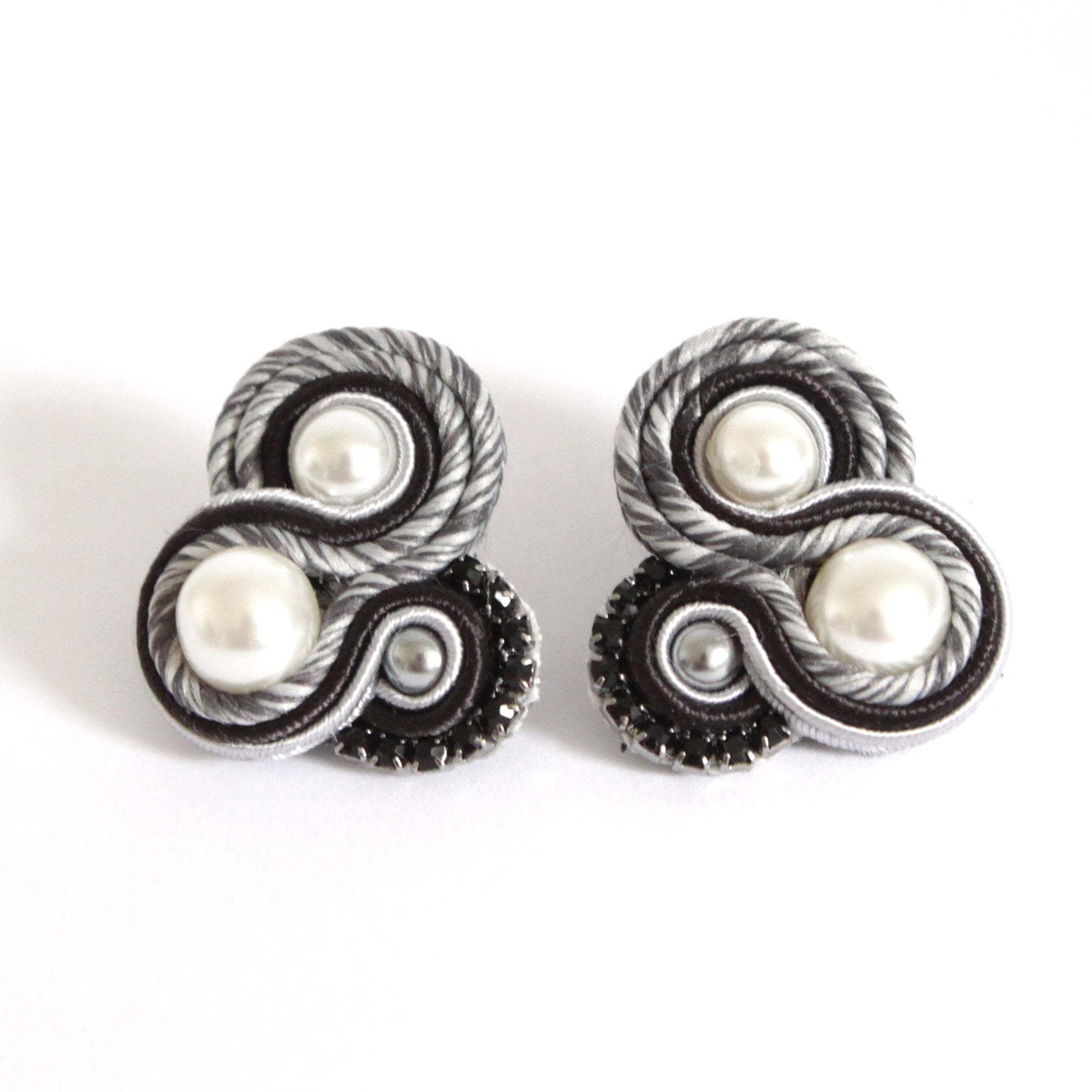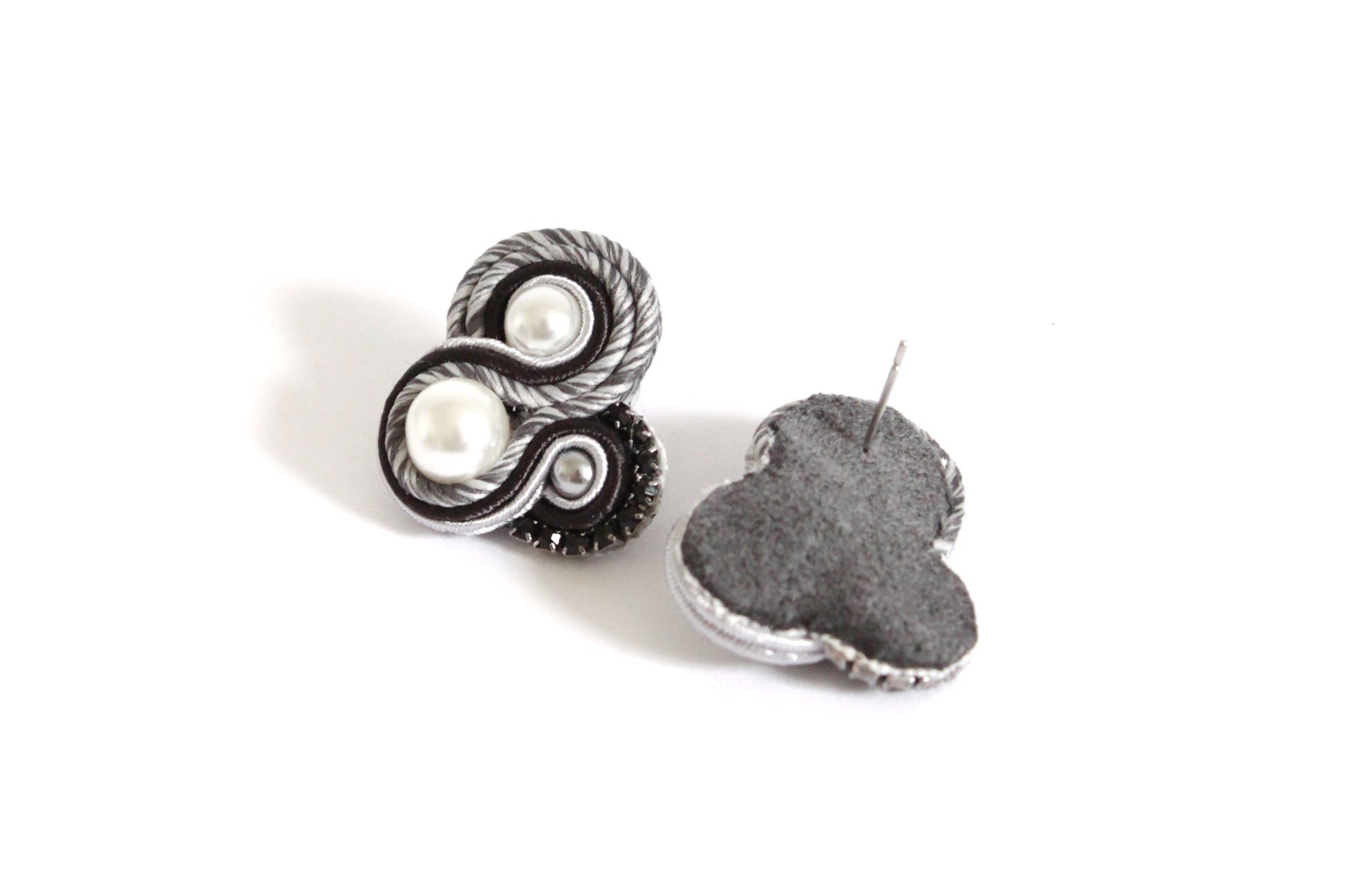 Orecchini realizzati in tecnica soutache, con piattine di seta nei colori grigio mélange, nero e argento, perle di vetro e catena strass Swarovski.