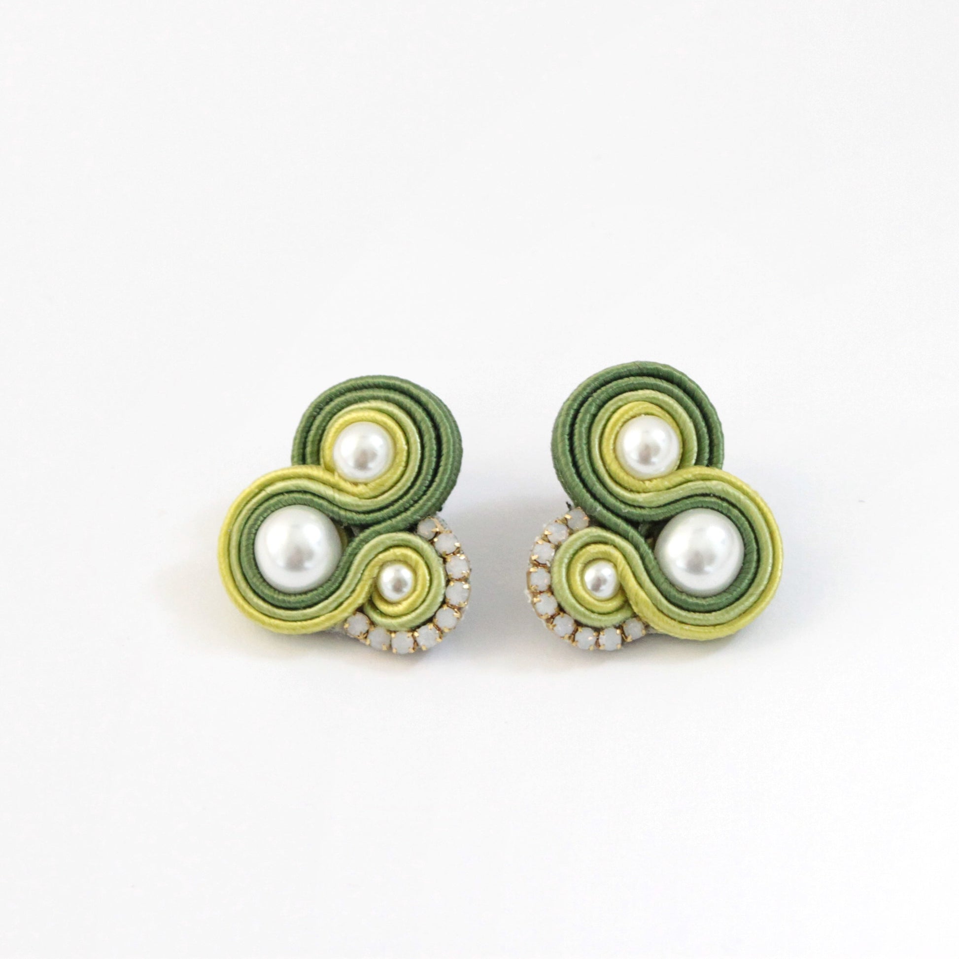 Orecchini realizzati in tecnica soutache, con piattine di seta nei colori verde prato, oliva e lime, perle di vetro e catena strass Swarovski.