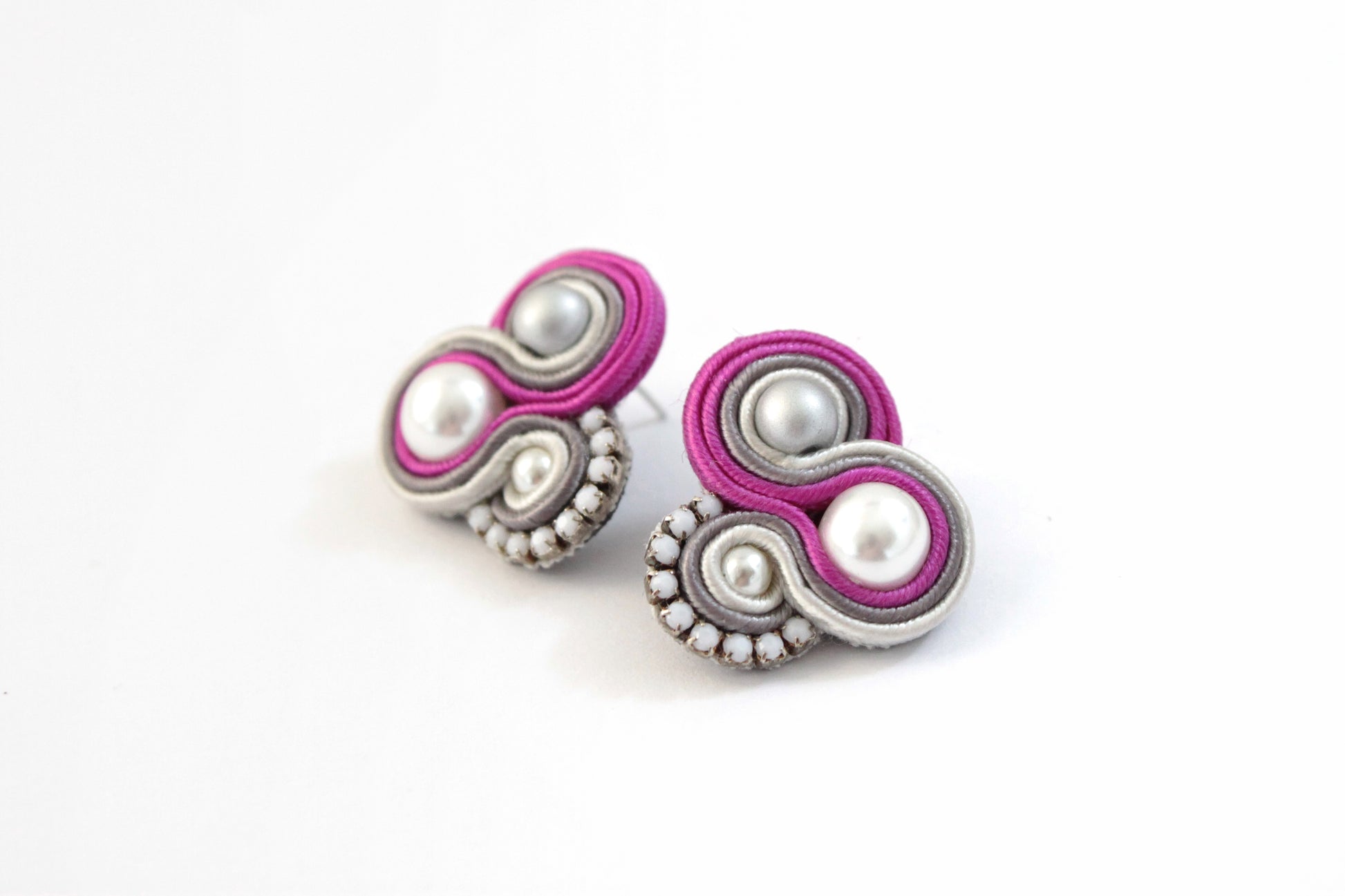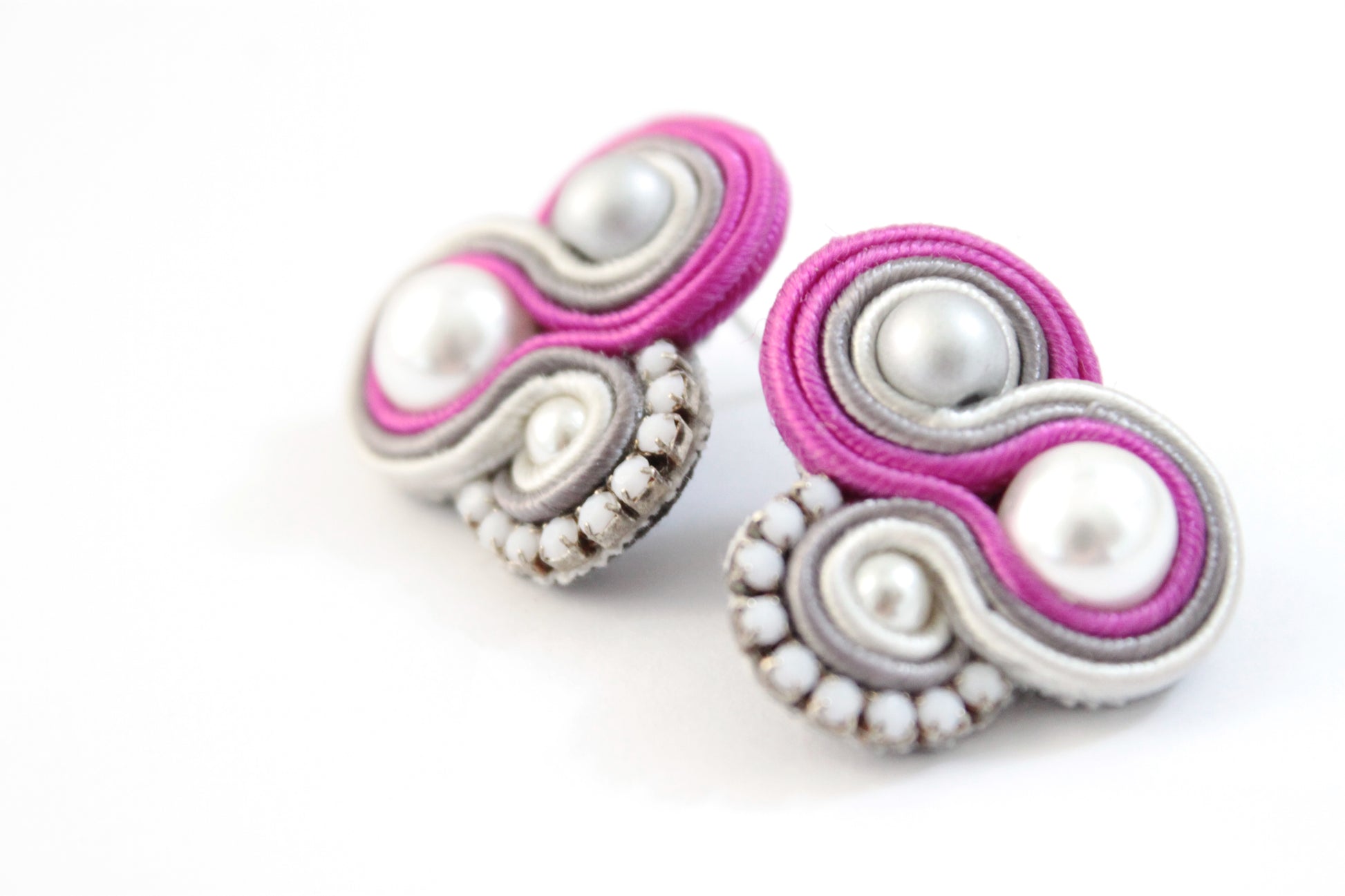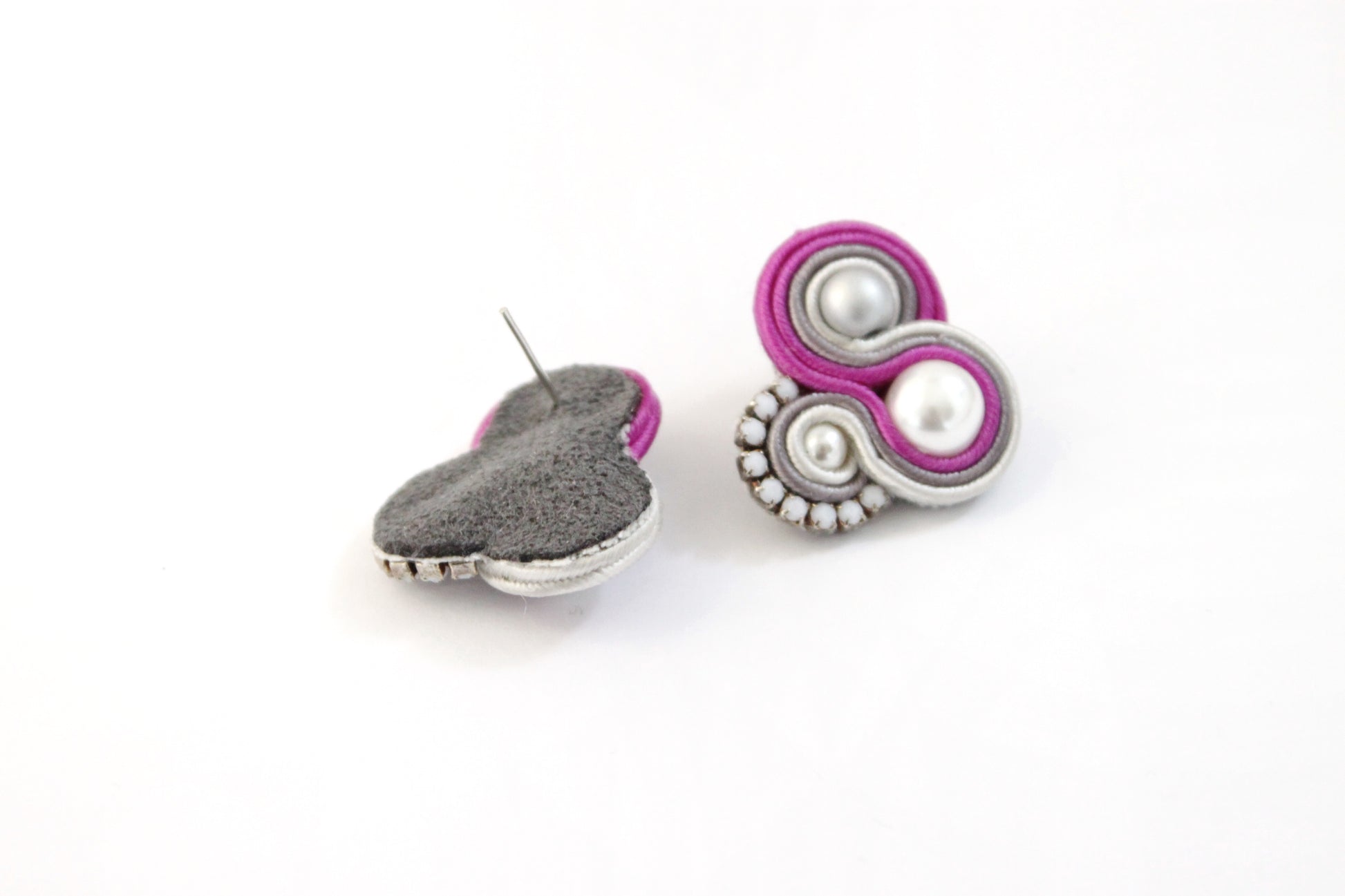 Orecchini realizzati in tecnica soutache, con piattine di seta nei colori ciclamino, grigio basalto e perla, perle di vetro e catena strass Swarovski.
