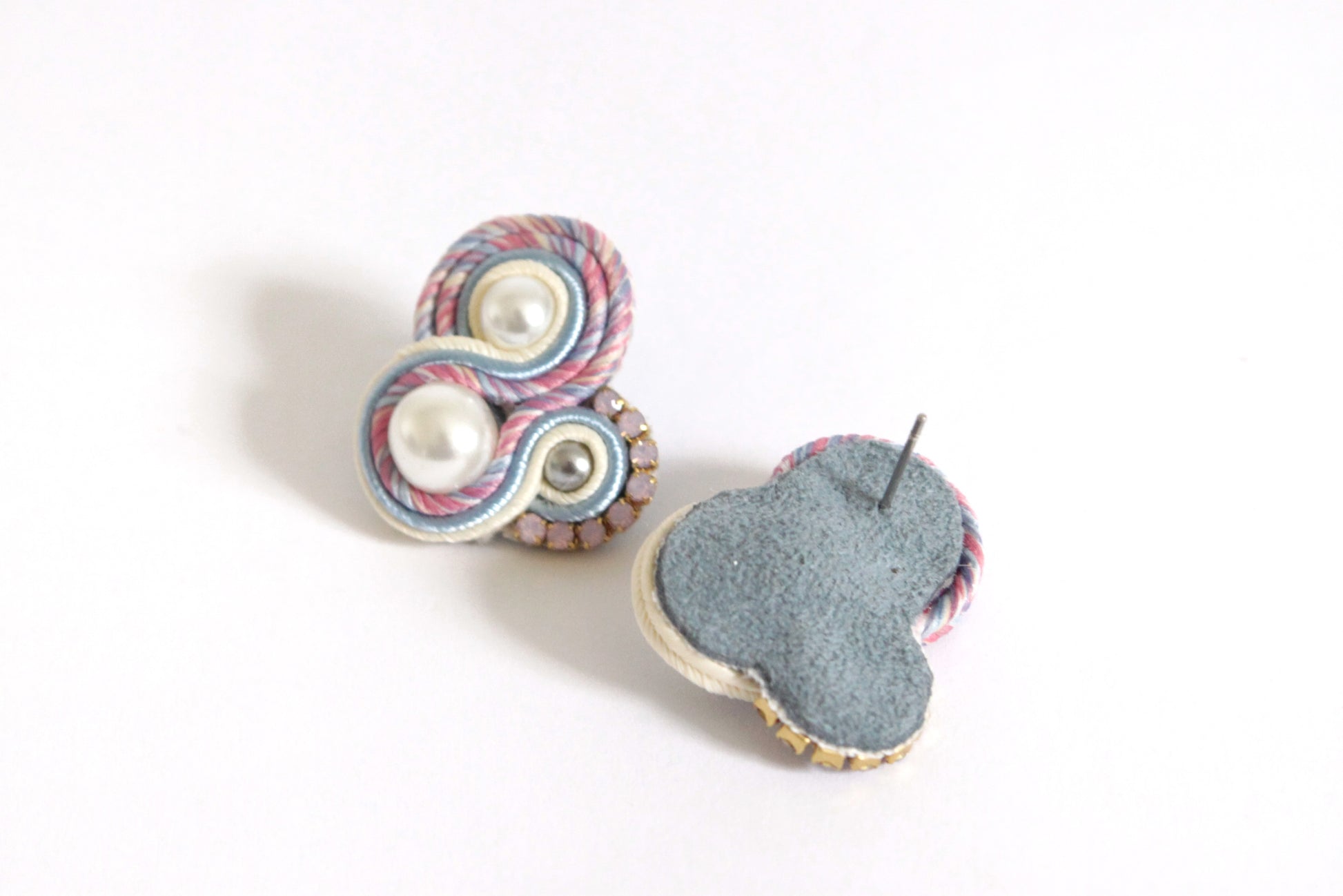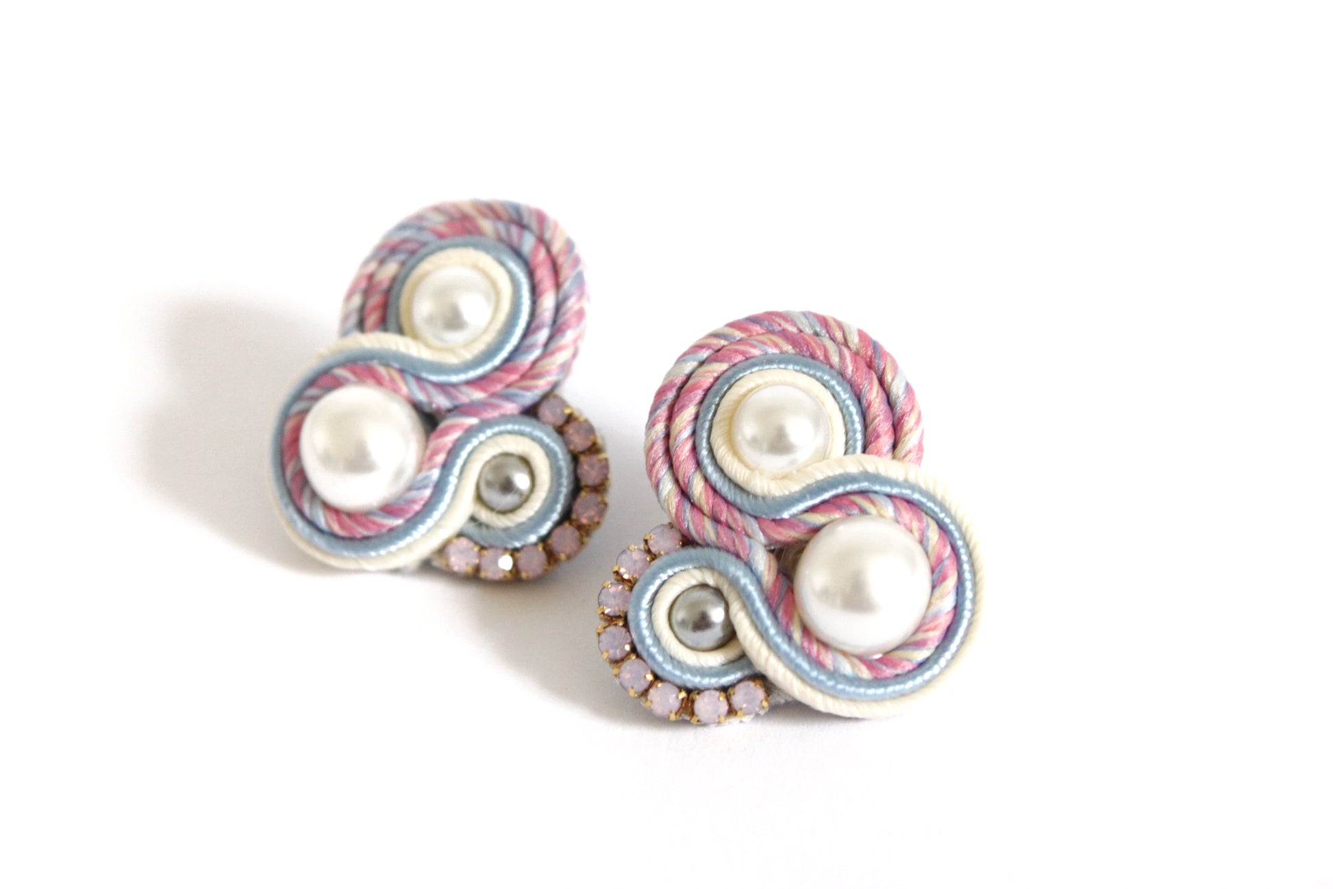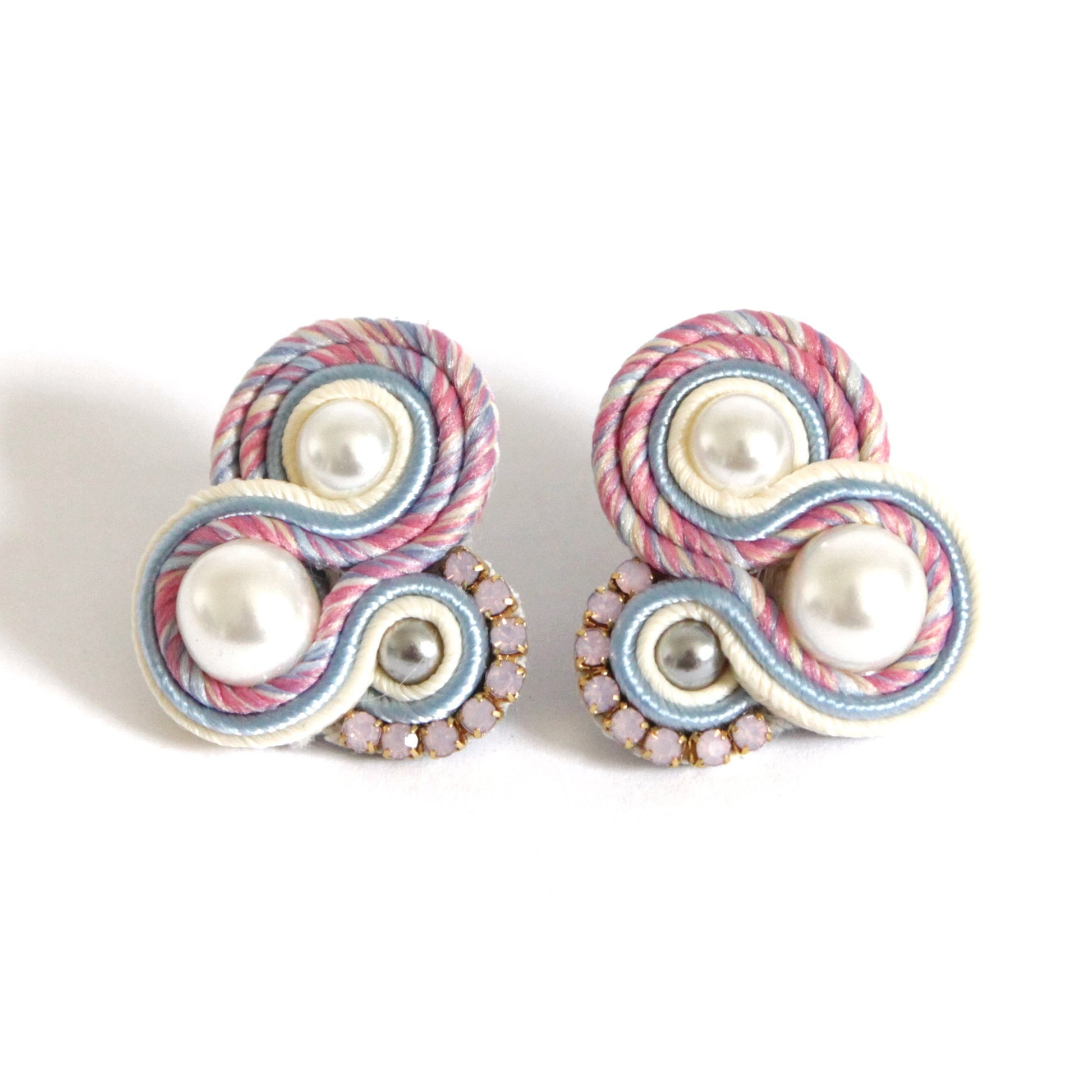 Orecchini realizzati in tecnica soutache, con piattine di seta nei colori rosa mélange, carta da zucchero e avorio, perle di vetro e catena strass Swarovski.