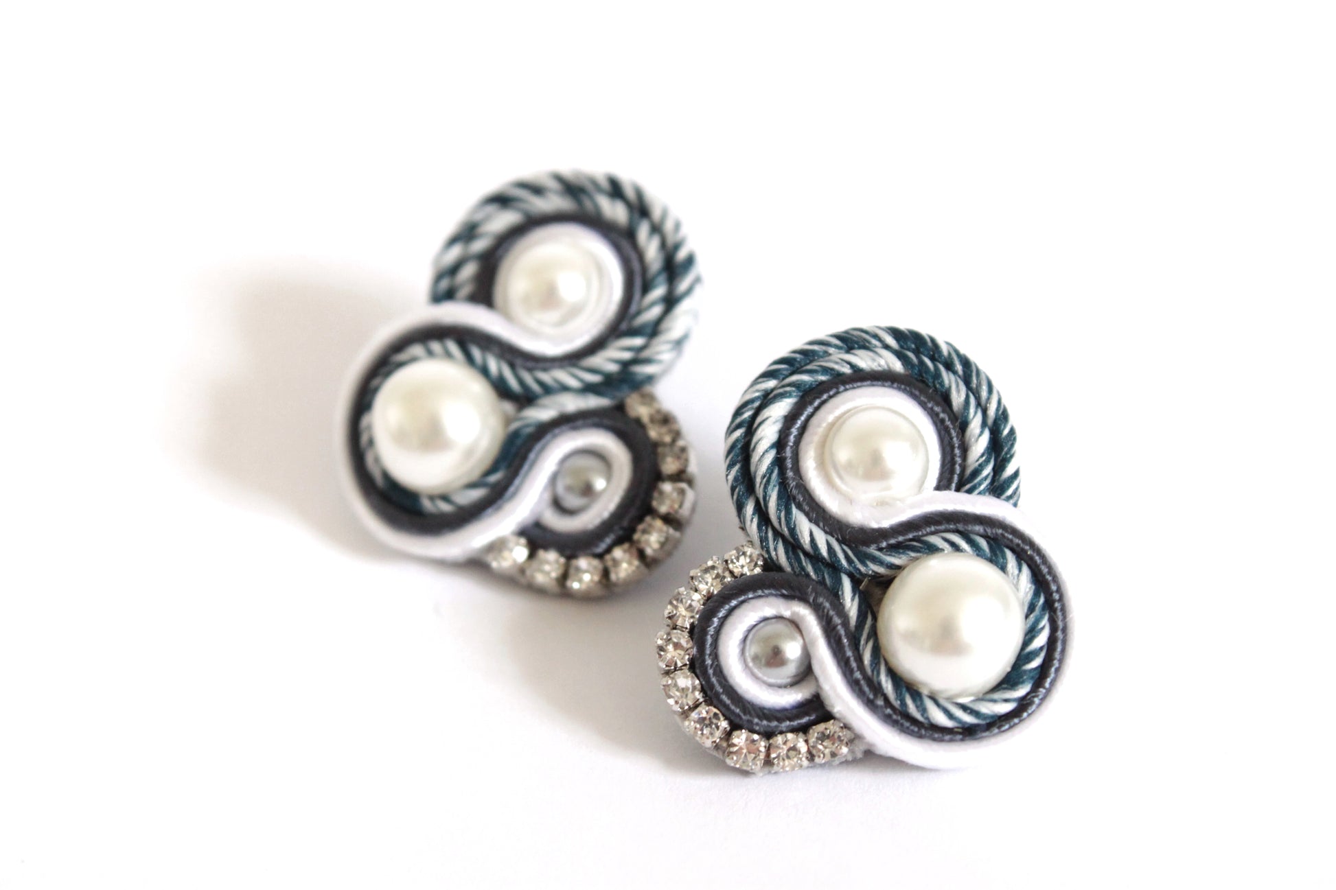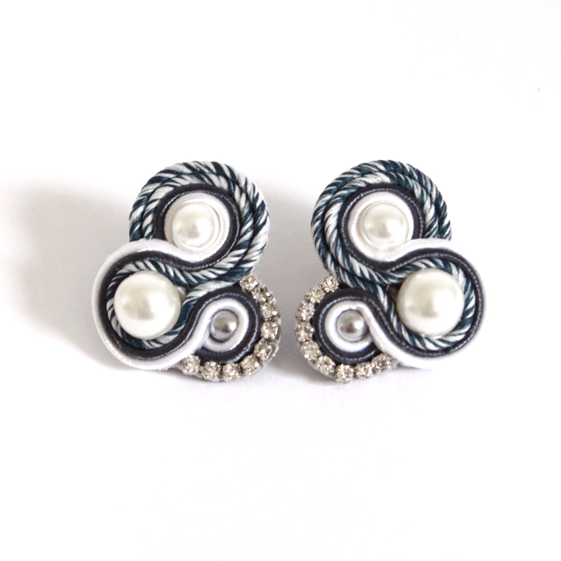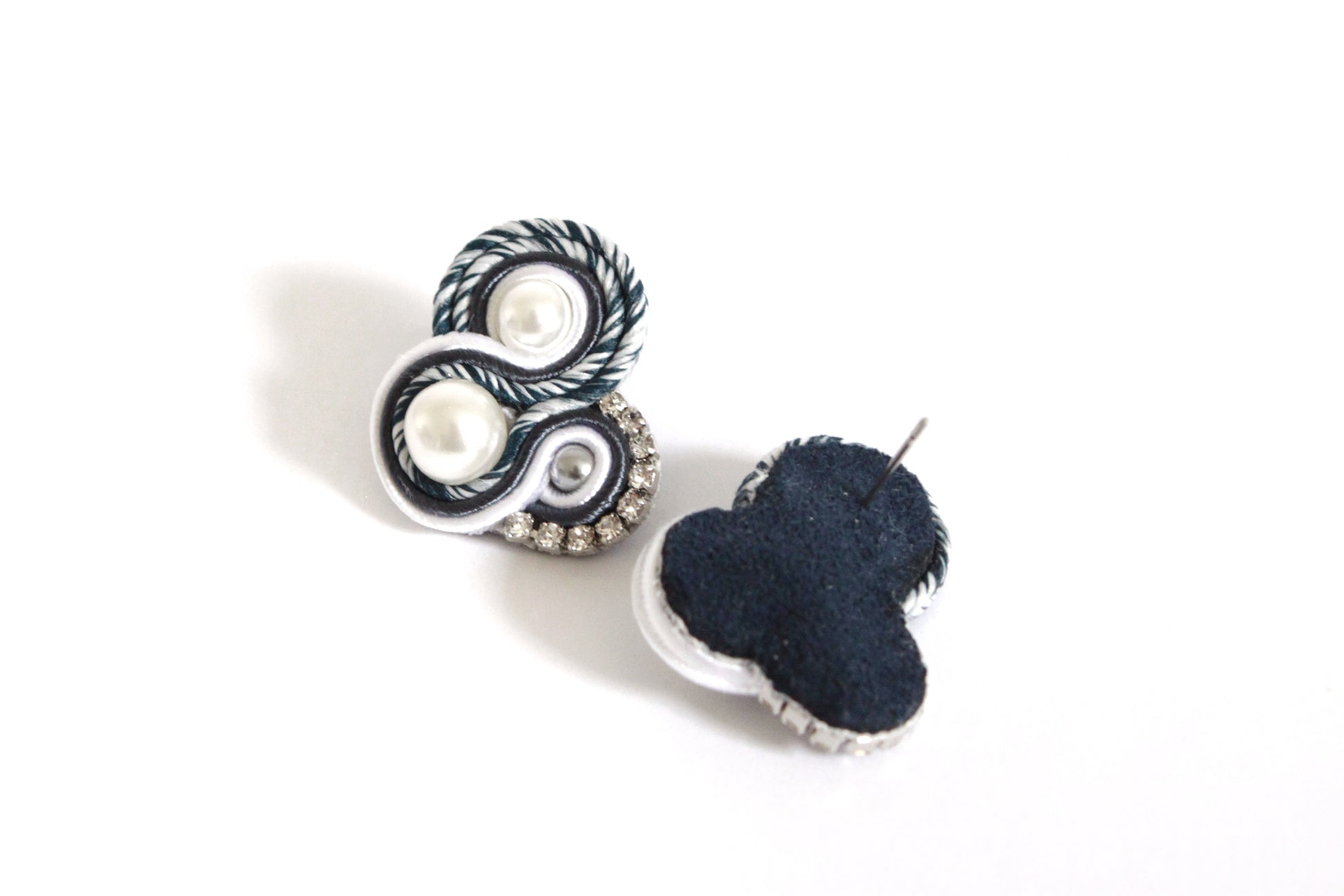 Orecchini realizzati in tecnica soutache, con piattine di seta nei colori blu notte mélange e bianco, perle di vetro e catena strass Swarovski.