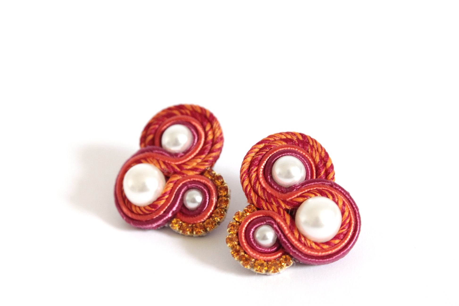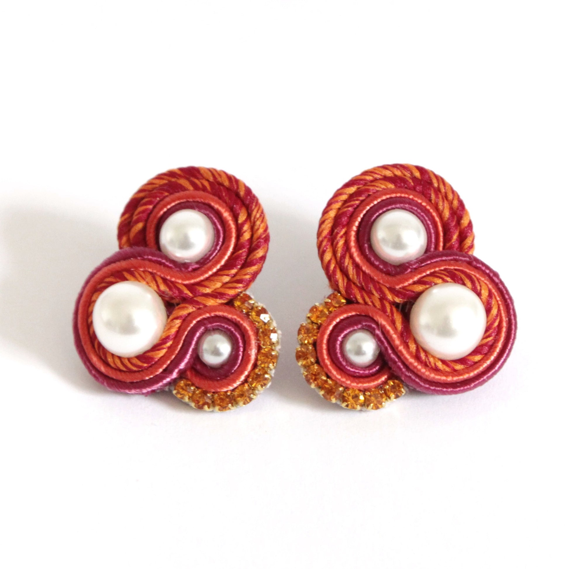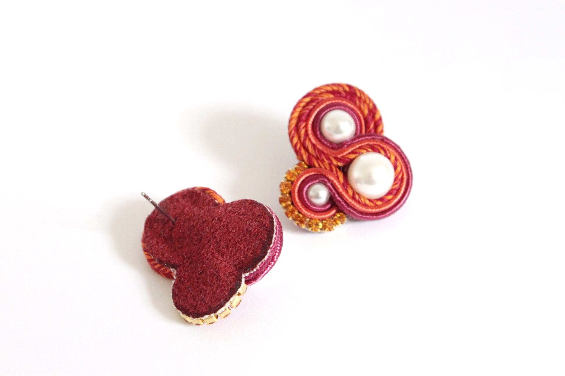 Orecchini realizzati in tecnica soutache, con piattine di seta nei colori arancio zucca mélange e borgogna, perle di vetro e catena strass Swarovski.