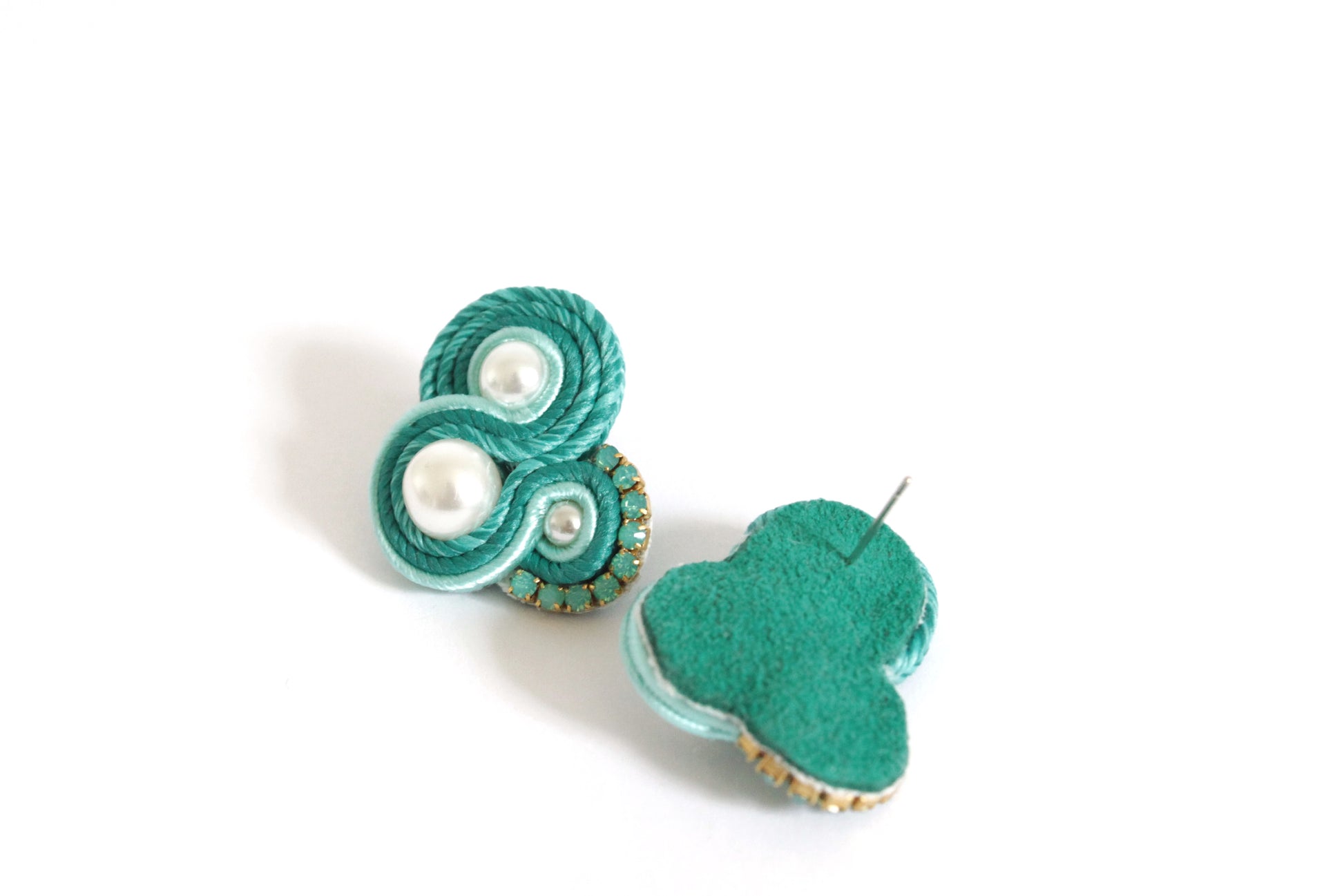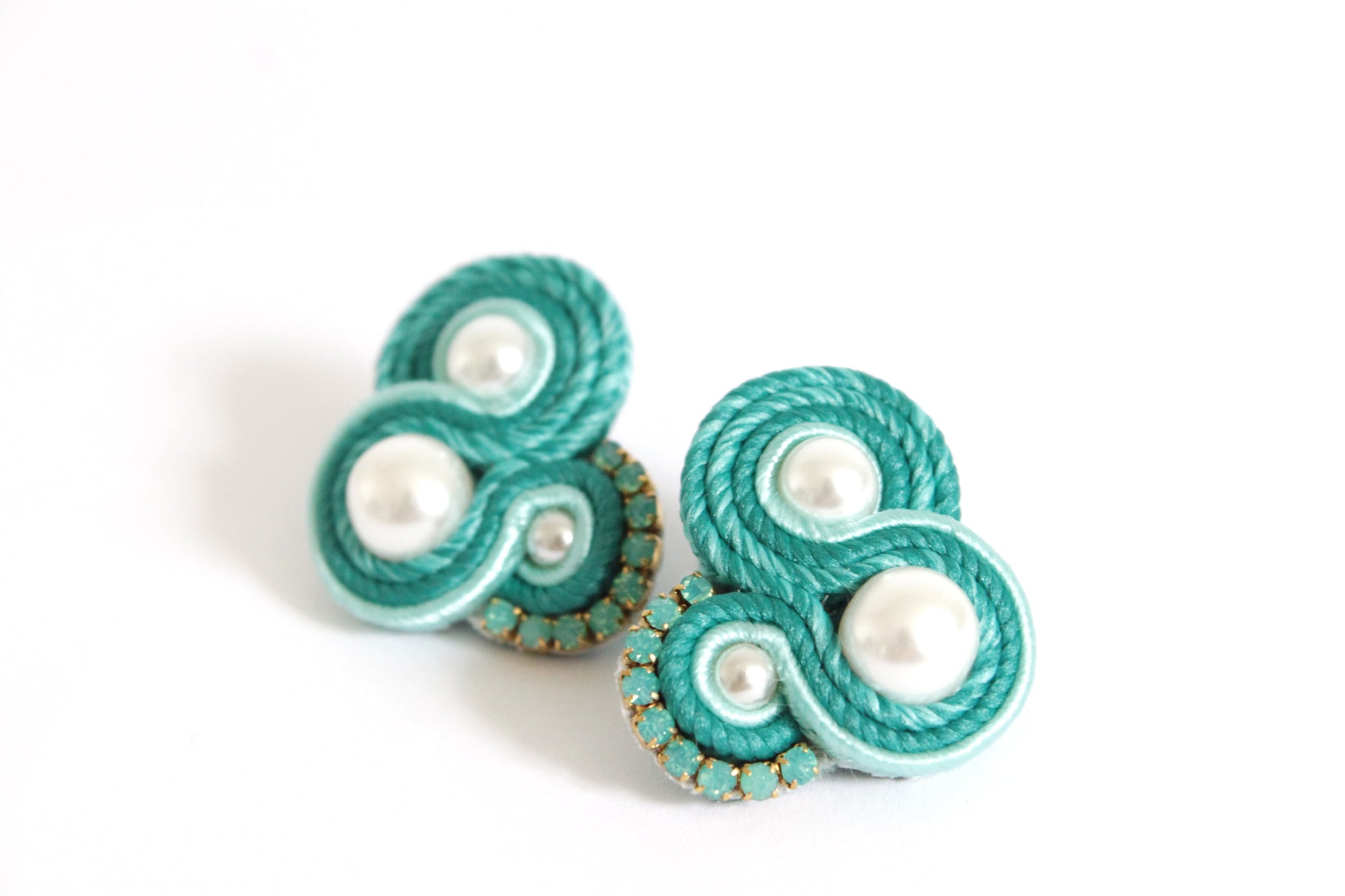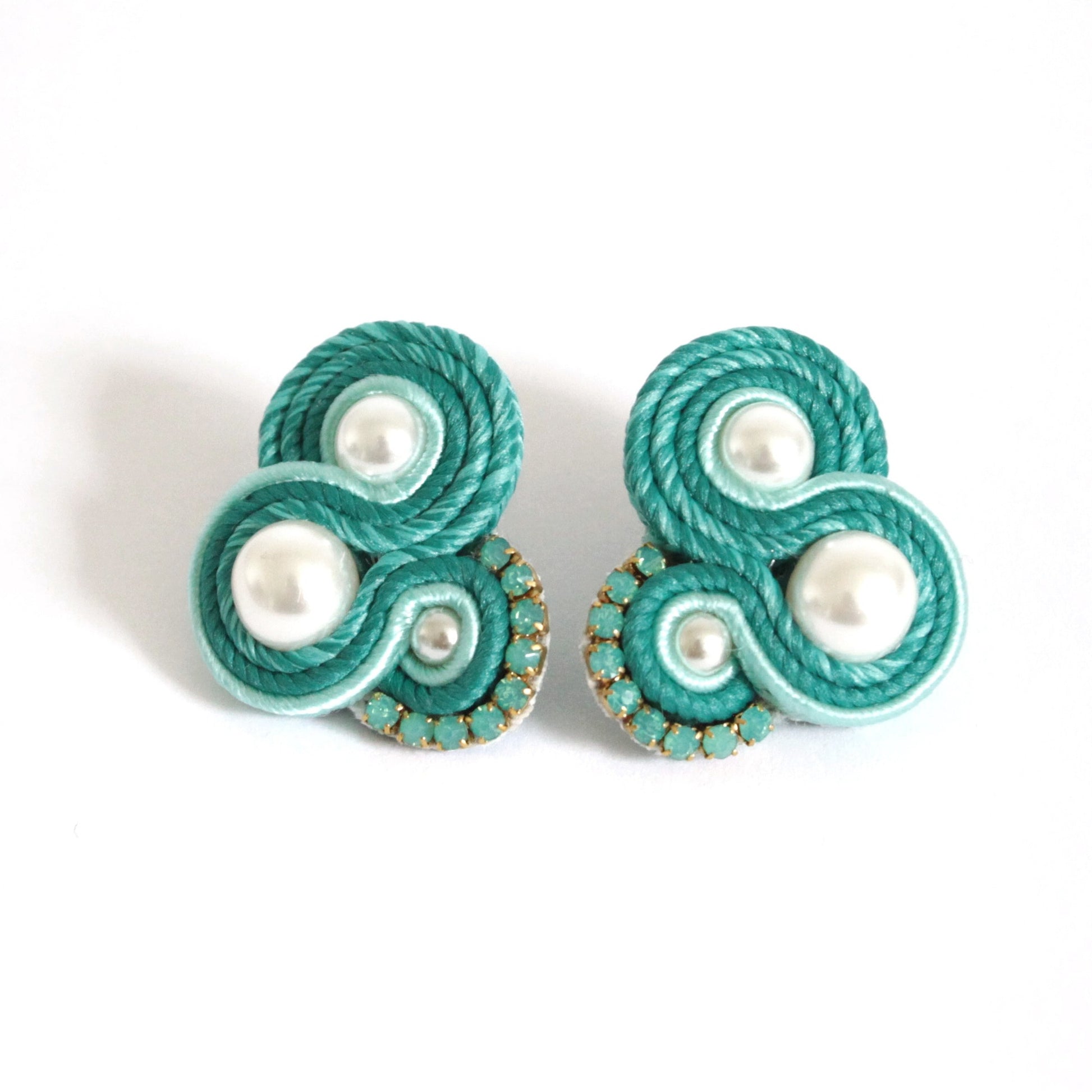 Orecchini realizzati in tecnica soutache, con piattine di seta nei colori petrolio mélange e verde acqua, perle di vetro e catena strass Swarovski.
