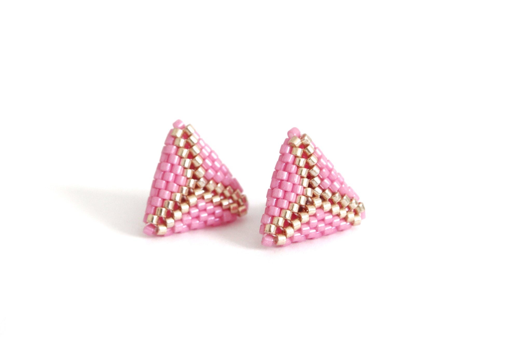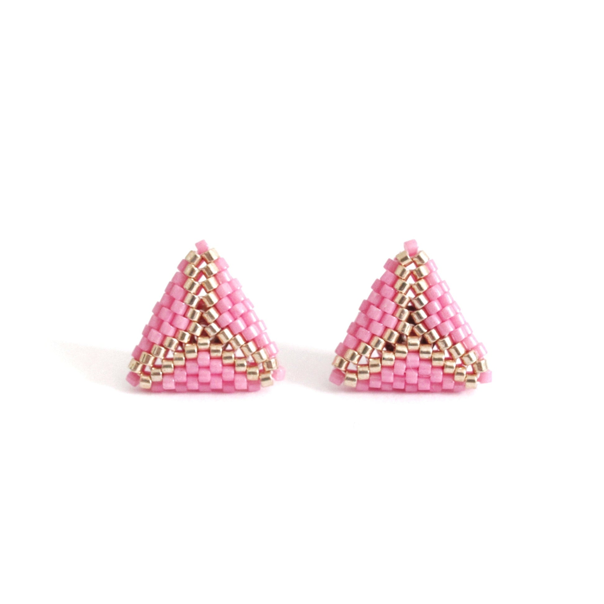 Orecchini al lobo leggermente bombati a forma di prisma, realizzati in tessitura di perline giapponesi miyuki color rosa confetto, con perline centrali metallizzate color champagne, per donare luminosità con una tonalità neutra. Perno centrale in acciaio nikel free.