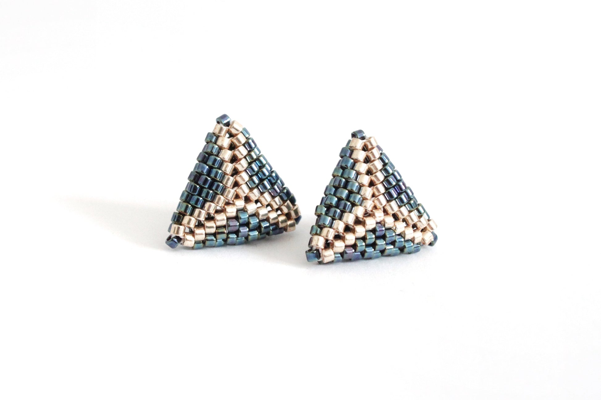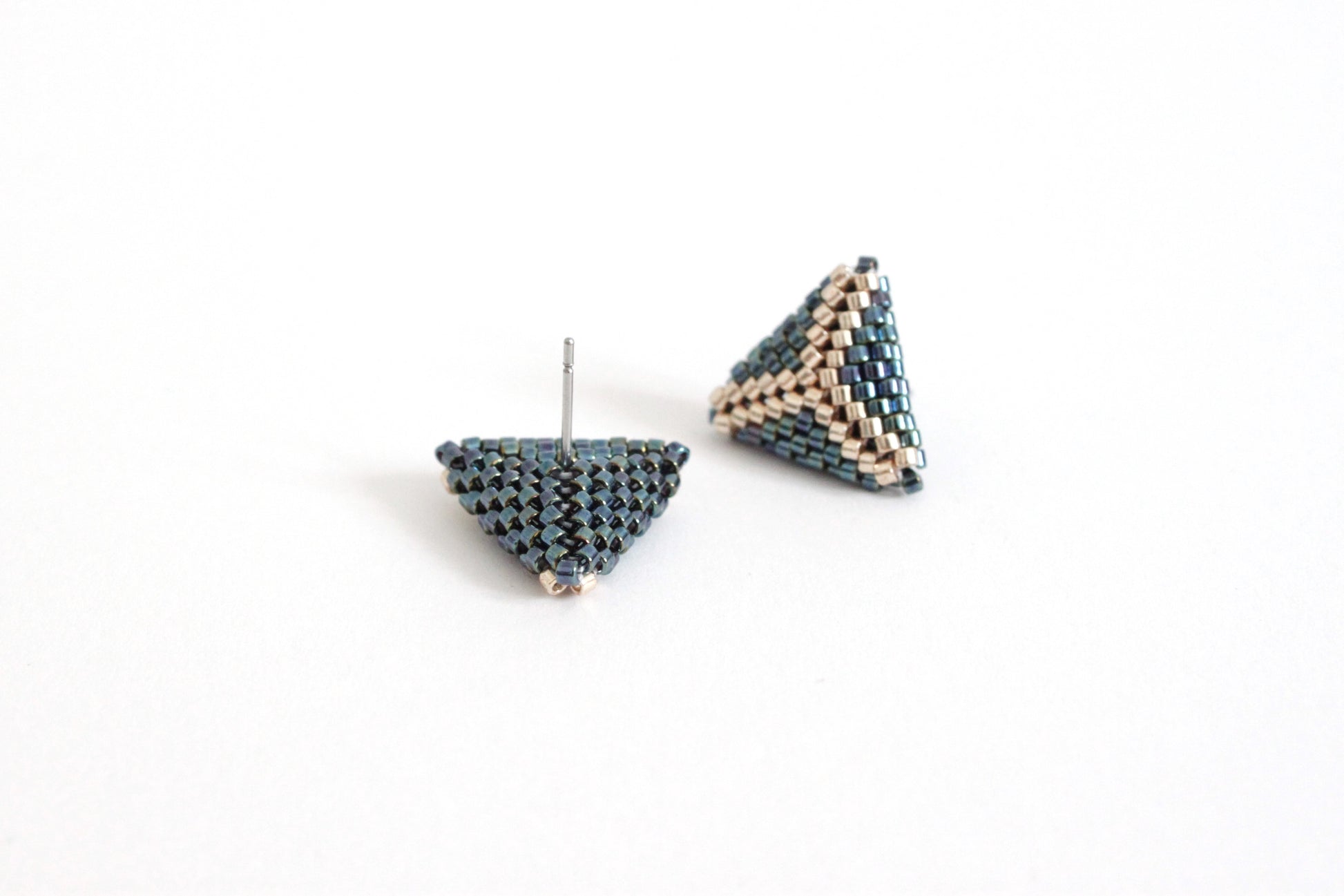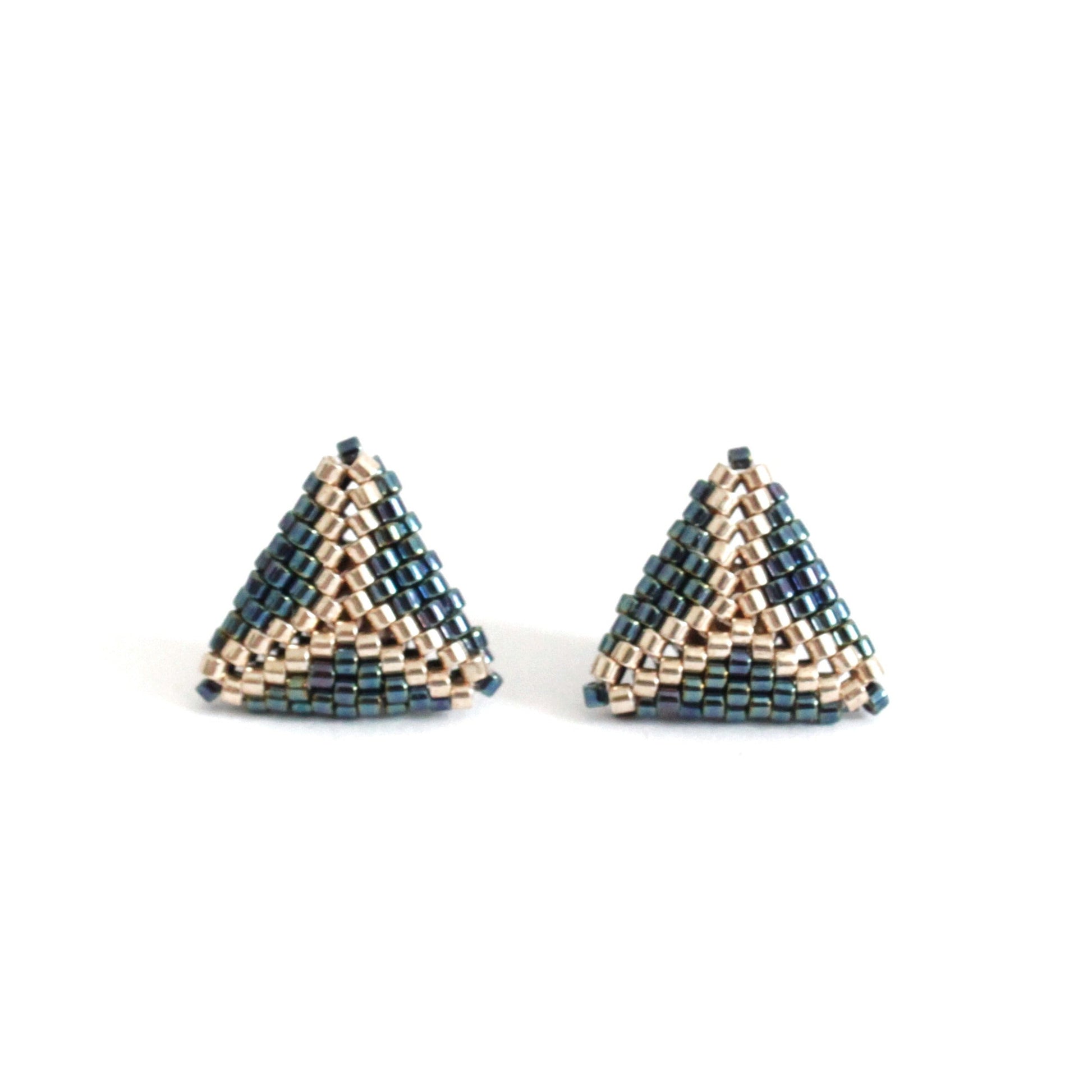 Orecchini al lobo leggermente bombati a forma di prisma, realizzati in tessitura di perline giapponesi miyuki color metallo ematite, con perline centrali metallizzate color champagne, per donare luminosità con una tonalità neutra. Perno centrale in acciaio nikel free.
