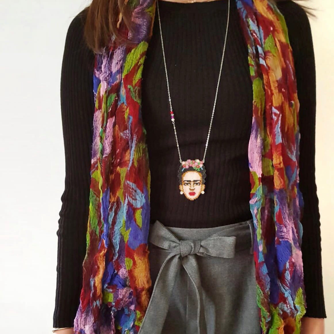 Ciondolo raffigurante Frida Kahlo, realizzato in tessitura di perline giapponesi delica Miyuki.