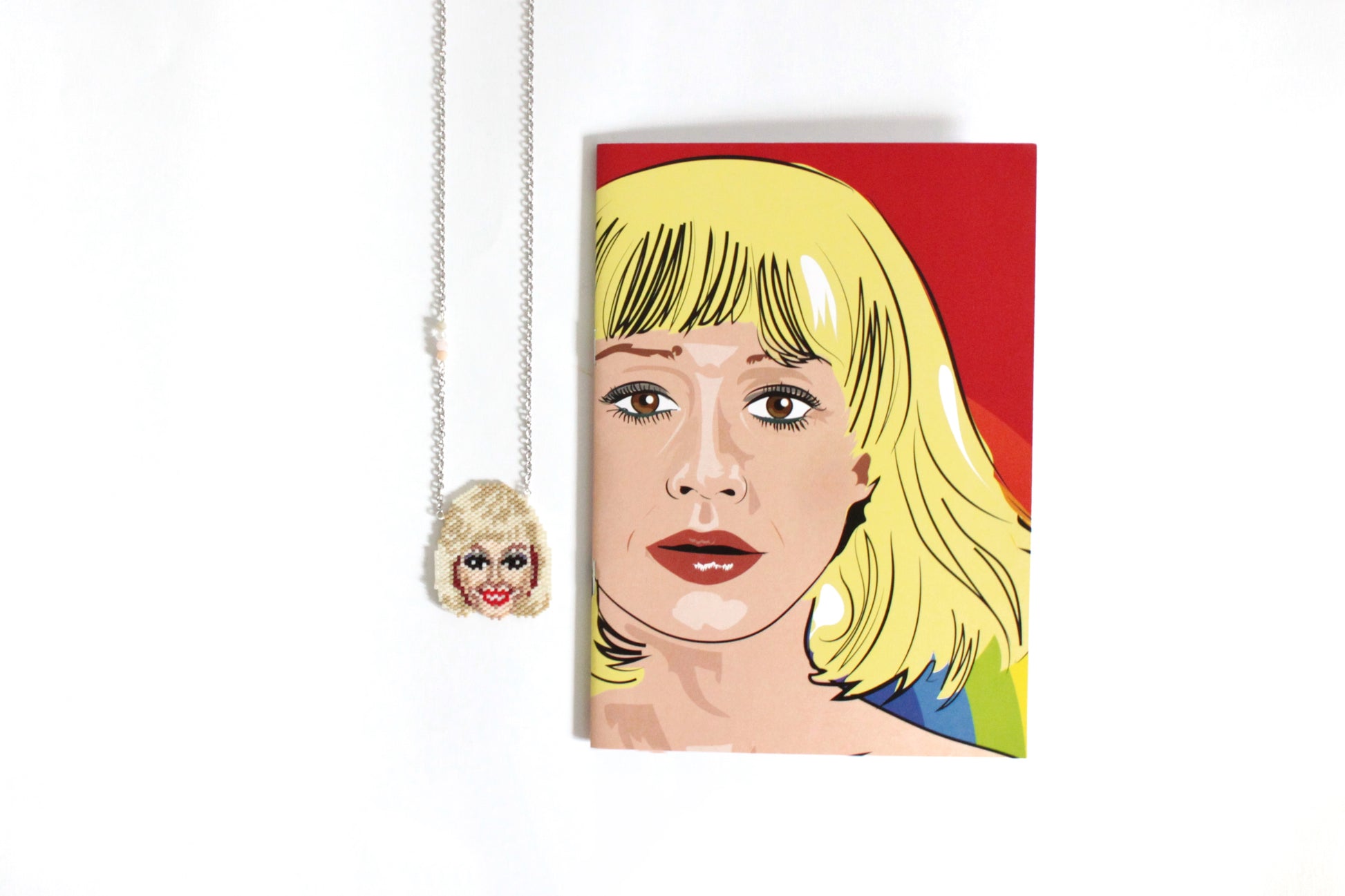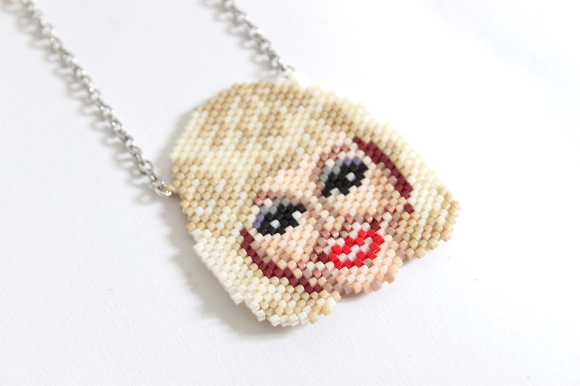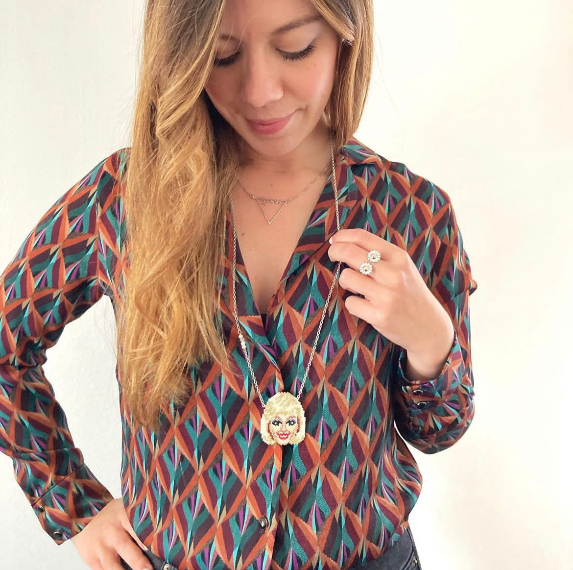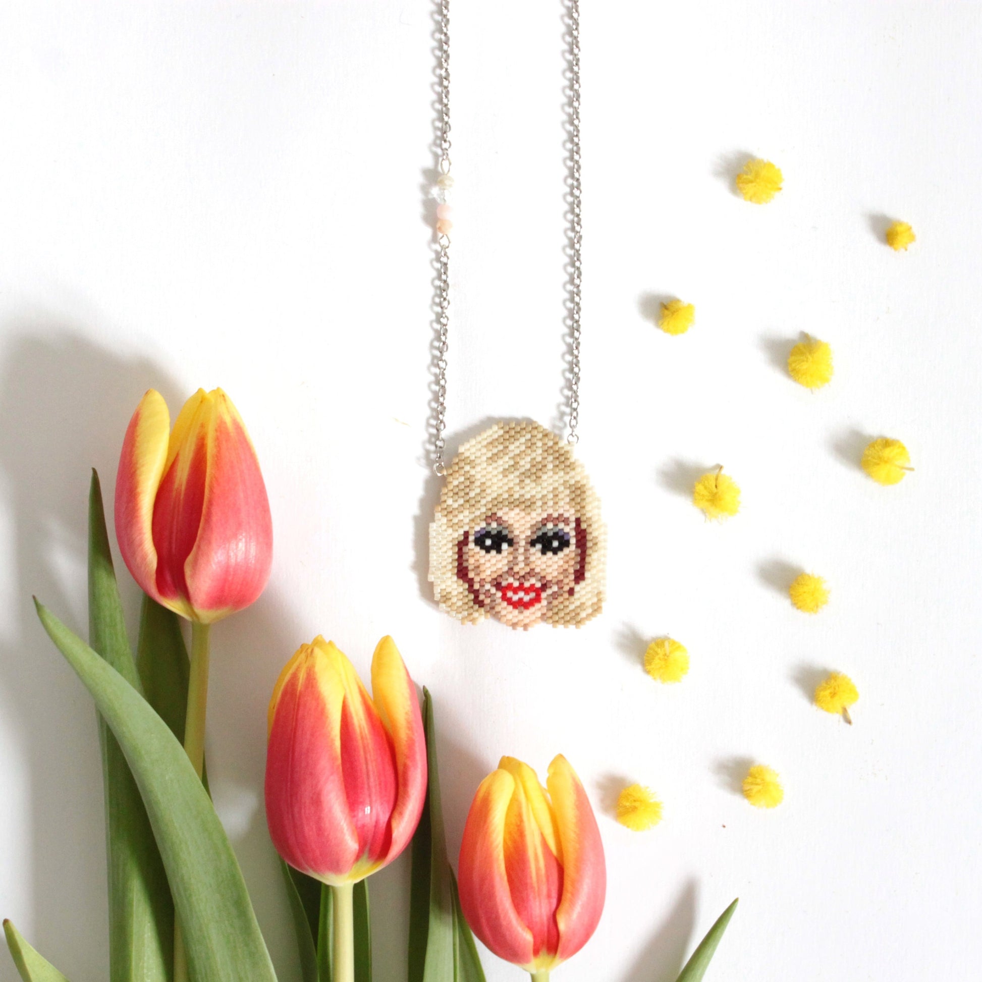 Ciondolo raffigurante l'iconica Raffaella Carrà, realizzato in tessitura di perline giapponesi delica Miyuki.