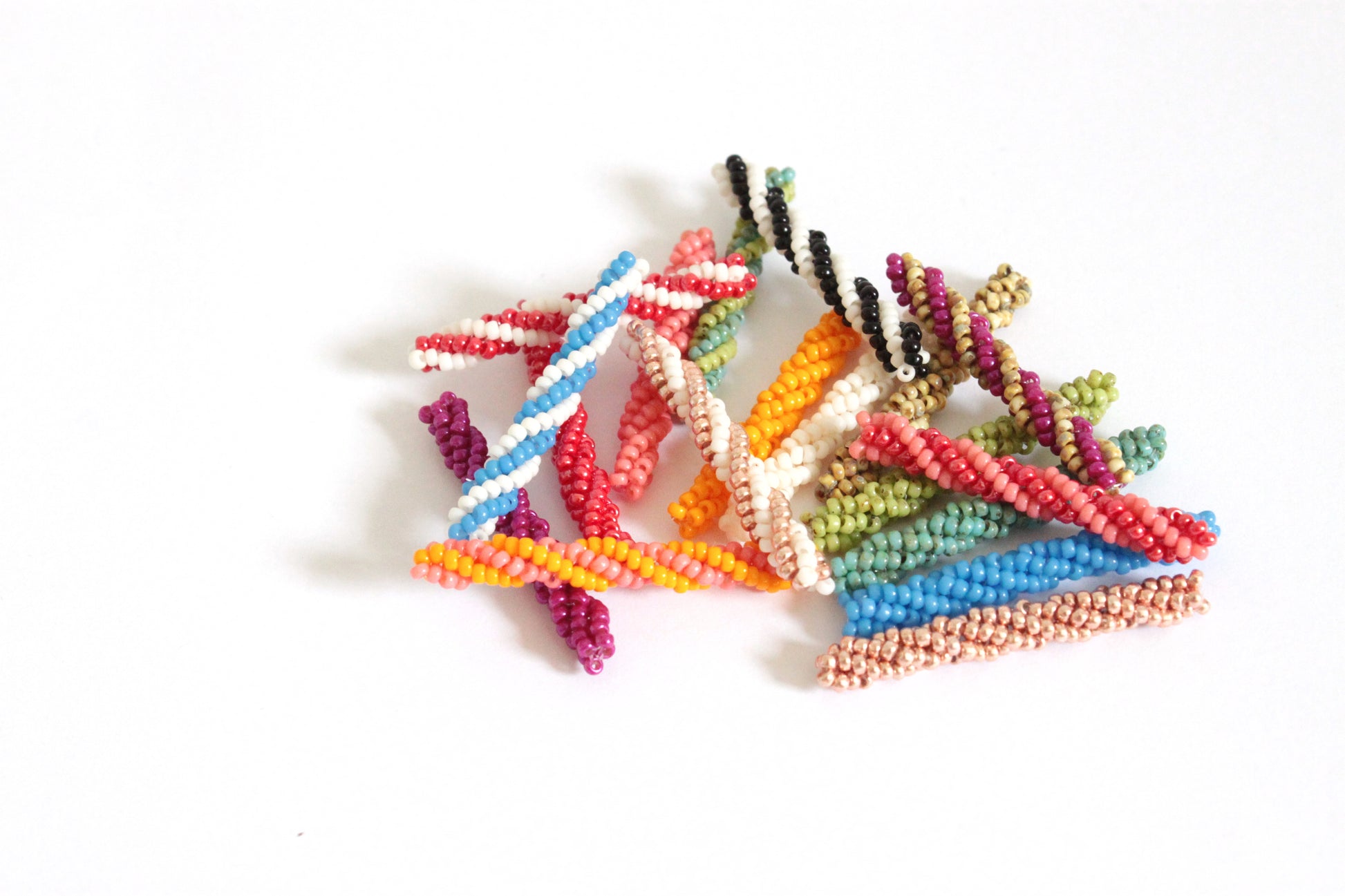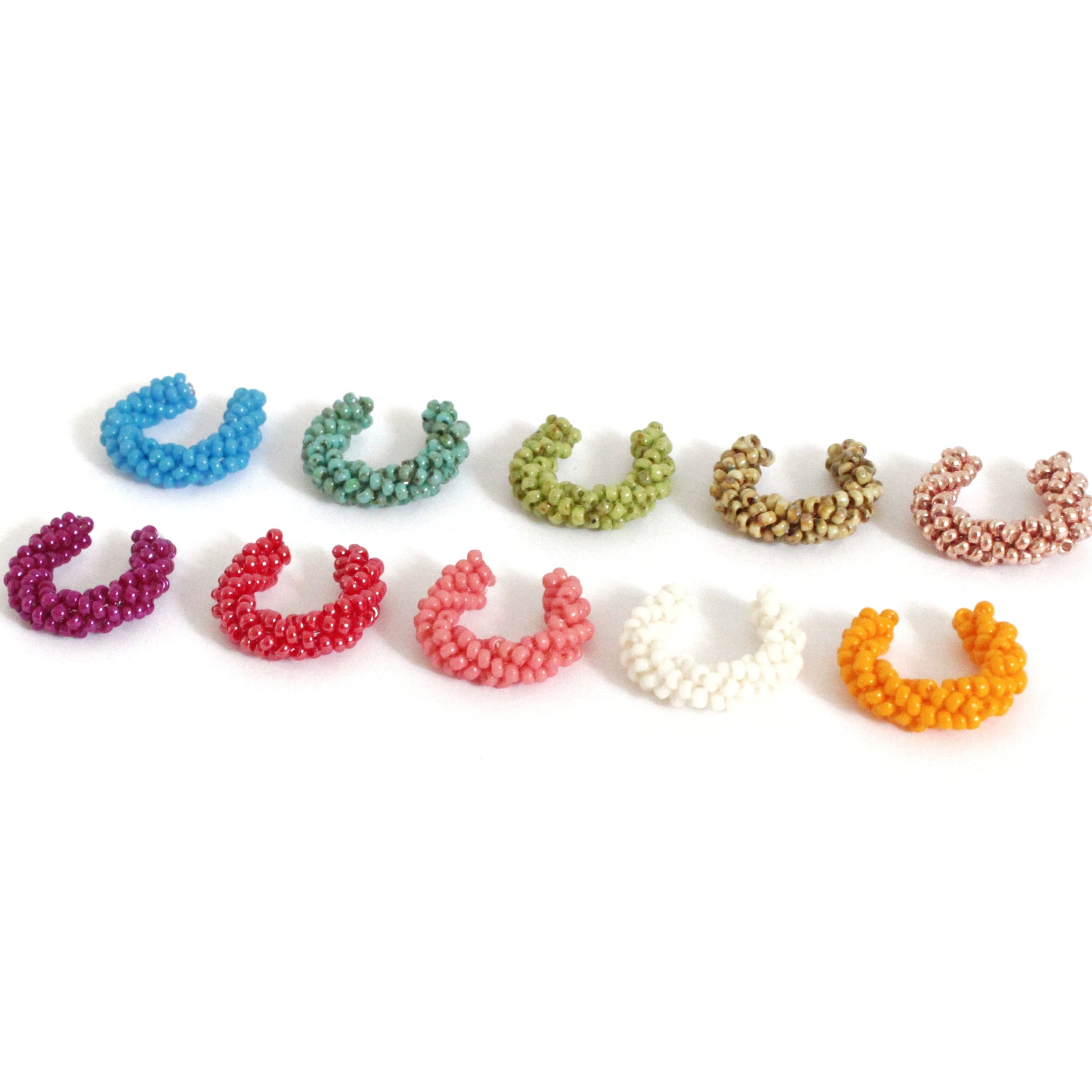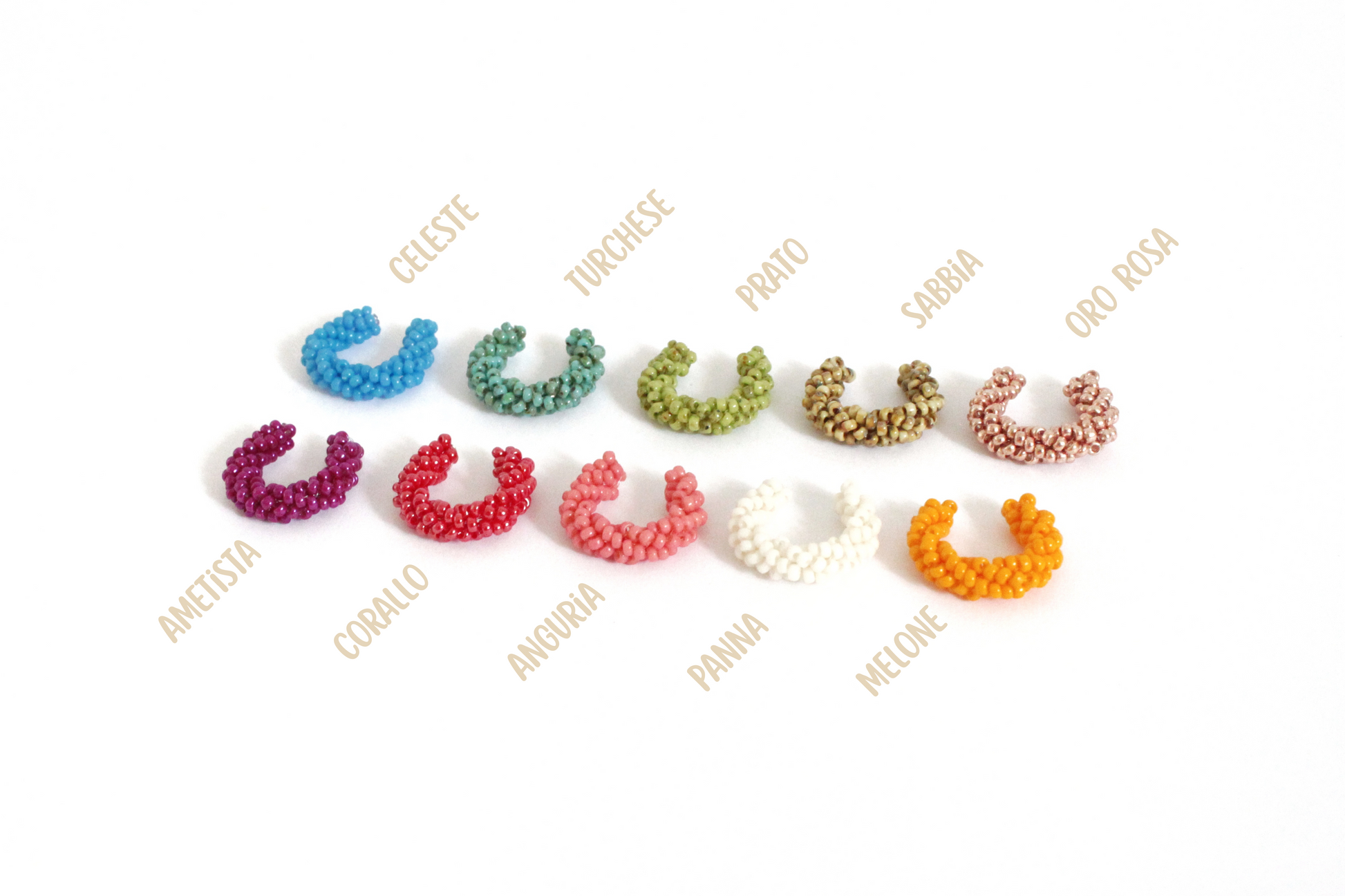 Piccole spirali realizzate in tessitura di perline Miyuki giapponesi in tinta unita, filo trasparente e inserto in metallo nikel free per dargli forma e sostegno.