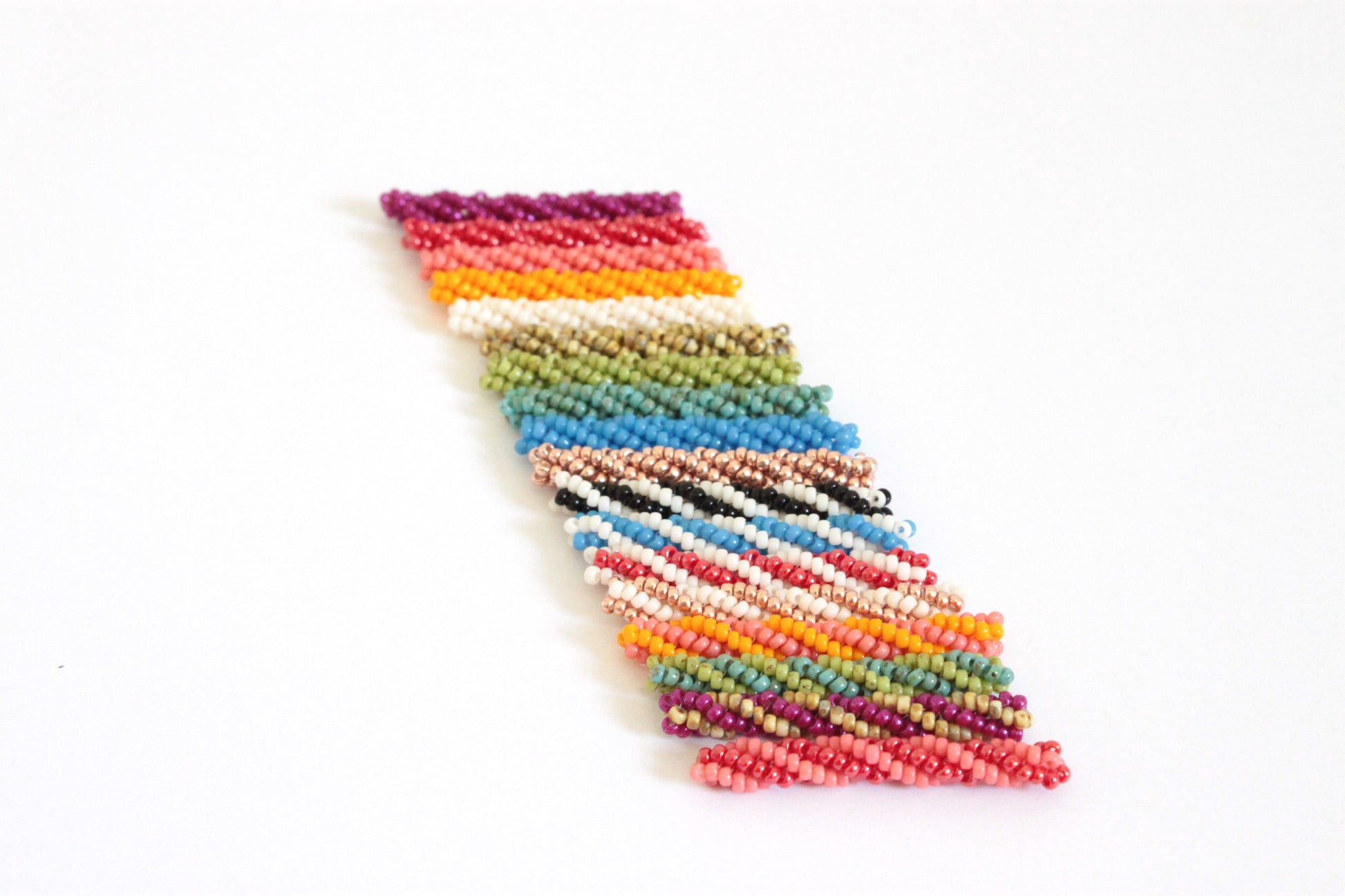 Prodotto realizzato in tessitura di perline di vetro, pertanto necessita di attenzione e cura. Evitare contatto con acqua e profumi, è consigliabile non indossarlo per dormire e riporlo in un luogo asciutto lontano da luce e polvere.