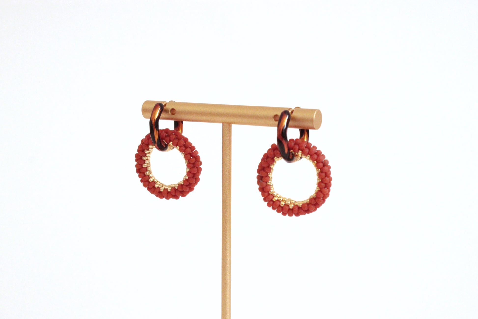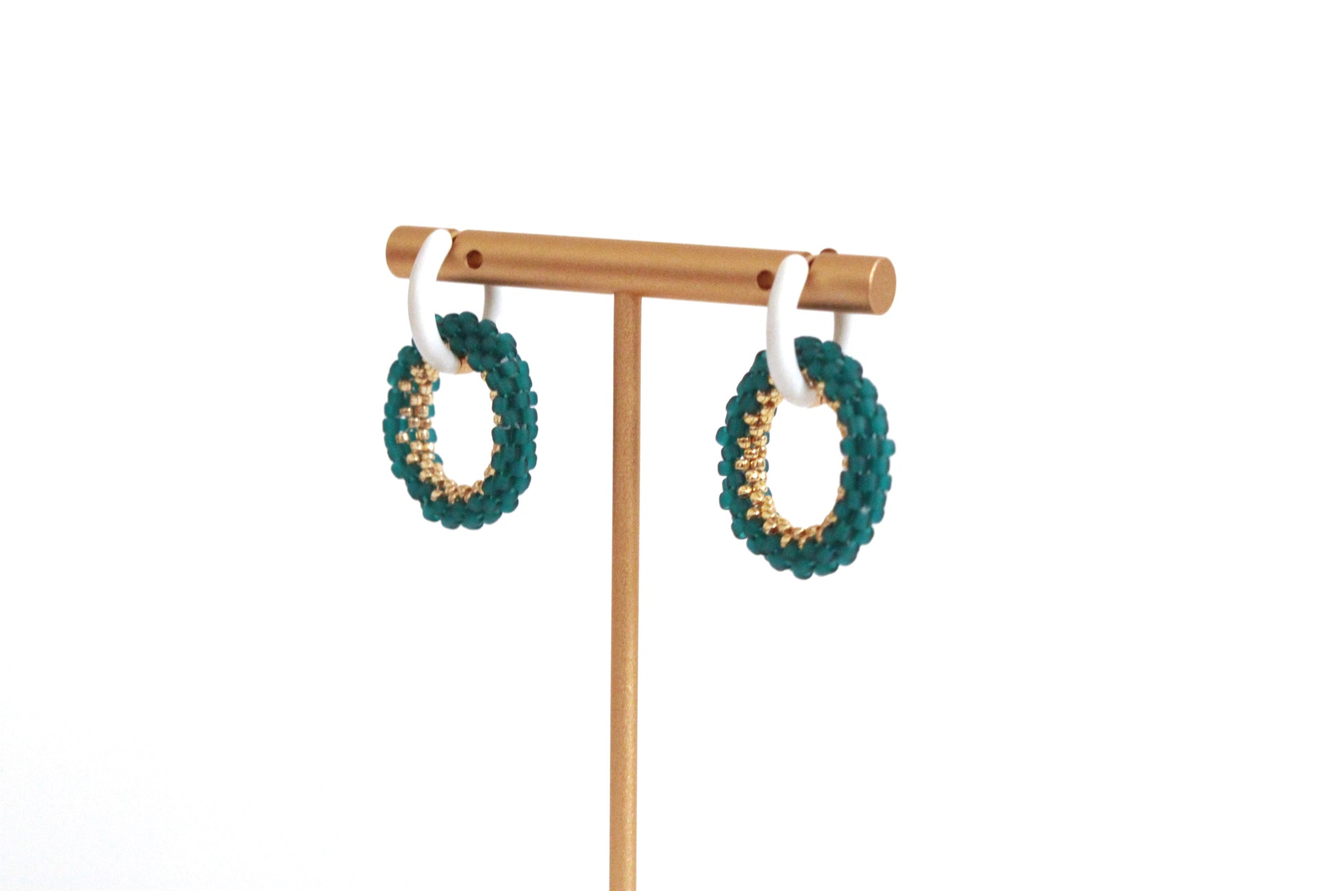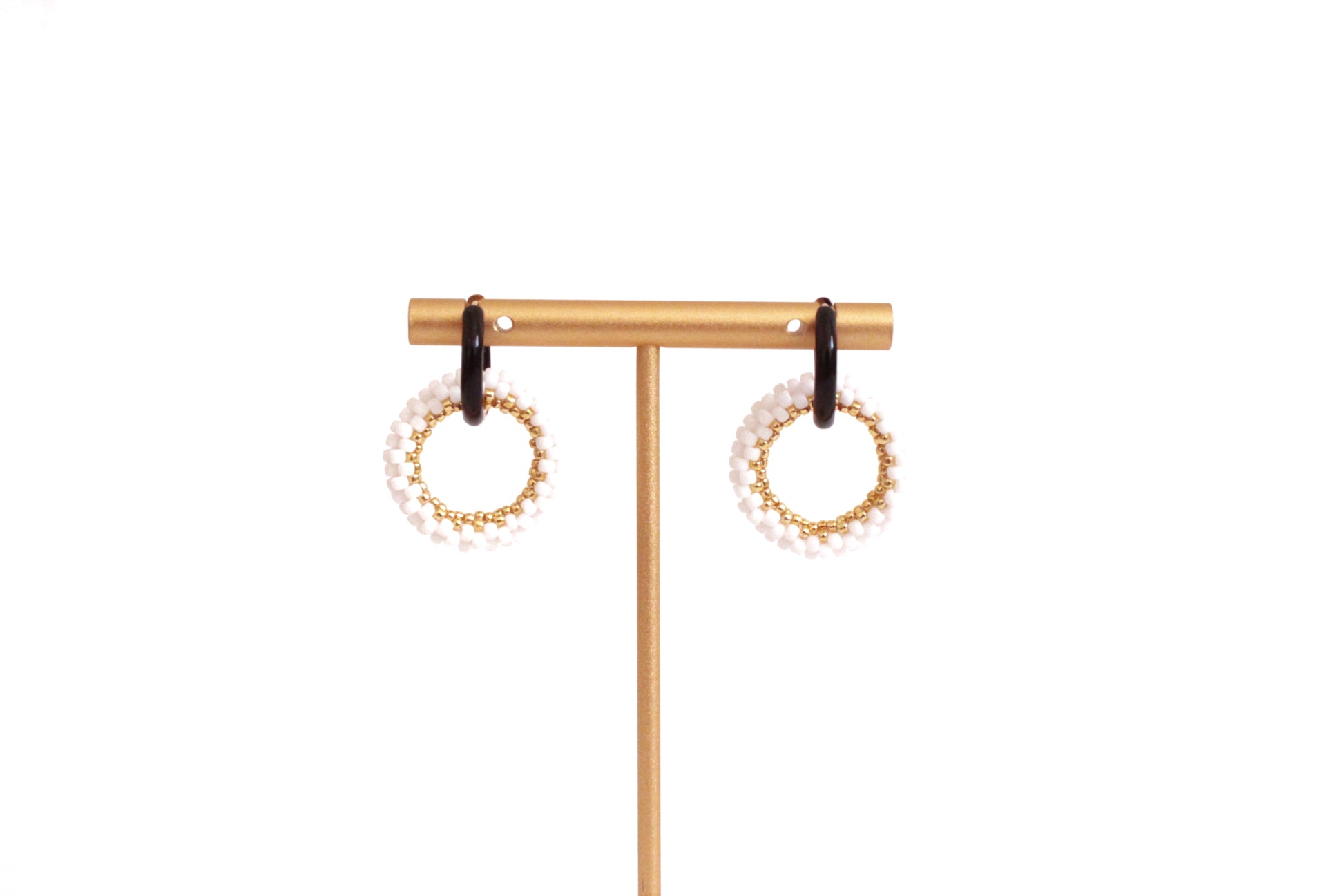 Orecchini realizzati con cerchietti tondi in metallo e resina epossidica da 17mm, intrecciati a cerchi tridimensionali da 25mm in tessitura di perline giapponesi opache.
