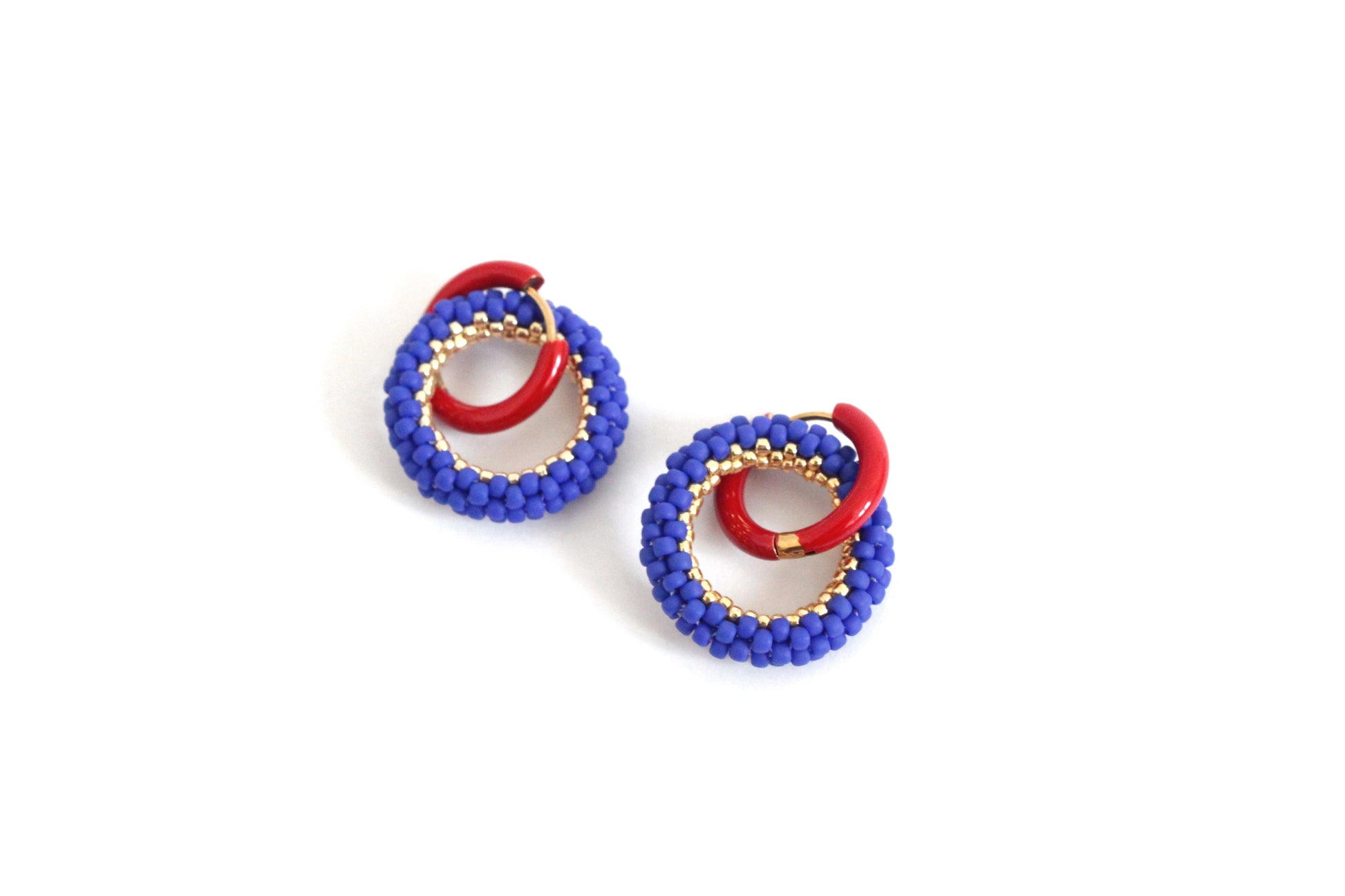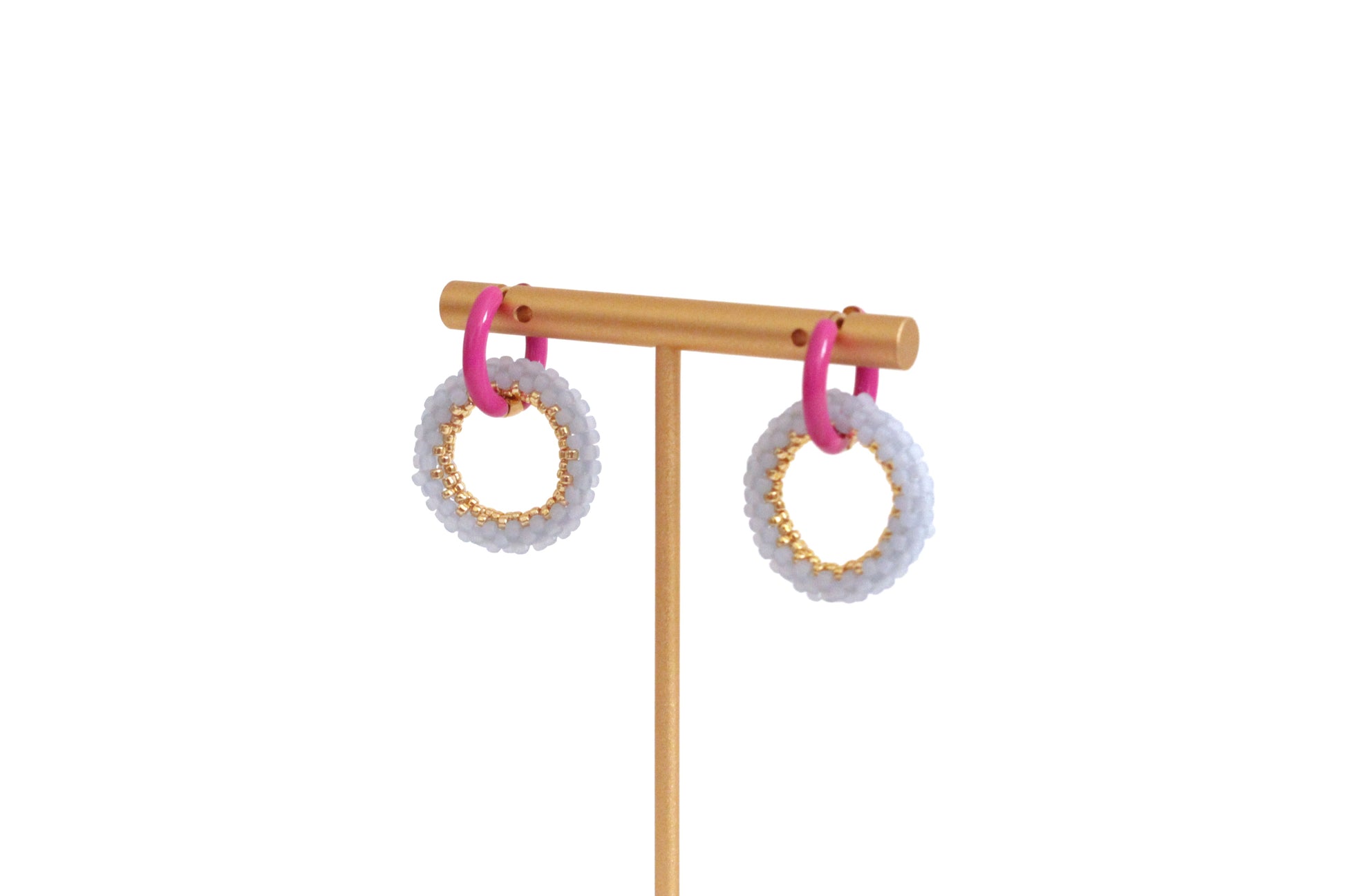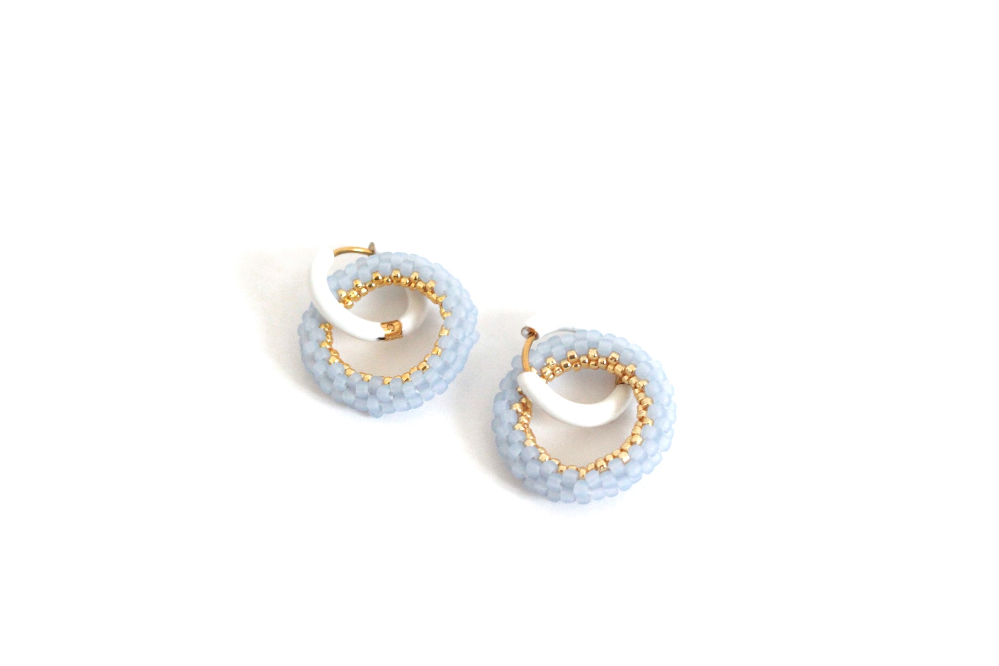 Orecchini realizzati con cerchietti tondi in metallo e resina epossidica da 17mm, intrecciati a cerchi tridimensionali da 25mm in tessitura di perline giapponesi opache.