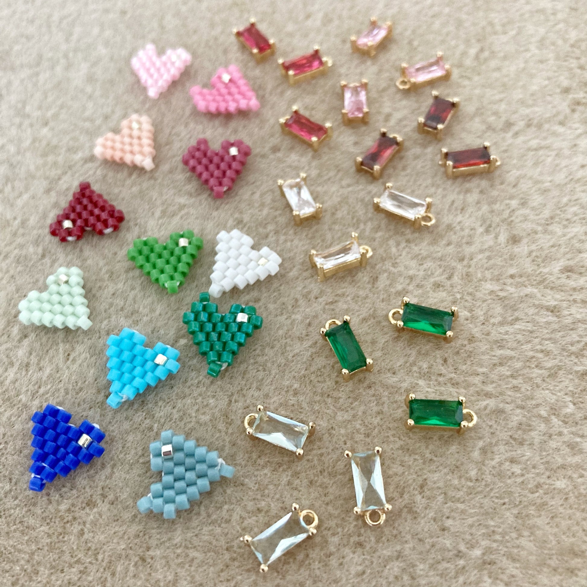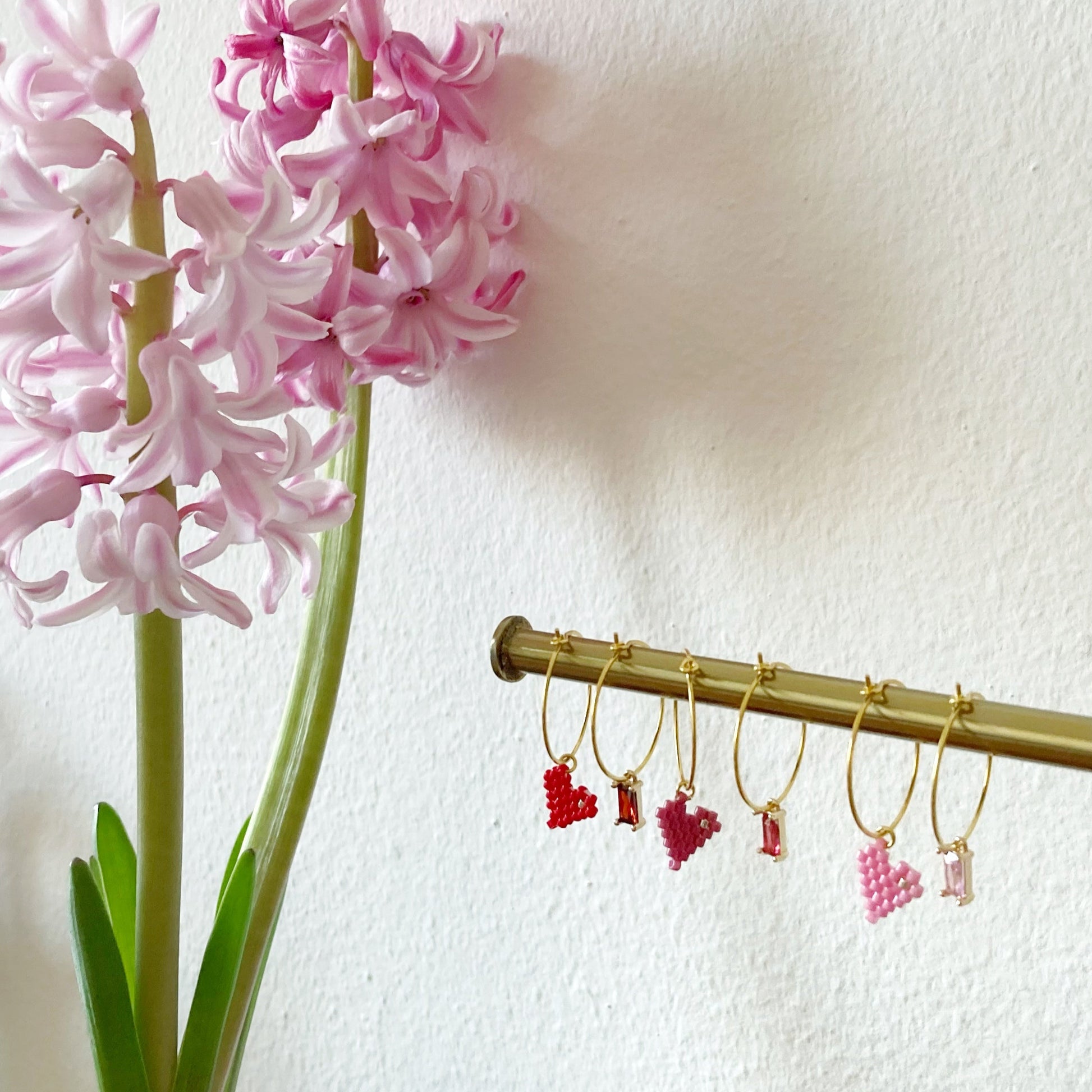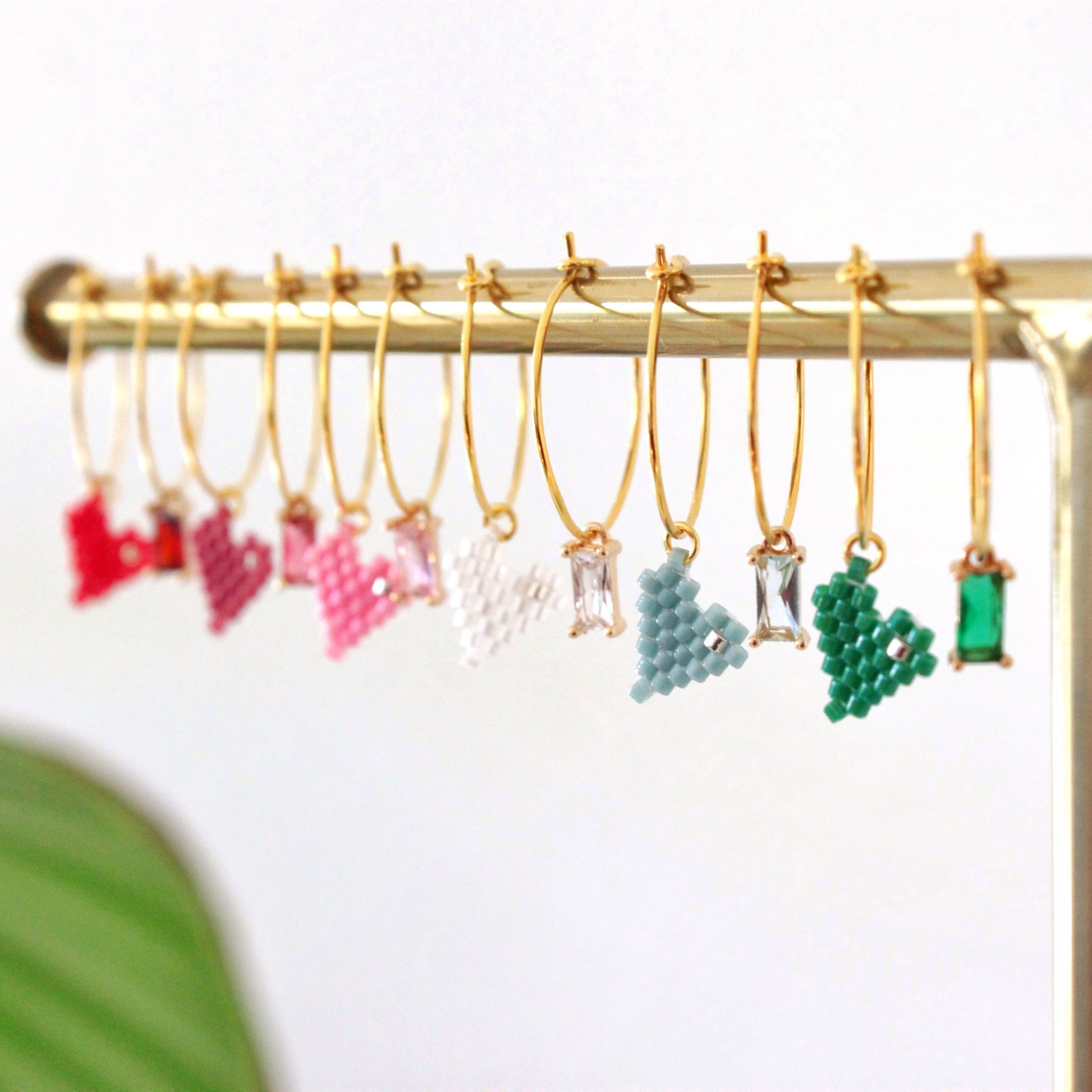 Orecchini realizzati con cerchietti bagnati oro 24K, e decorazioni in tessitura di perline a forma di cuoricino. Indossati in modo asimmetrico con cristallino nella stessa tonalità.
