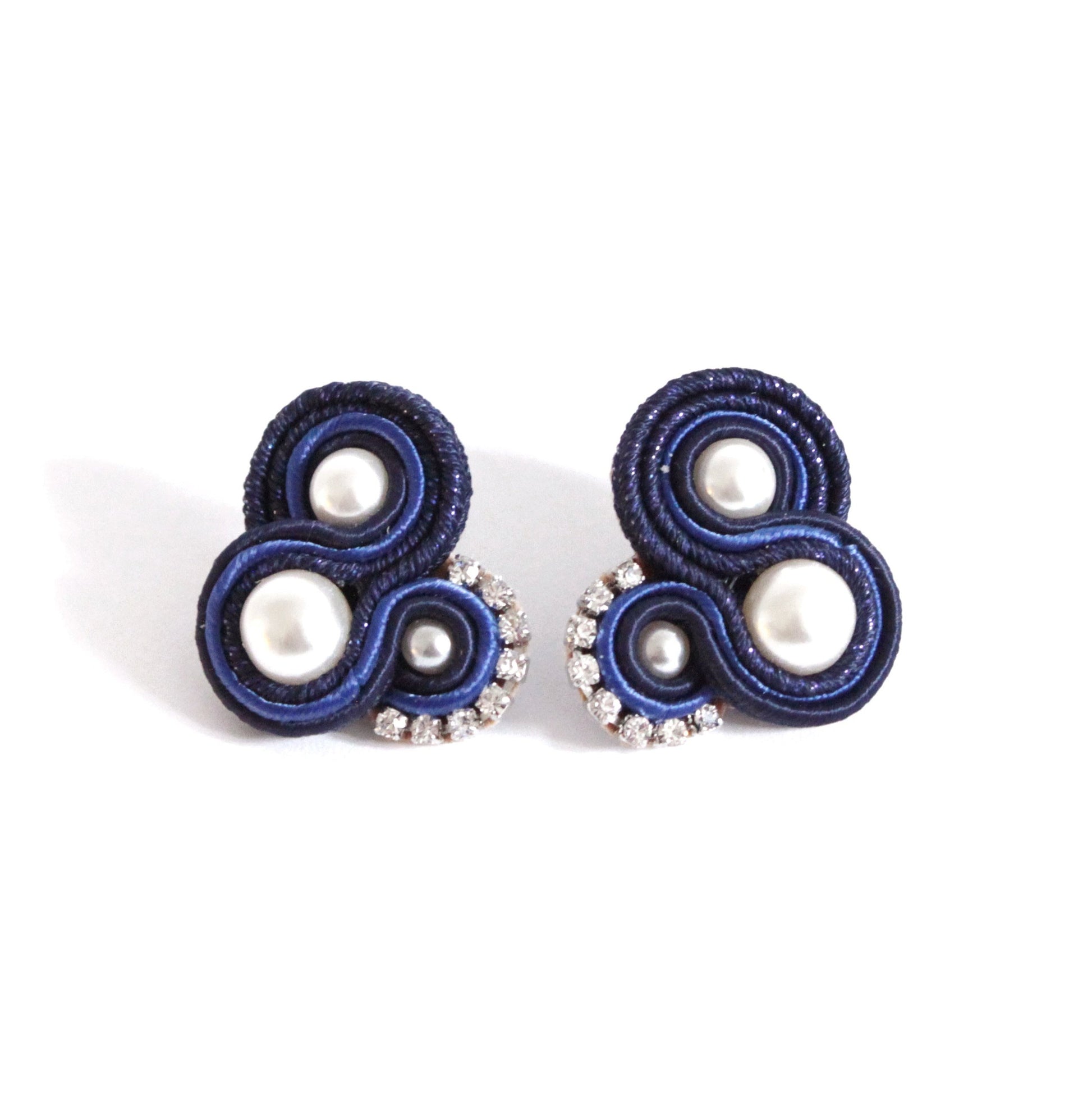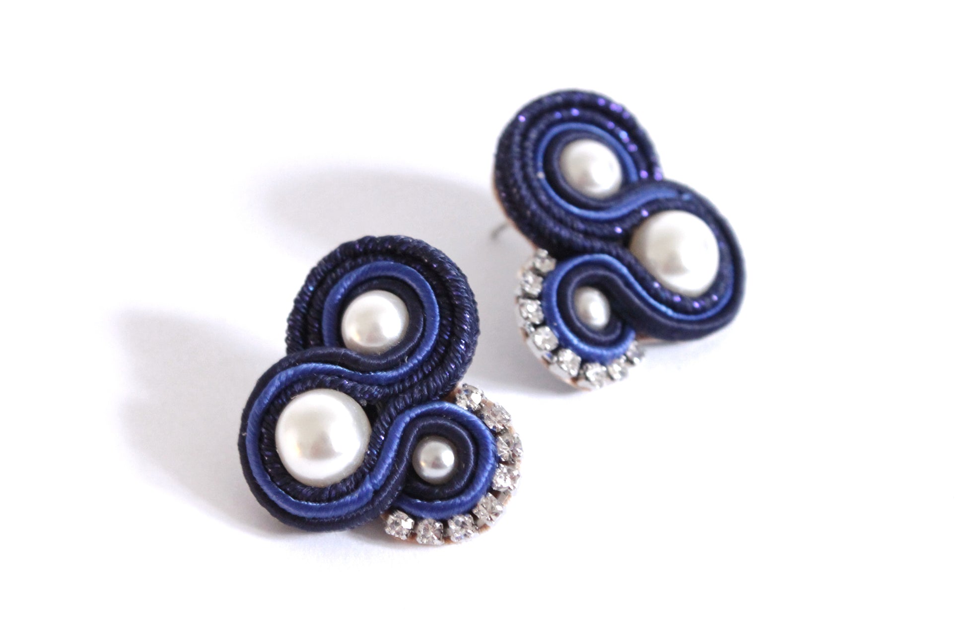 Orecchini realizzati in tecnica soutache, con piattine di seta nelle sfumature del blu notte con pagliuzze violacee, perle di vetro e catena strass Swarovski.