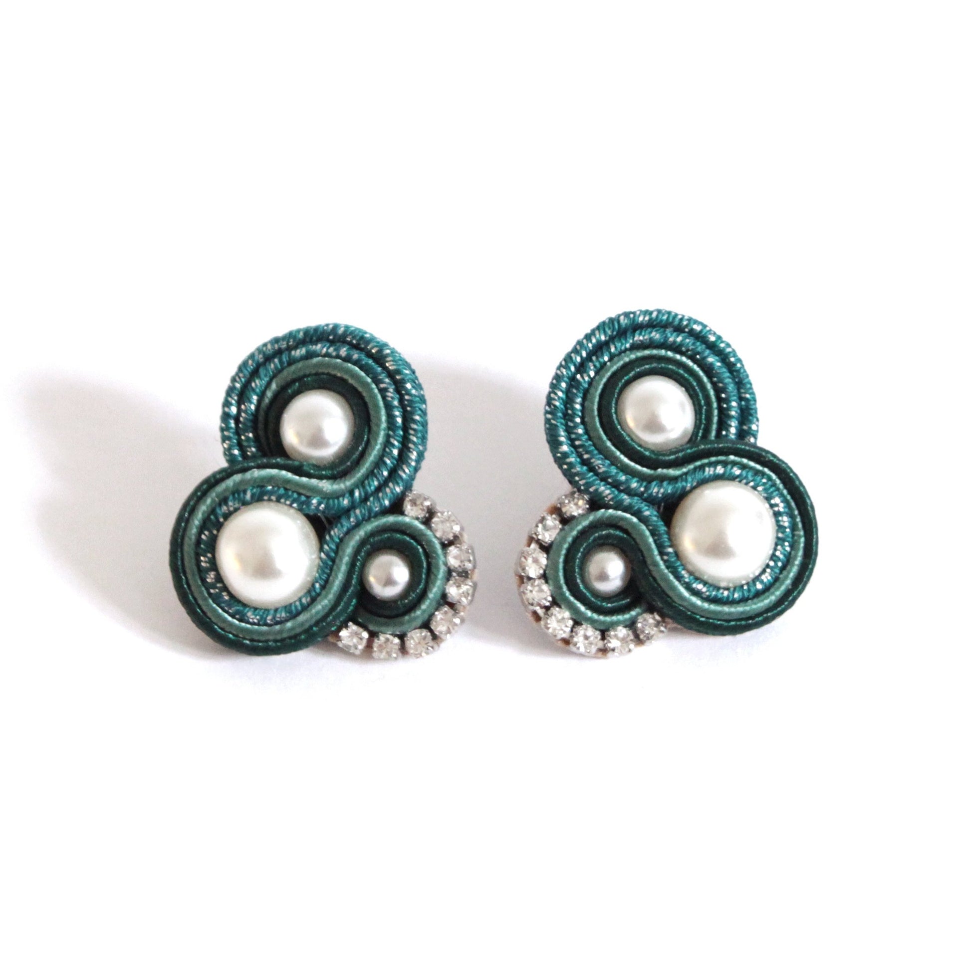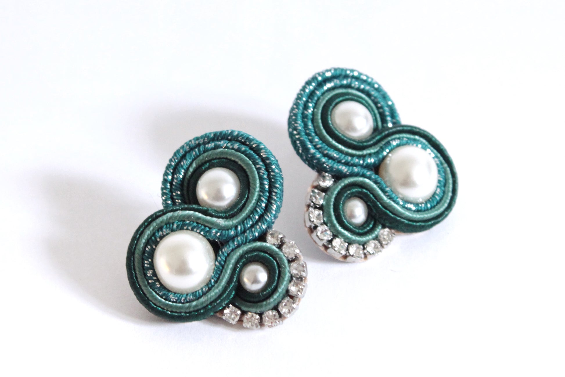 Orecchini realizzati in tecnica soutache, con piattine di seta nelle sfumature del verde smeraldo con pagliuzze argentate, perle di vetro e catena strass Swarovski.
